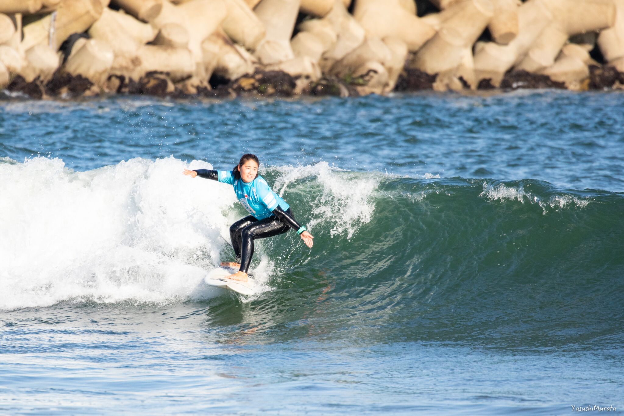 JPSA初優勝を決めた美人プロサーファー宮坂麻衣子。仙台新港のグーフィーの波をフロントサイドで華麗に切り刻み、トッププロサーファーとしての実力を証明してみせた。来シーズンのさらなる飛躍と活躍に期待!おめでとう!!Maiko Miyasaka.