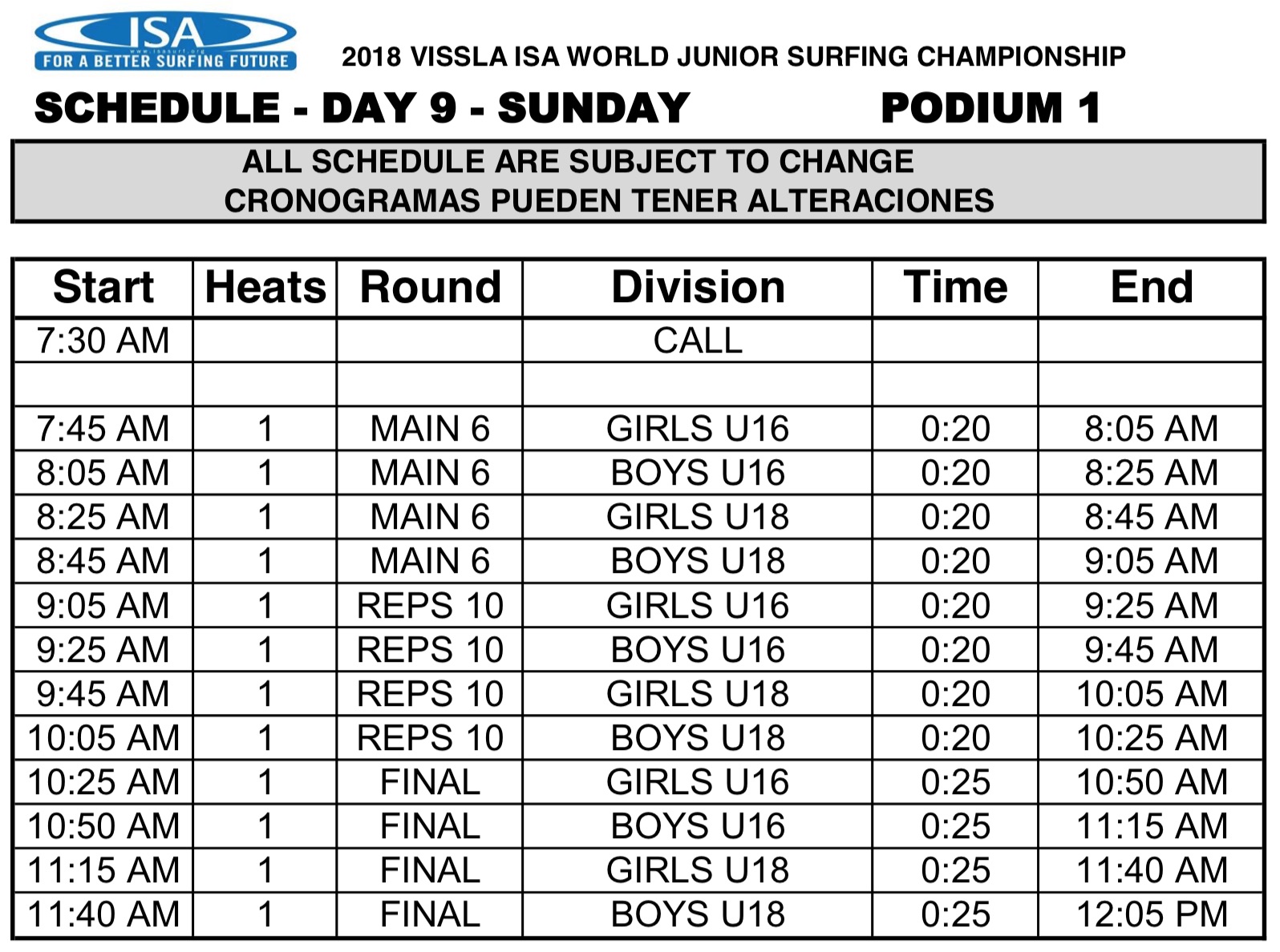 下に掲載させて頂いたISAオフィシャルから届けれた大会最終日のスケジュールをご参照の上、LIVEの方もをお見逃しなく!!