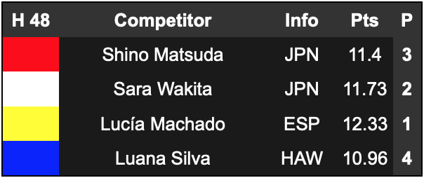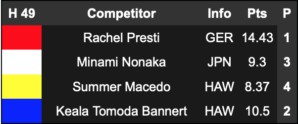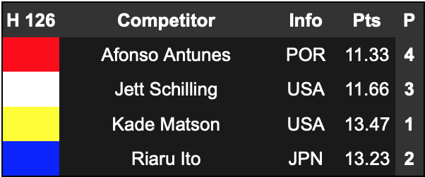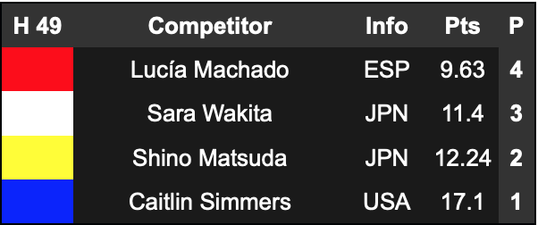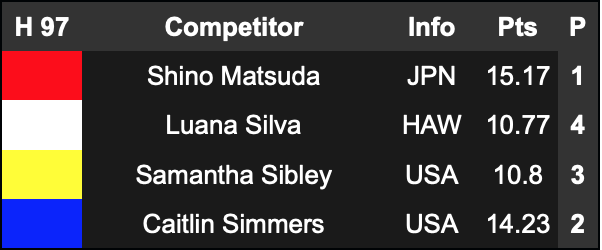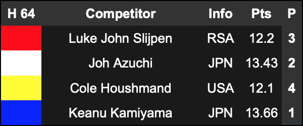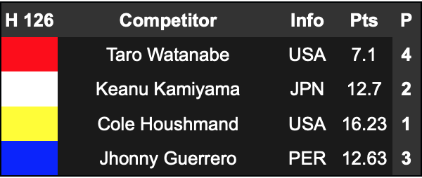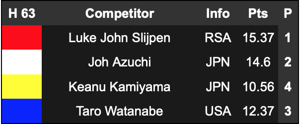 Levi SlawsonとKade Matsonといった2名のアメリカ代表選手に加え、金メダルを獲得することとなったオーストラリア代表のGrayson Hinrichsを相手にさらなる快進撃が期待された中、ここではいい波をつかむことができず4位で今大会をフィニッシュとなった。