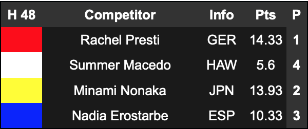 ここではハワイ代表選手のどちらかが強敵となるかと思われたが、まさにダークホース、ドイツ代表のRachel Prestiがダントツのサーフィンを魅せ、野中美波は銅メダル獲得で今大会を終えた。