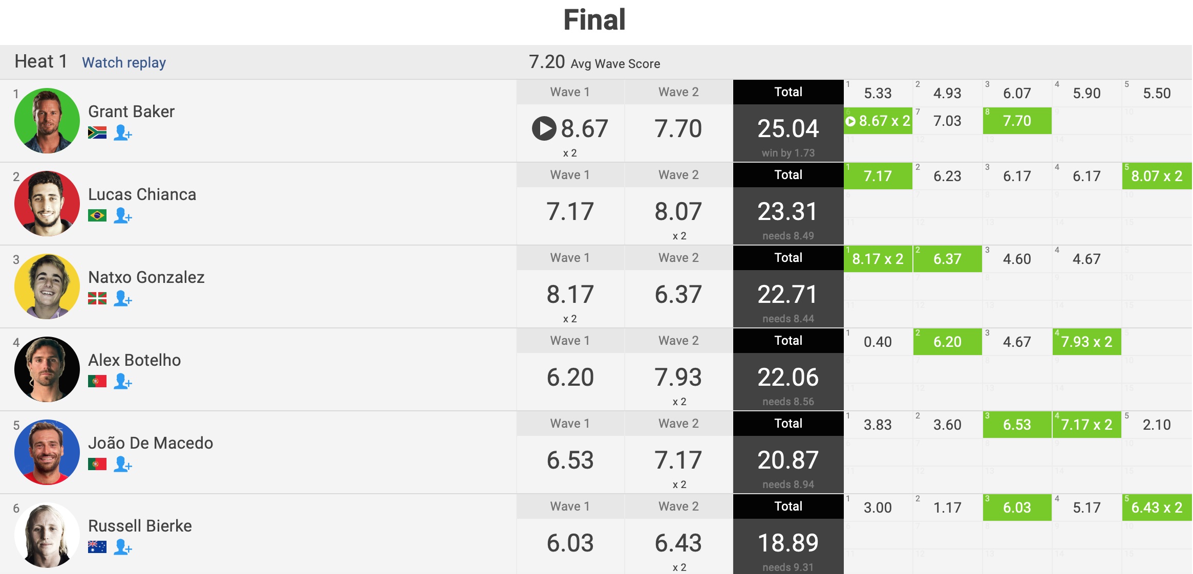 「信じられません、夢のようです。」Grant Bakerは言った。「みんな本当にハードにチャージした中で、自分が勝てたことが信じられません。あの8.67ptの波は、ずっと狙って待っていた波でした。それが目の前に入ってきて、最終的にはスーパーレイト・テイクオフになりましたが、本当にクレイジーなビッグセクションでした。パーフェクト・ナザレでパーフェクト・デイ、本当に最高な1日です。Lucasはもちろん、セミファイナルであの狂った巨大バレルをメイクしたNatxo Gonzalezにも勝つことができたなんて、本当に今回ラッキーでした。」