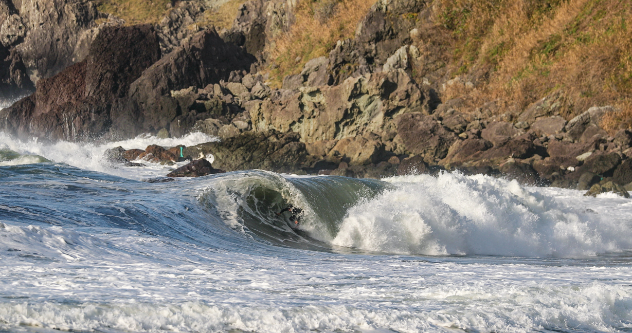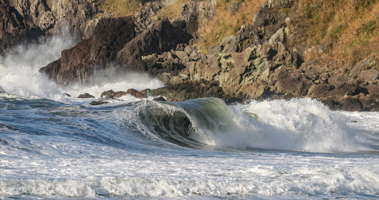 そのセッションの中よりエピックな1本となった松岡慧斗による、ジャンクな頭半オーバーのオンショア・コンディションで数少ない良い波を見極めて抜けてきたフロントサイド・チューブのシークエンスをお届け!!