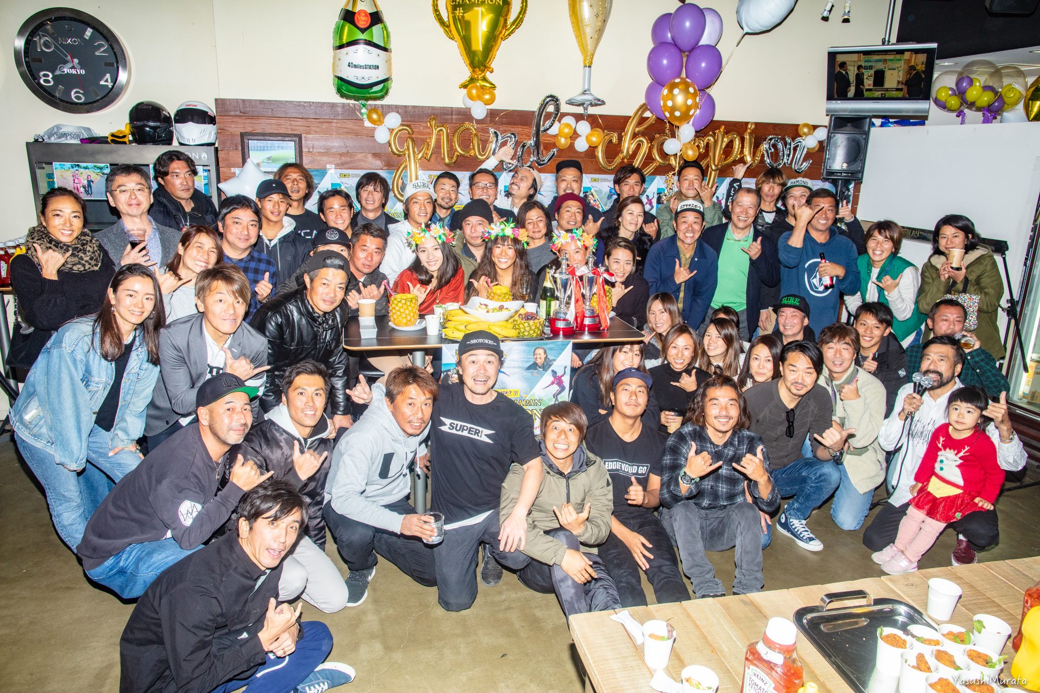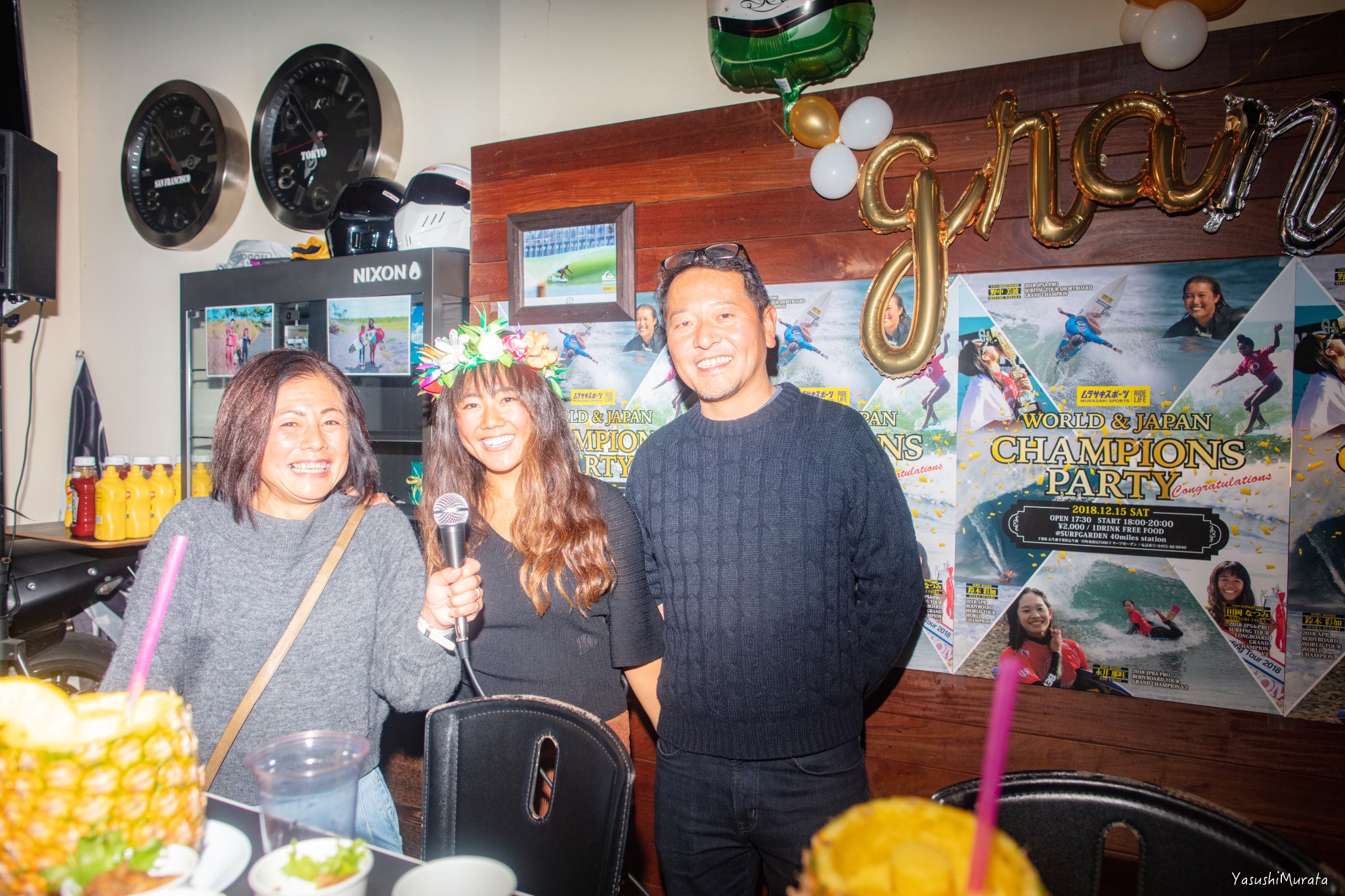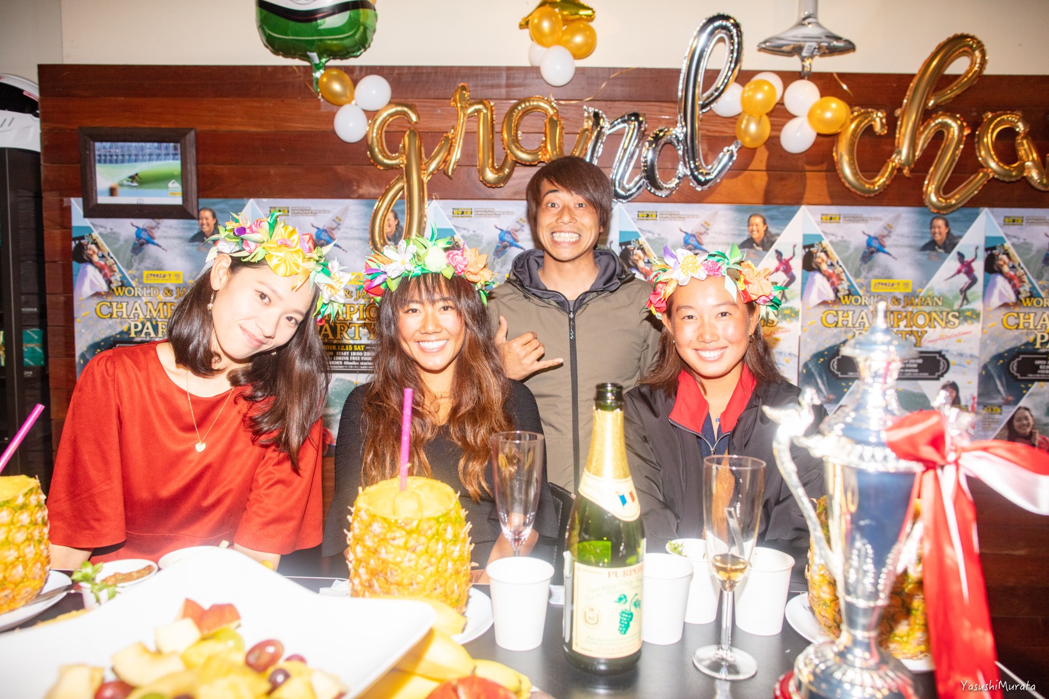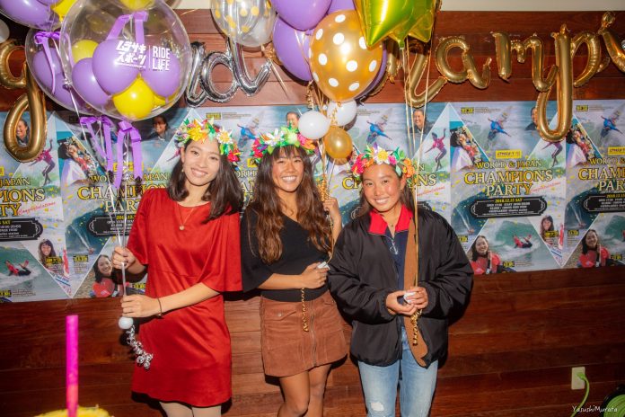 現在ハワイのパイプラインで開催中となっているCT最終戦”BILLABONG PIPE MASTERS”の日本語放送で実況を担当していることから、日本人初となる2018年APBワールドチャンピオンという歴史に残る快挙を成し遂げた鈴木彩加は欠席となった中、彼女たちを祝福するべく多くの人々が駆けつけたそのビッグパーティーの模様を、yasushi photosギャラリーとしてここにお届け!!