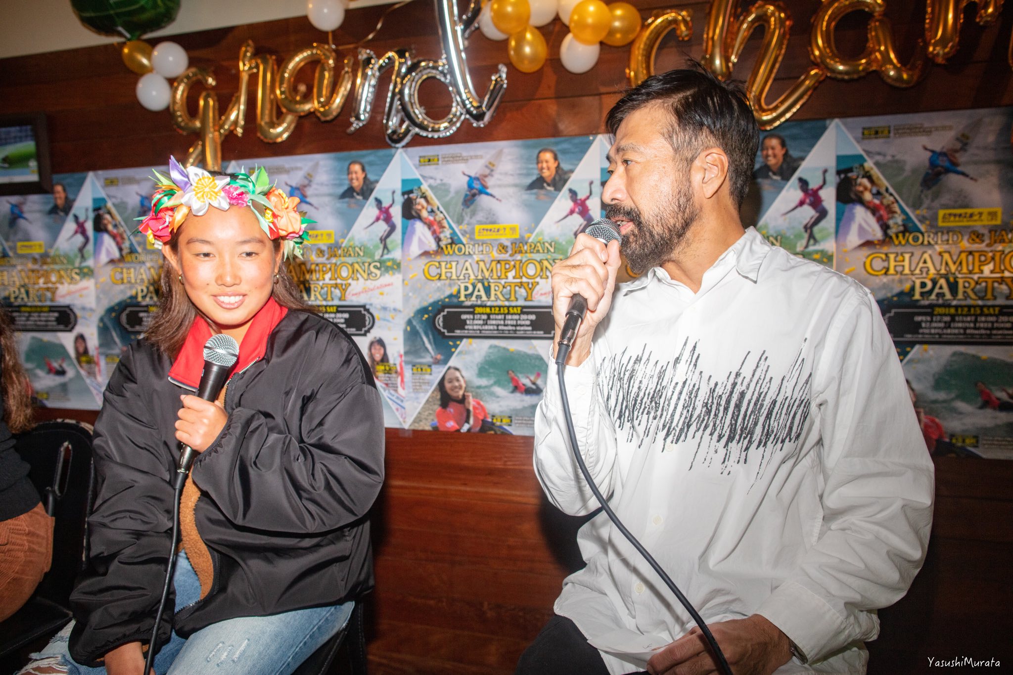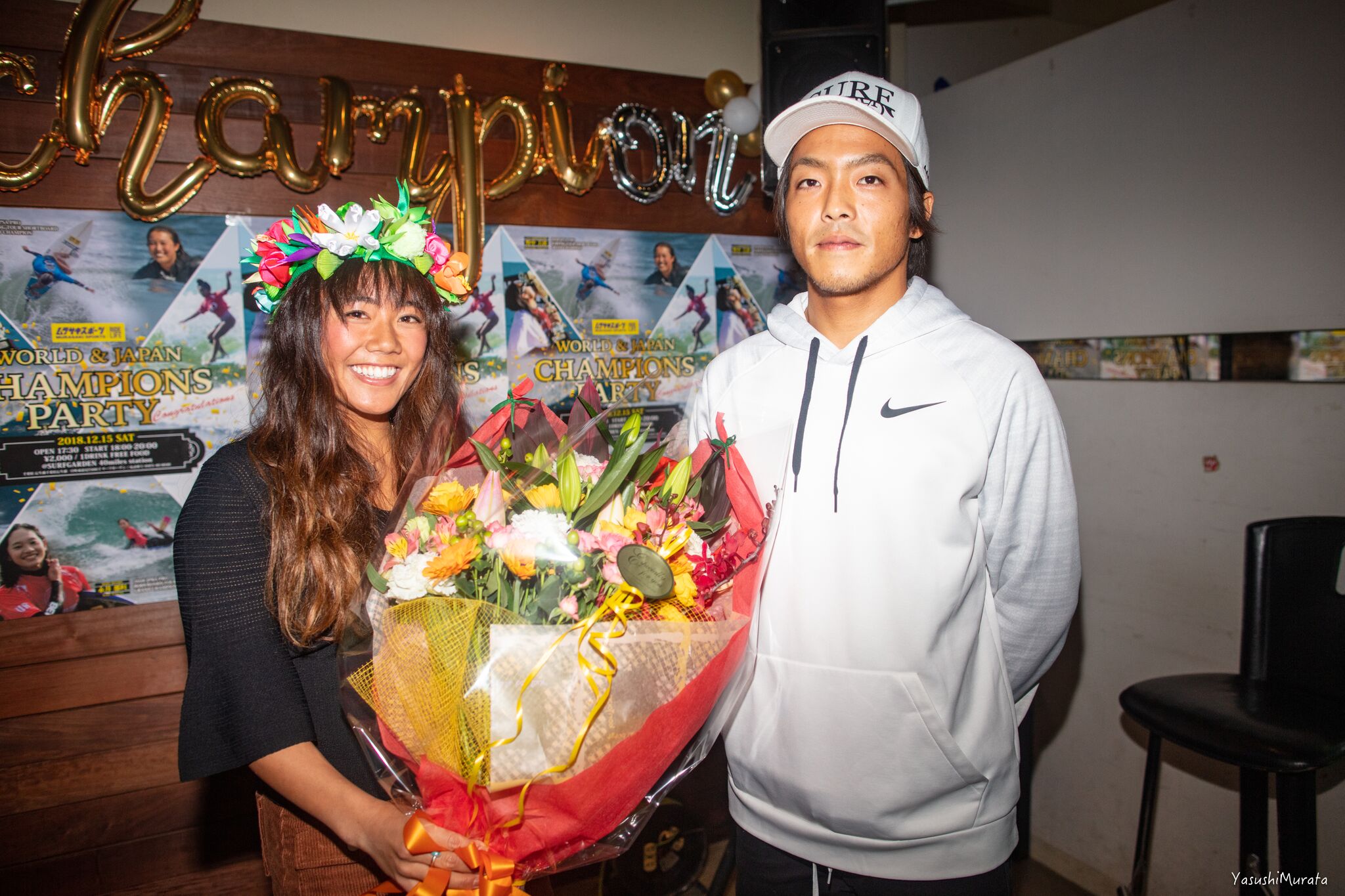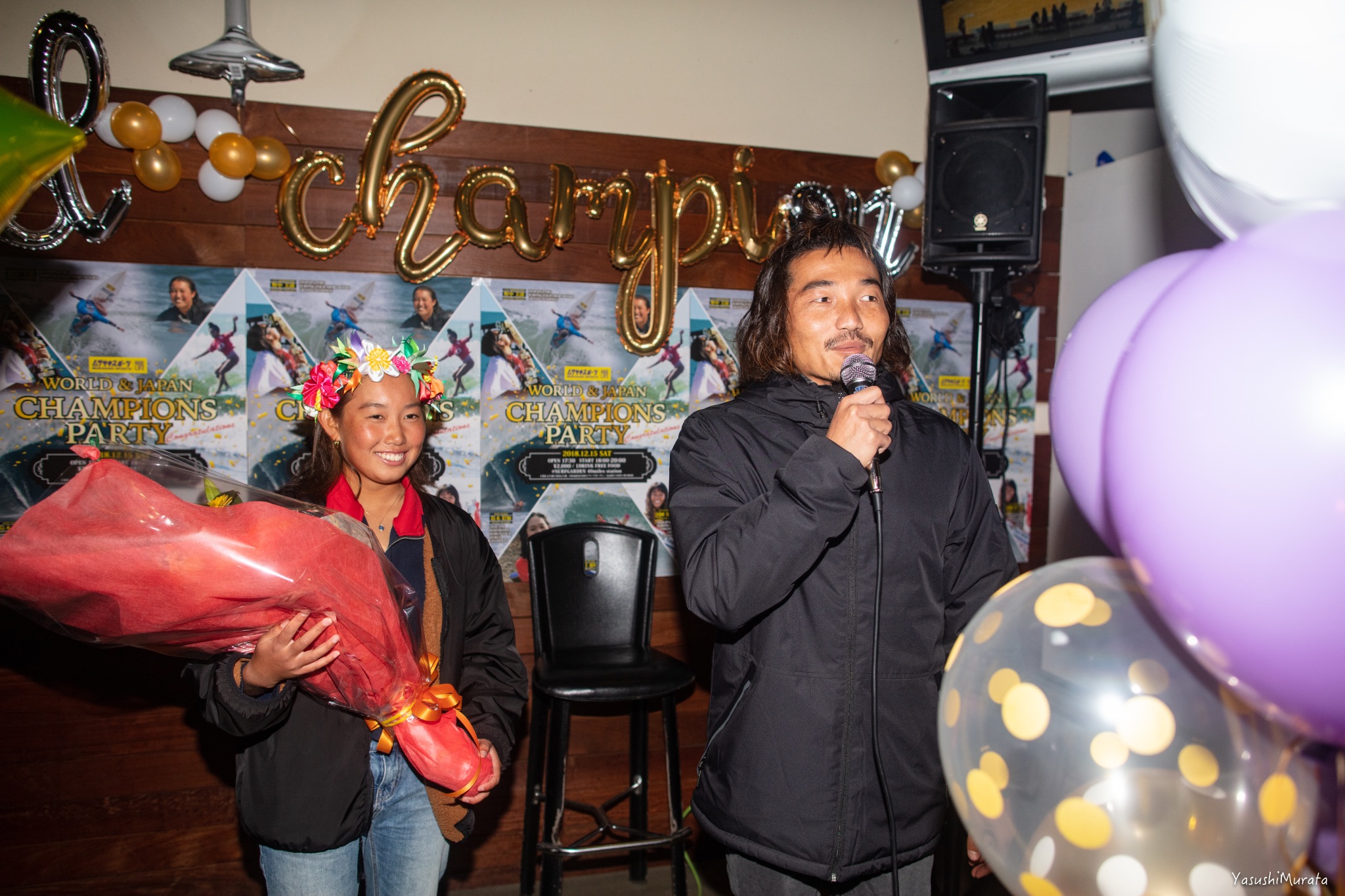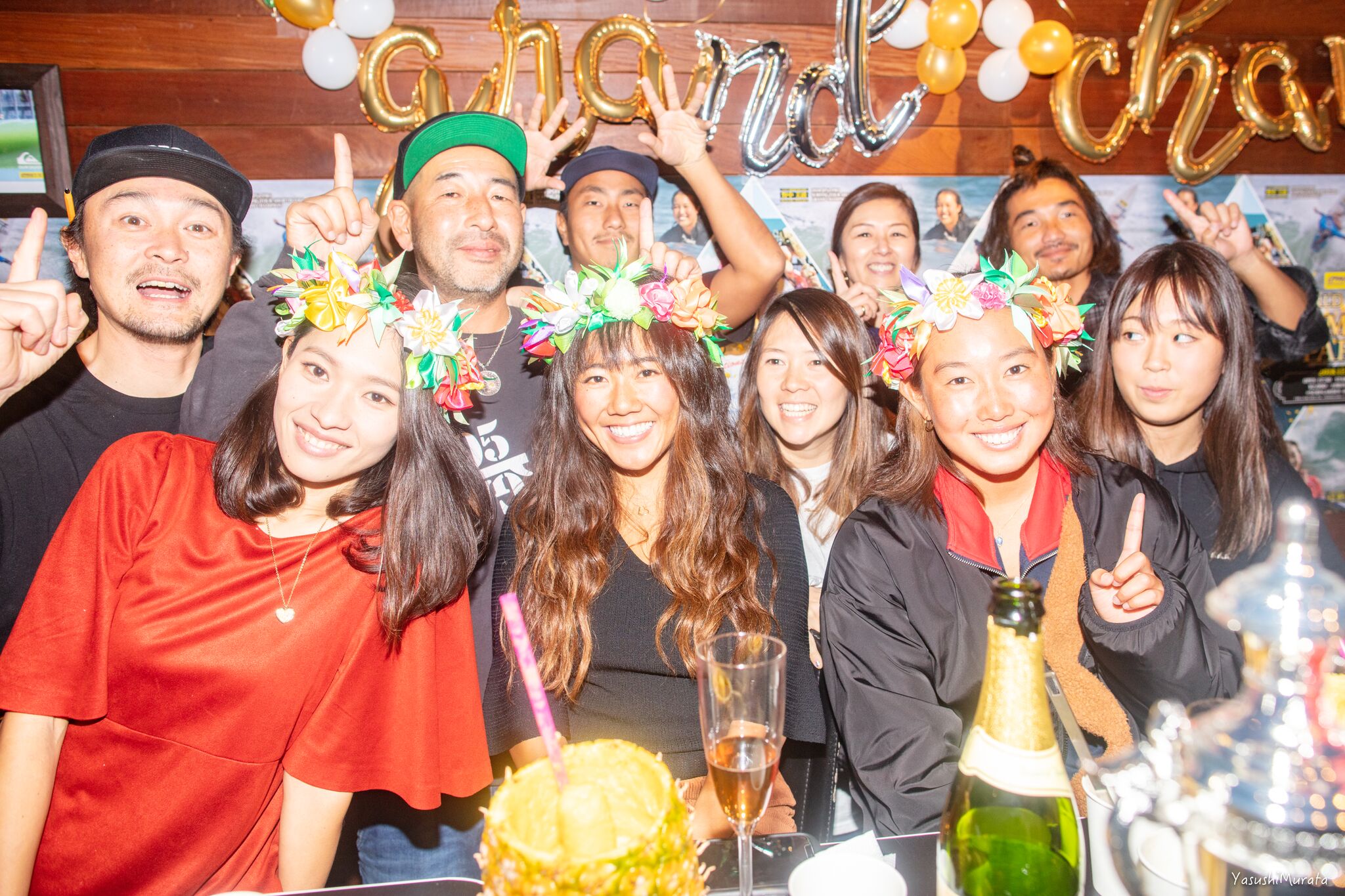 現在ハワイのパイプラインで開催中となっているCT最終戦”BILLABONG PIPE MASTERS”の日本語放送で実況を担当していることから、日本人初となる2018年APBワールドチャンピオンという歴史に残る快挙を成し遂げた鈴木彩加は欠席となった中、彼女たちを祝福するべく多くの人々が駆けつけたそのビッグパーティーの模様を、yasushi photosギャラリーとしてここにお届け!!