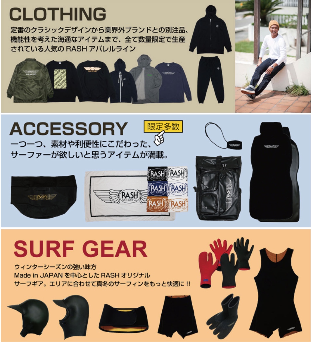 オンラインストア内では既製サイズのウエットスーツをはじめ、アウトレット商品のほかすべてが数量限定からなる業界外ブランドとのスペシャル・コラボ別注品を含めたアパレル、さらにはヘッドキャップやブーツ、グローブなどのサーフギアほか、アクセサリーなど、RASHオリジナル・アイテムがラインナップ!