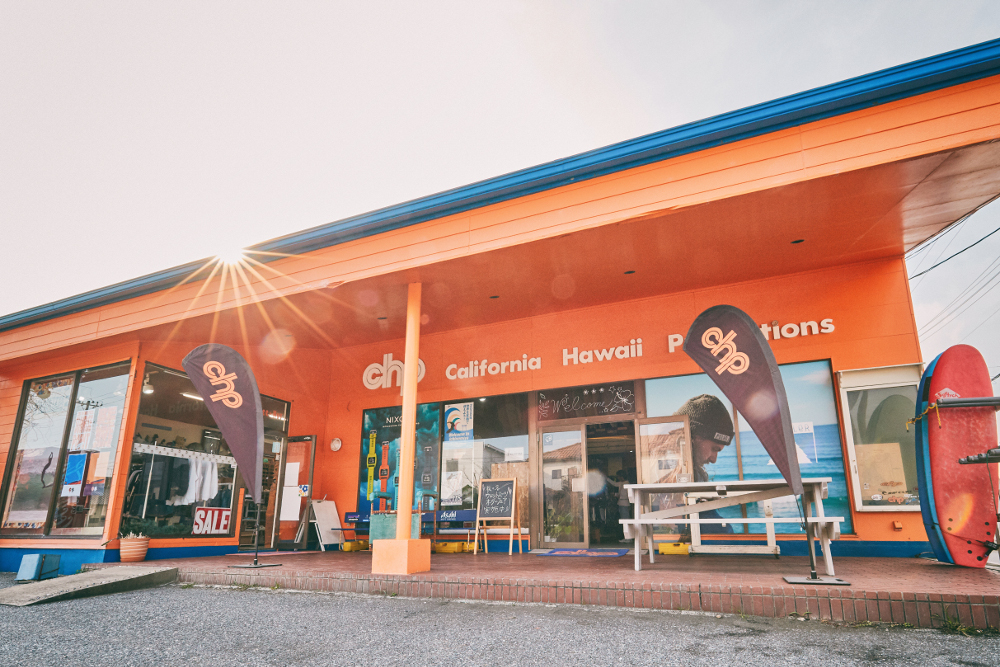 365日オープンしている、明るいオレンジ色のメインショールームは、一宮の海岸通り沿い、サンライズポイントの目の前にある。メーカーであるCHPのこだわりは、何と言ってもサーフボード。その品揃えは圧巻だ。岡野功、中村大輔がシェイプする「CHPサーフボード」、レジェンダリーシェイパーである山崎市朗によるトランジション、ロングボードラインの「サンウェイブ」。海外ブランドではワールドチャンピオンのガブリエル・メディナが乗っていたことで知られるスペインの「プーカスサーフボード」、テーラー・ノックスがライダーを務める「ボーストデザイン」など、最先端のショートボードからファンなボードまで、ニーズに合わせて幅広いラインナップを誇る。広い店内にはサーフアクセサリー、最新のサーフウェアも充実している。また、岡野教彦、河野正和、吉川共久らが講師のサーフレッスンは、目指すスタイル、レベルに合わせて丁寧に教えてくれると大好評。道具がなくても、ひとりでも対応してもらえるので、気軽に相談してみよう。