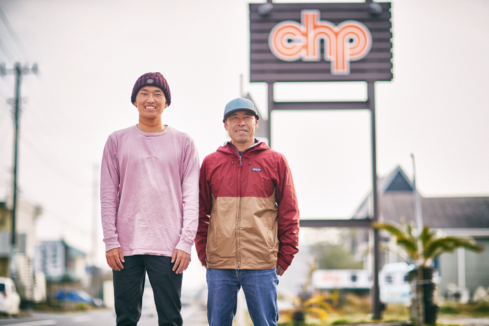 ズッチョさんと、CHP&ビラボンライダーである長男の留偉さん。この日は居合わせられなかったが、次男の偉央さんももちろんサーファー。CHPは世代を超えて、サーフィンを楽しむ人を幅広く応援してくれる。