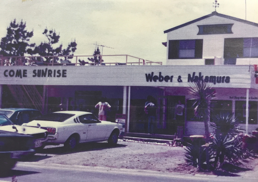 開店当初の一宮店舗。カリフォルニアの名門、デューイ・ウェーバーのシェイパーだったタック・カワハラさんと、中村一巳さんの親密な関係が看板から伺える。隣には地元の方のカフェ、その名もサンライズがあった。 Photo: Courtesy of CHP