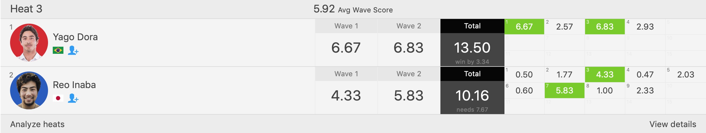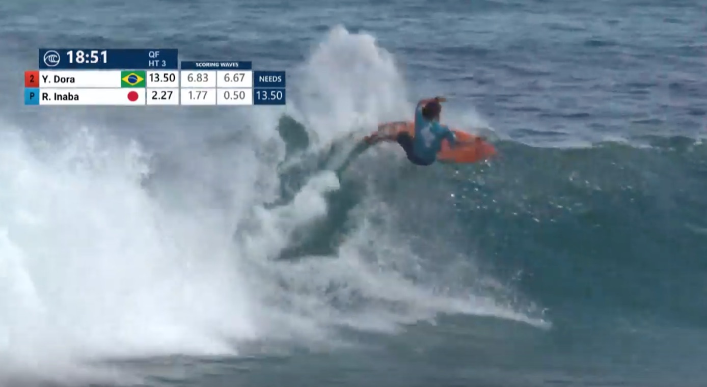 1本目の波から6.67ptのグッドスコアをマークして早くもヒートの流れを掴んだYago Doraに対し、逆転につながる波を探し続け、3本目に4.33pt、7本目には5.83ptとスコアを重ねていった稲葉だったが、惜しくもここで敗退。