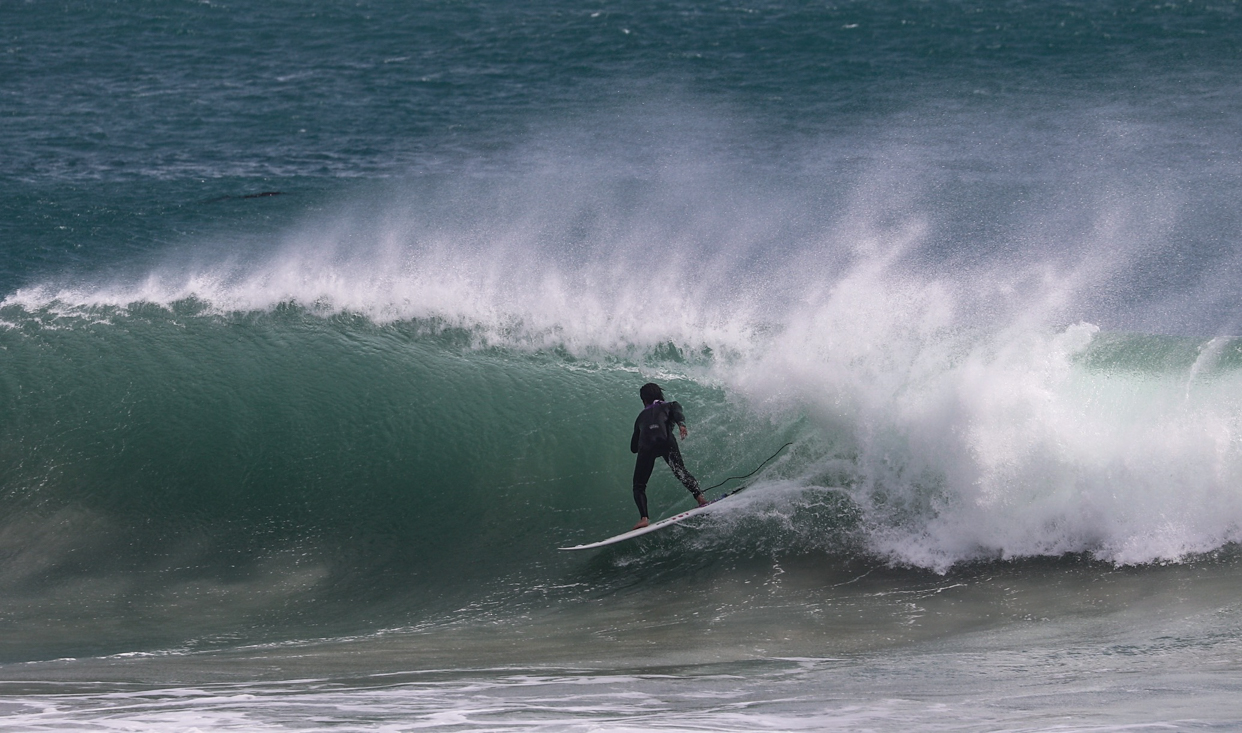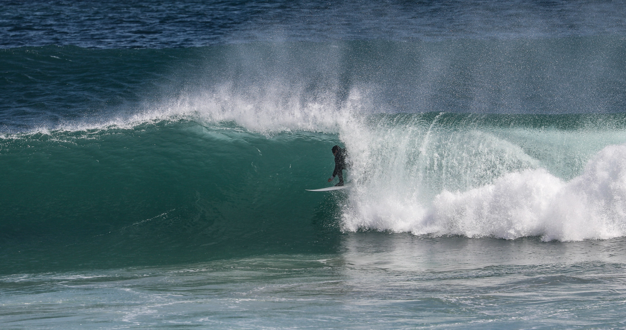 ビーチに降り立つと、セットの波を掴み、見事なねじ込みからバックサイドチューブをメイクするサーファーの姿が。