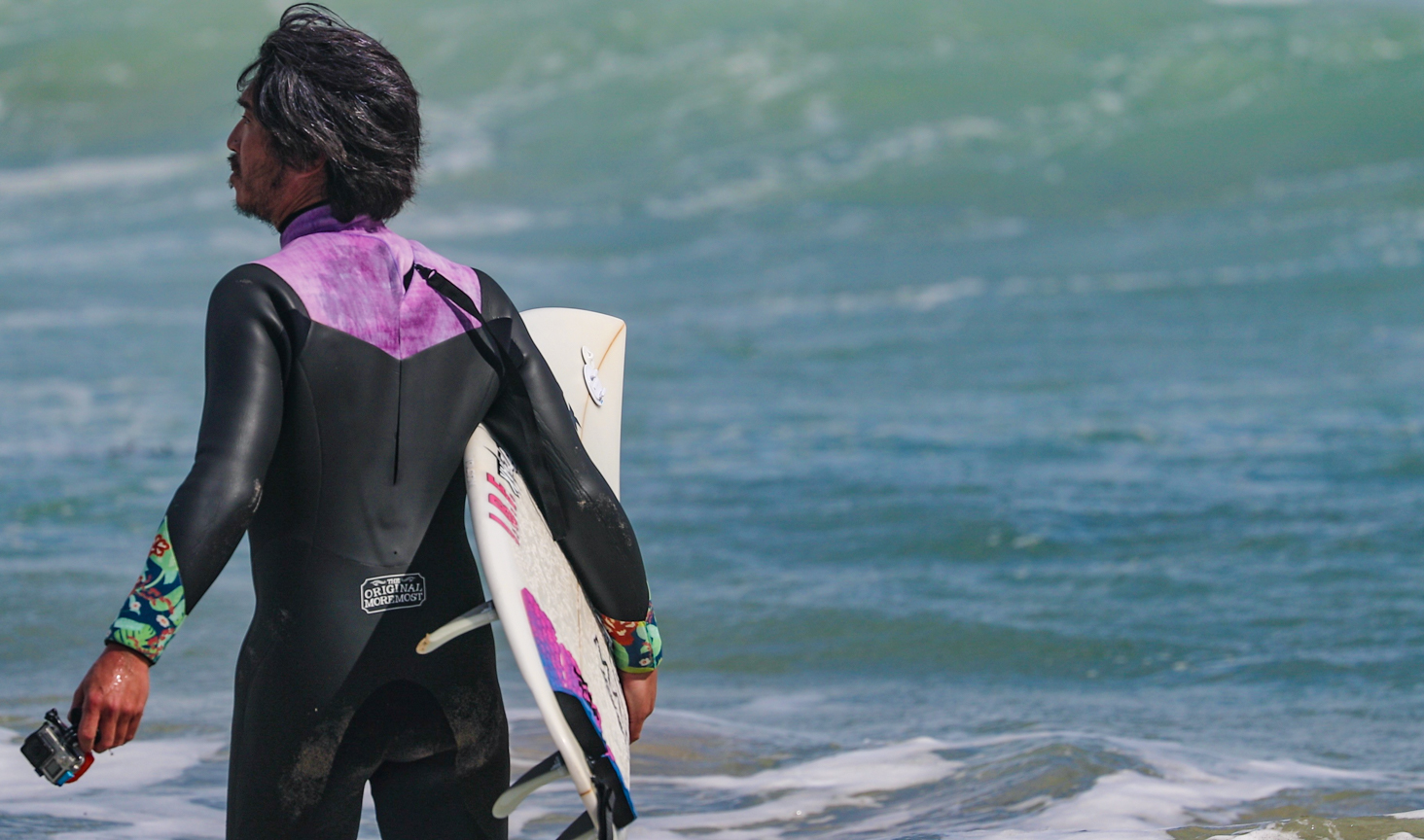 旅慣れている彼ならではのローカリズムに対する細心の配慮なのか、しかしそれでもセッション後半は波を呼び込み、少し左側のピークから数本の見事なチューブを披露。