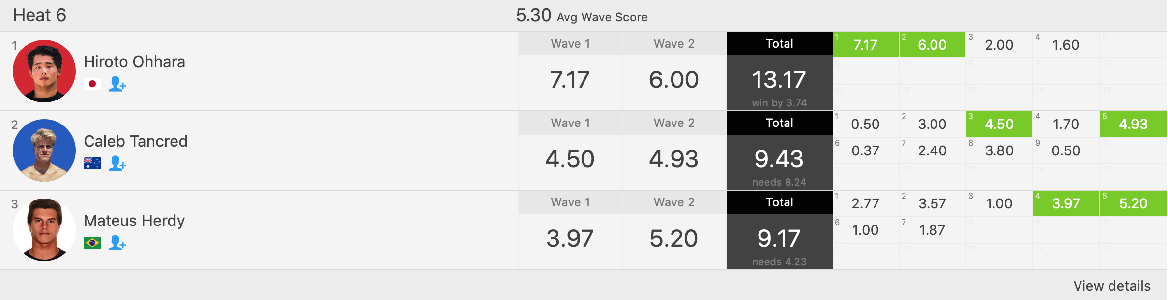 注目の日本人選手の活躍はMENSラウンド3のヒート6に出場した大原洋人が1本目から7.17ptのグッドスコアをマーク!