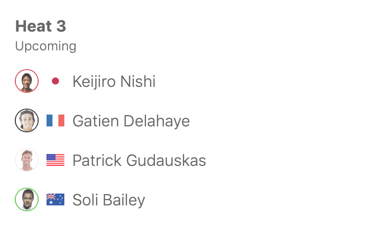 ヒート3では西慶司郎がCTサーファーのPatrick GudauskasとSoli BaileyをはじめGaiter Delahayeと対戦。