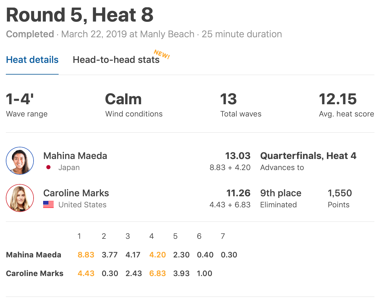 さらにヒート7に出場の前田マヒナは未来のワールドチャンピオン候補として世界が注目するCaroline Marksと対戦。