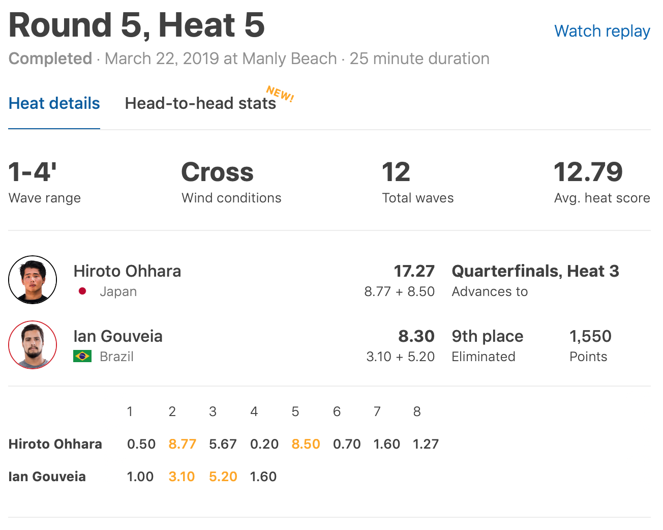 今大会でMatt Bantingと対戦するのは3度目で、1回目はラウンド2の4人ヒートで、2回目はラウンド4の3人ヒートで、どちらもMatt Bantingが1位で大原が2位という形でラウンドアップしてきたが、コンテスト終盤に向けて調子を挙げてきている大原洋人だけに、次の1対1のマンオンマン・ヒート形式となるセミファイナルでは快進撃を魅せてくれることに期待したい!!