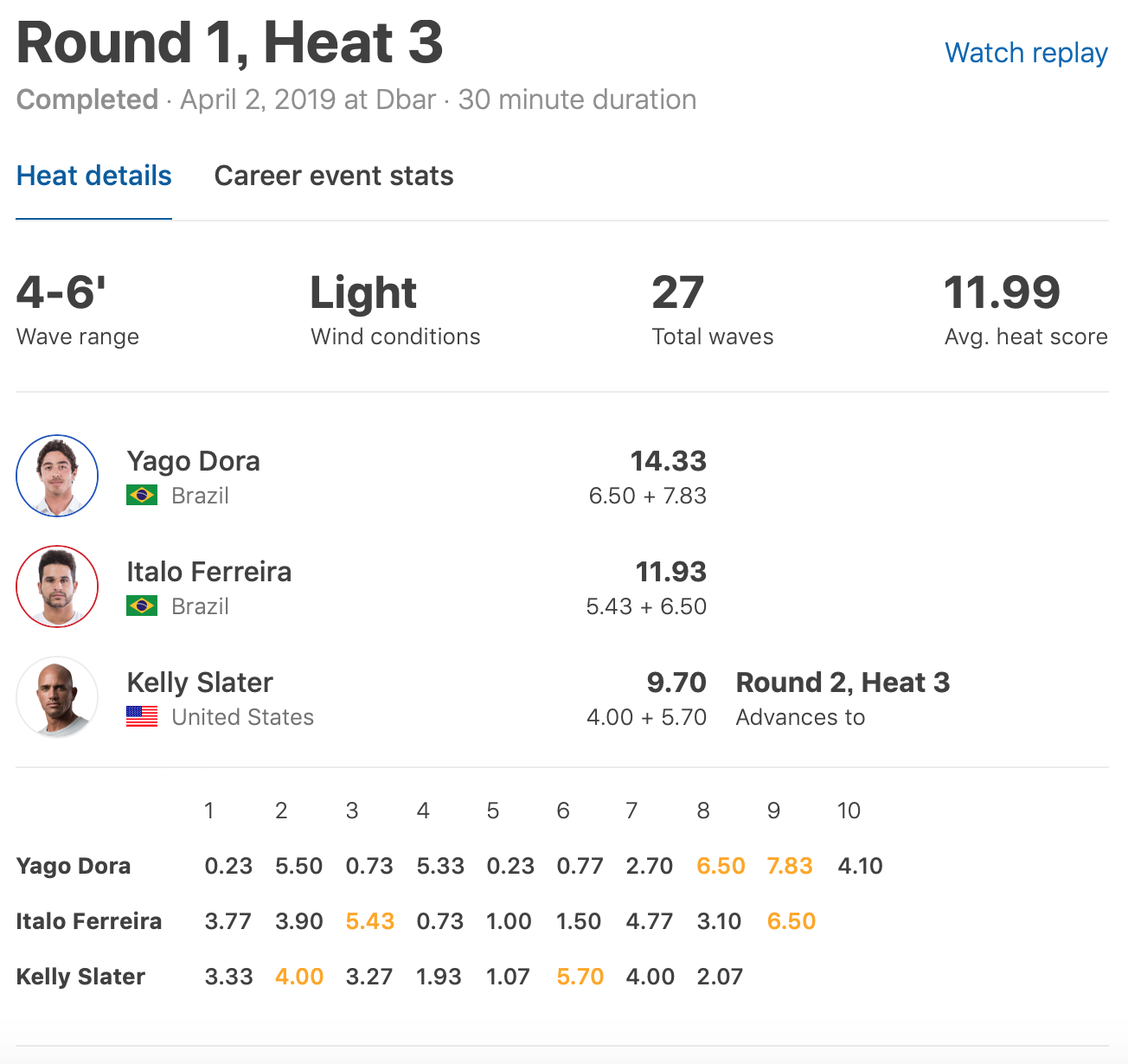 さらにヒート3に登場のKelly Slaterの活躍にも注目が集まったが、Yago DoraとItalo Ferreiraといったブラジルが生んだ世界トップレベルのエアリスト2名を相手に惜しくも3位となり、ラウンド2へ。