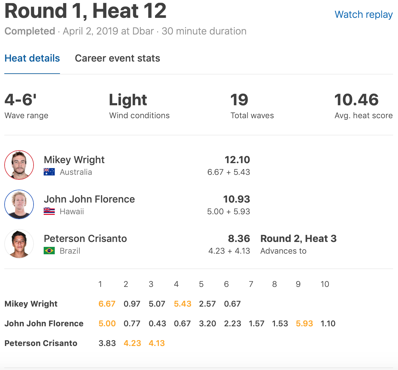 迎えるラウンド2のヒート3ではOwen Wright、Peterson Crisantoと対戦予定。