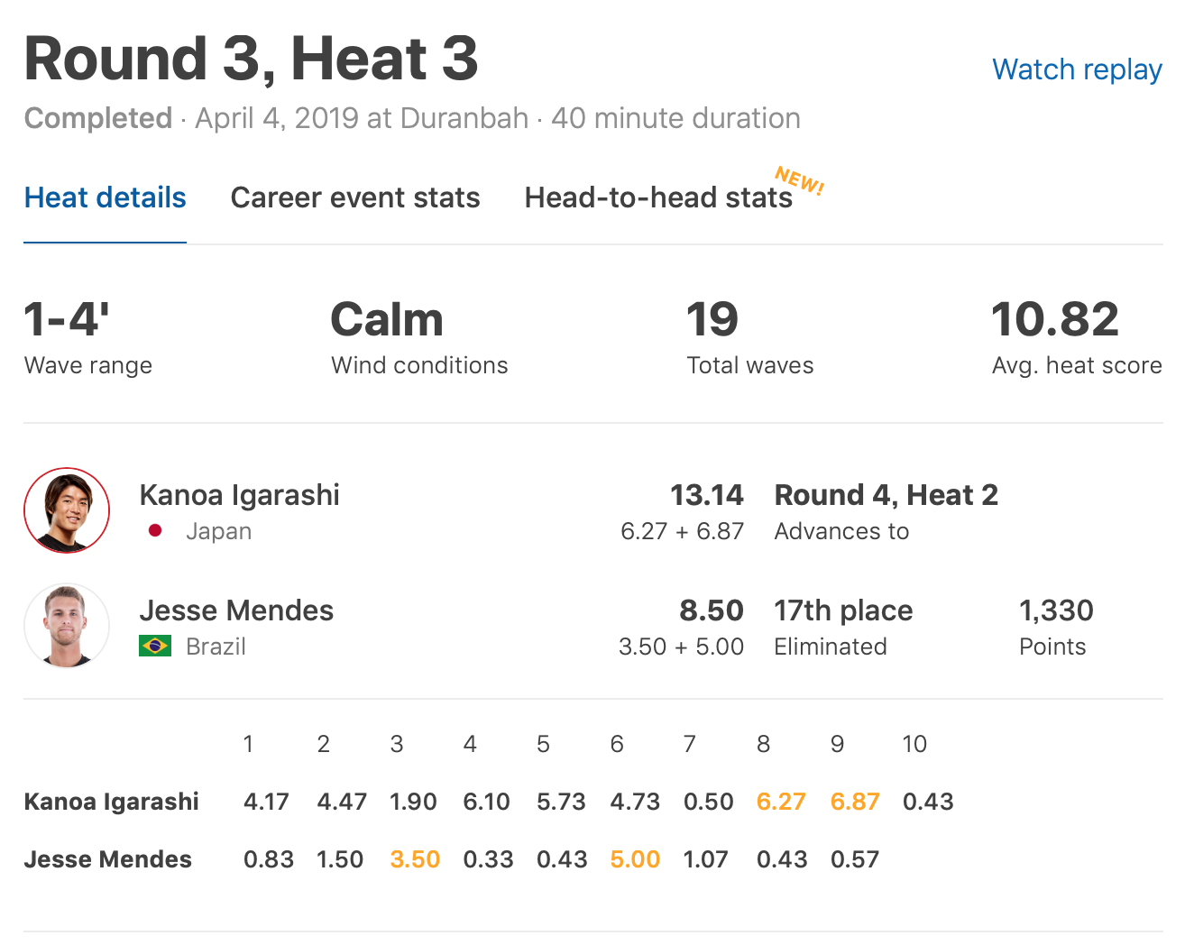 注目の注目の五十嵐カノアはラウンド3のヒート3でJasse Mendesと対戦。