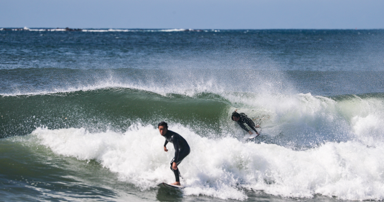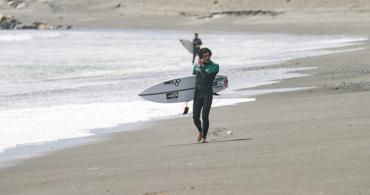 若干強めのオフショアにより、ビーチブレイクのほとんどがワイド気味なダンパーが目立つコンディションとなった中、スーパースター湯川正人と合流。