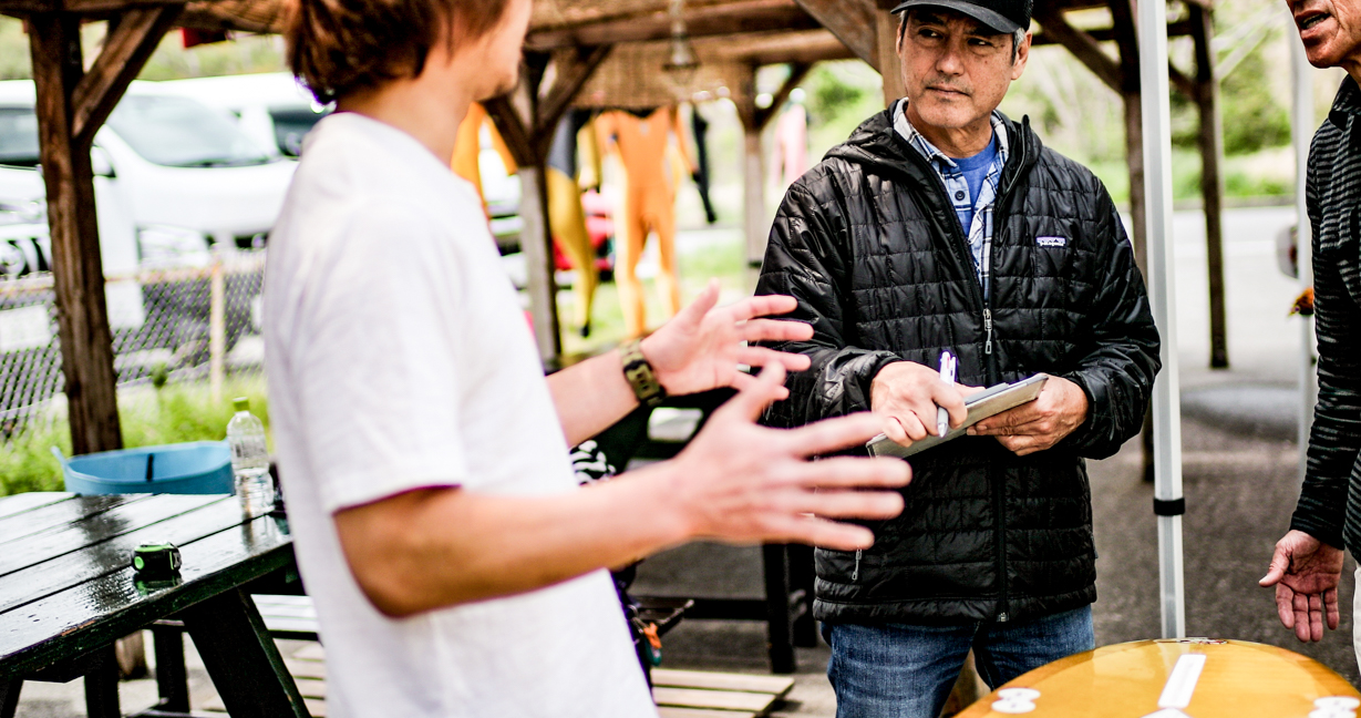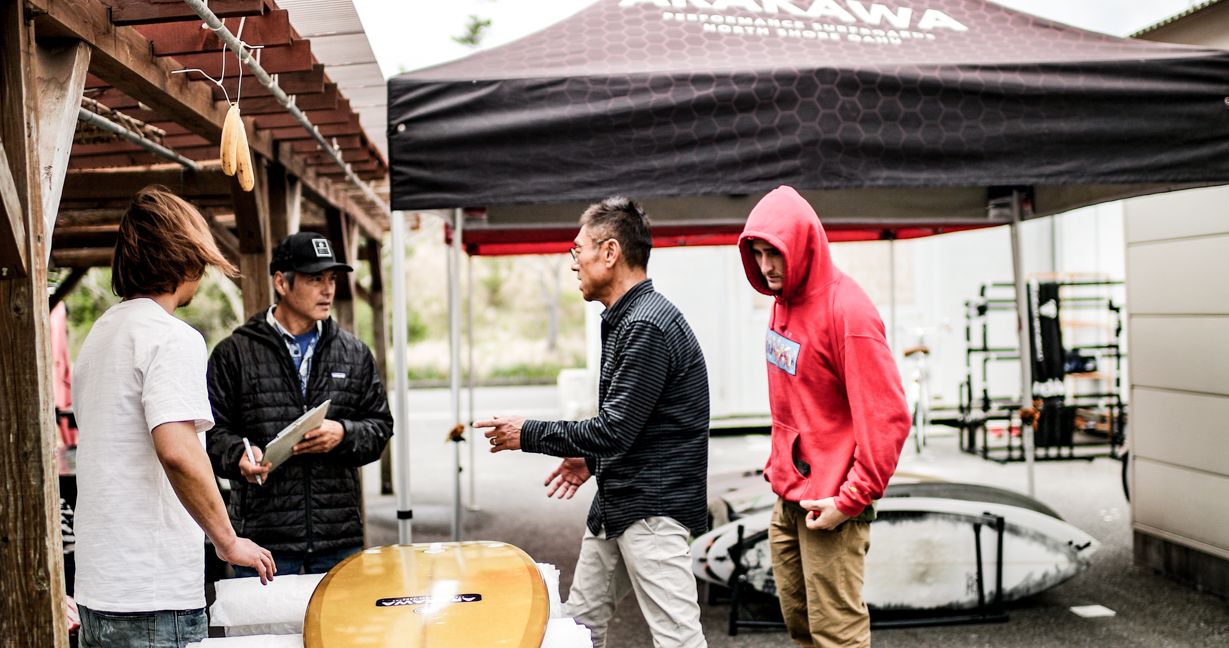 来日初日となる4/14(日)は、この日HICストアでEric ArakawaのArakawa surfboardsの来日オーダー会が開催された中、朝はHICストア前の海でKalani Davidを中心に、プロサーファーの加瀬優をはじめ、松永大輝、松永莉奈、松永健新、そして種子島出身の注目の若手、日高涼太たちによってモーニングセッションとなった。