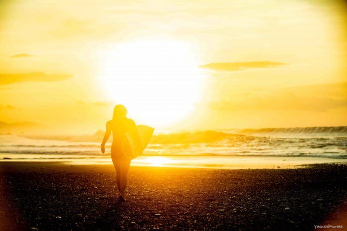 ビーチから海に向かって左寄りの水平線から日が昇るクラマスの美しい朝。朝陽が昇ると共に朝一の練習セッションを行なうべく入水していく野呂冷花。Reika Nori in Sun Rise.