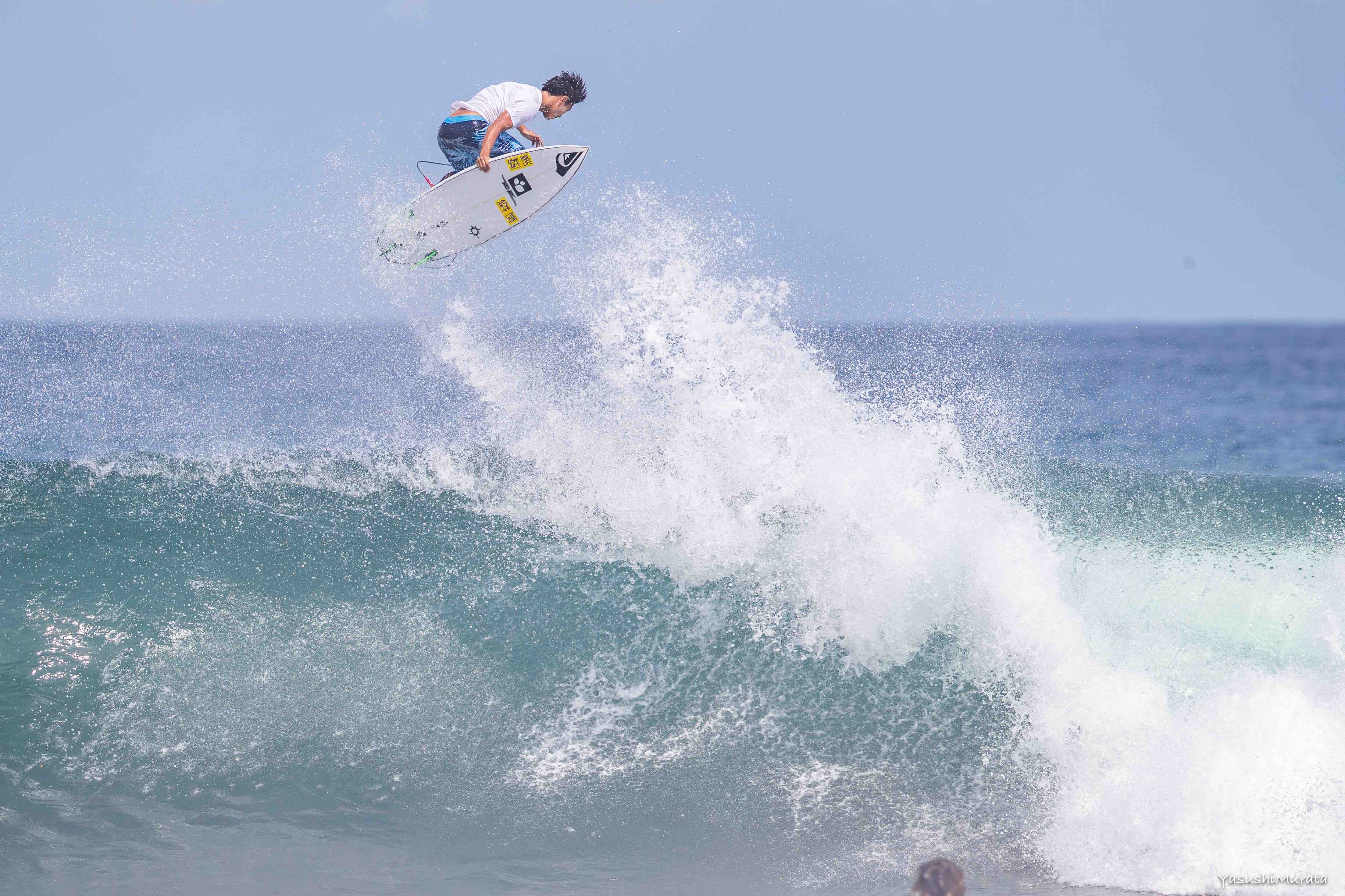 スケートボードのコンクリート・ボウルでプロスケーターたちが見せるビッグエアを想起させるような、高さのあるバックサイド・エアを魅せるのは、宮崎出身で千葉を拠点とするトッププロサーファー渡辺寛。Kan Watanabe.