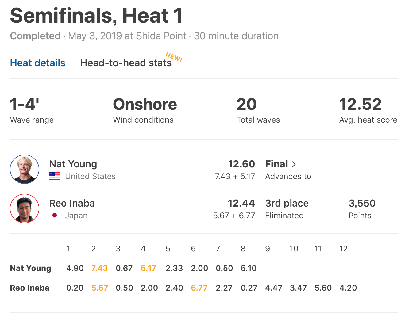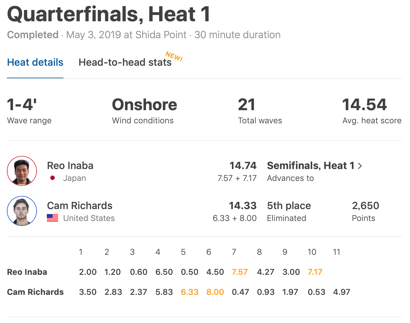 その流れを変えたい大原洋人であったが、ハイスコアを出せる可能性のあるいい波が非常に少ない上、その波を見つけるのが難しい波のコンディションに翻弄され、積極的に波を掴むがなかなかスコアを伸ばせず、5本目に4.83pt、さらに6本目には6.00ptをまとめるが逆転にはあと一歩及ばず、惜しくもここで敗退。