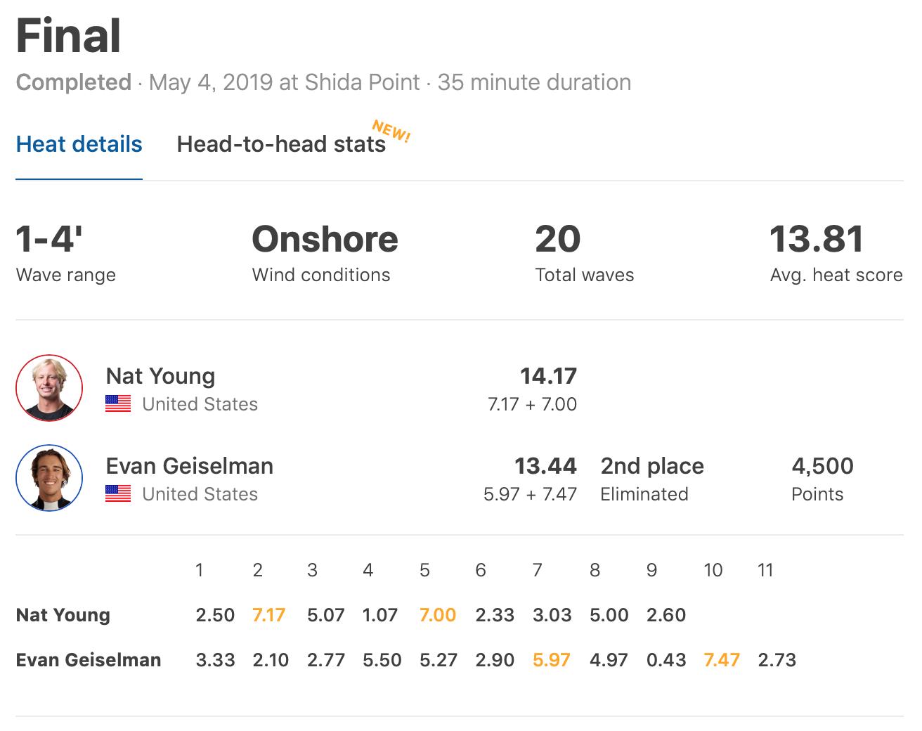 2本目の波で7.17pt、5本目の波で7.00ptをスコアしたNat Youngが、Evan Geiselmanの追従を最後まで許さぬ形で見事優勝を勝ち獲った!