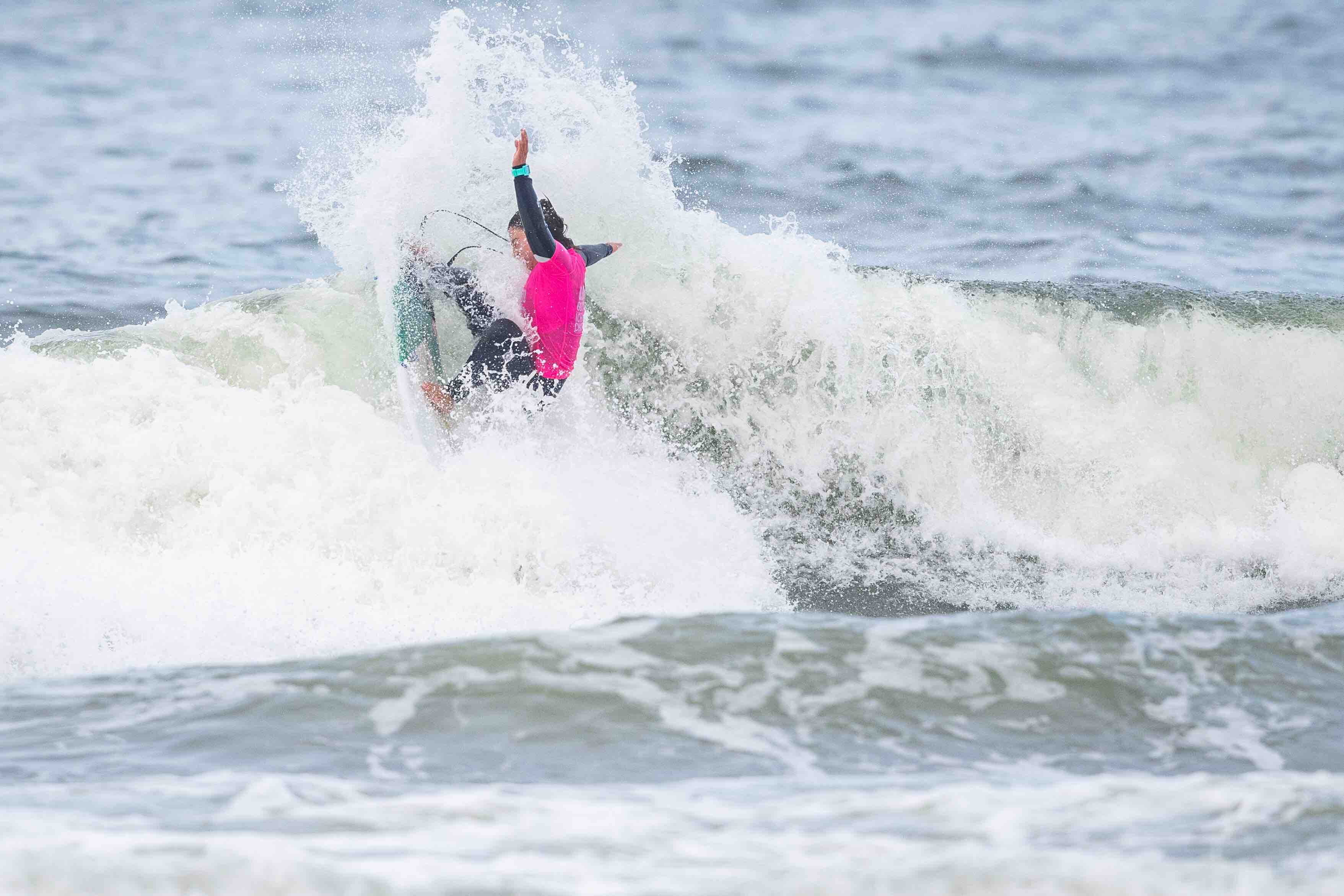 オンショアで面のガタつく腰前後のスモール・コンディションの中、WOMENS QS1000のセミファイナルからスタートとなり、ヒート1では都筑有夢路が、間違いなく優勝候補のひとりであった前田マヒナを相手に力強いサーフィンをみせてファイナルへ進出!