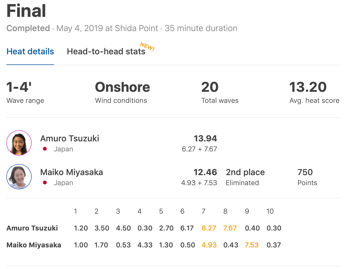 2本目の波で3.50pt、3本目で4.50ptをまとめ、さらに7本目には6.27pt、8本目の波では7.67ptを叩き出した都筑有夢路が終始ヒートの流れを掴み、逆転を狙う宮坂麻衣子が9本目の波で7.53ptを叩き出したが逆転には及ばず、見事都筑有夢路がQS1000優勝を決めた!!