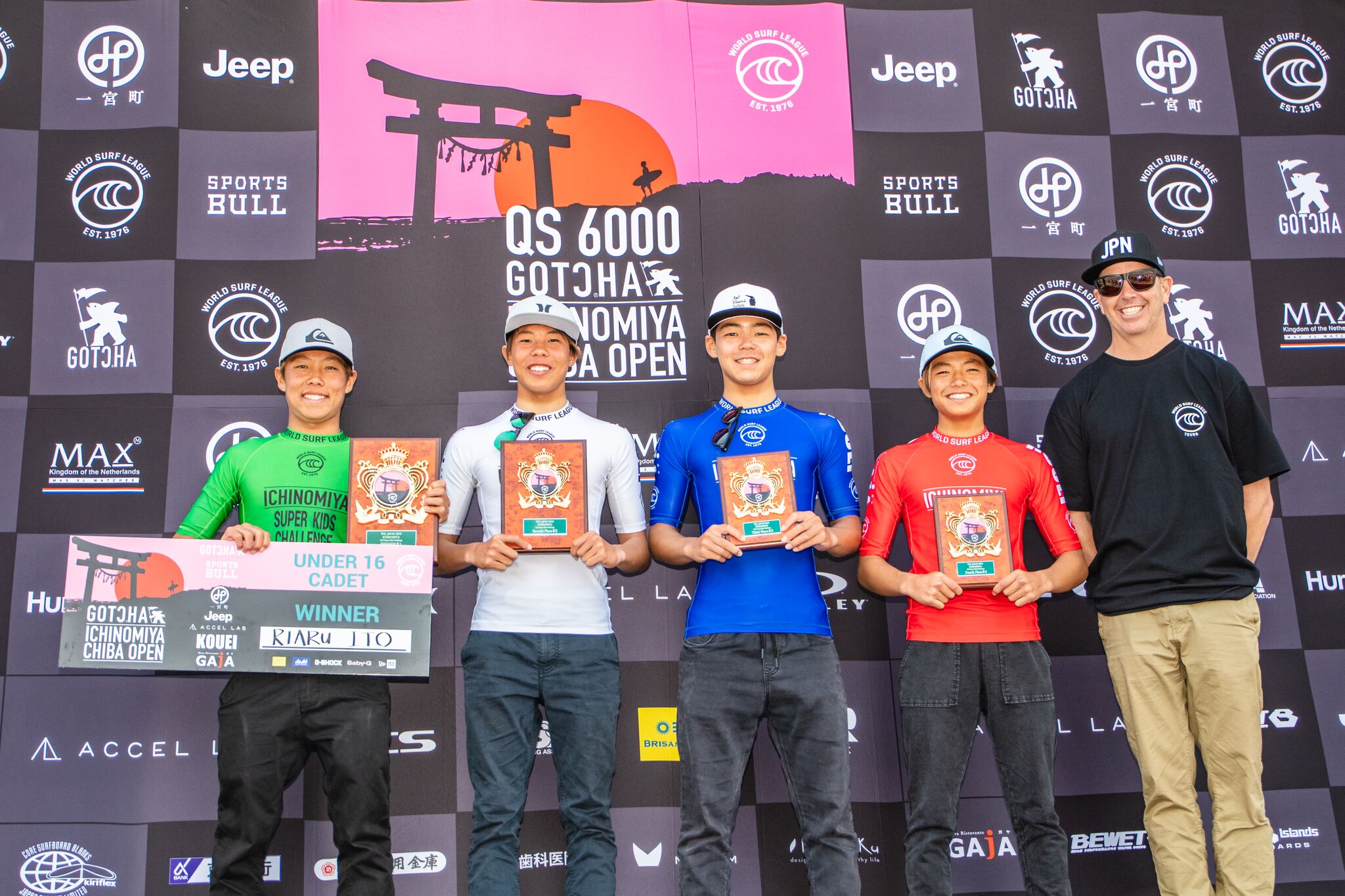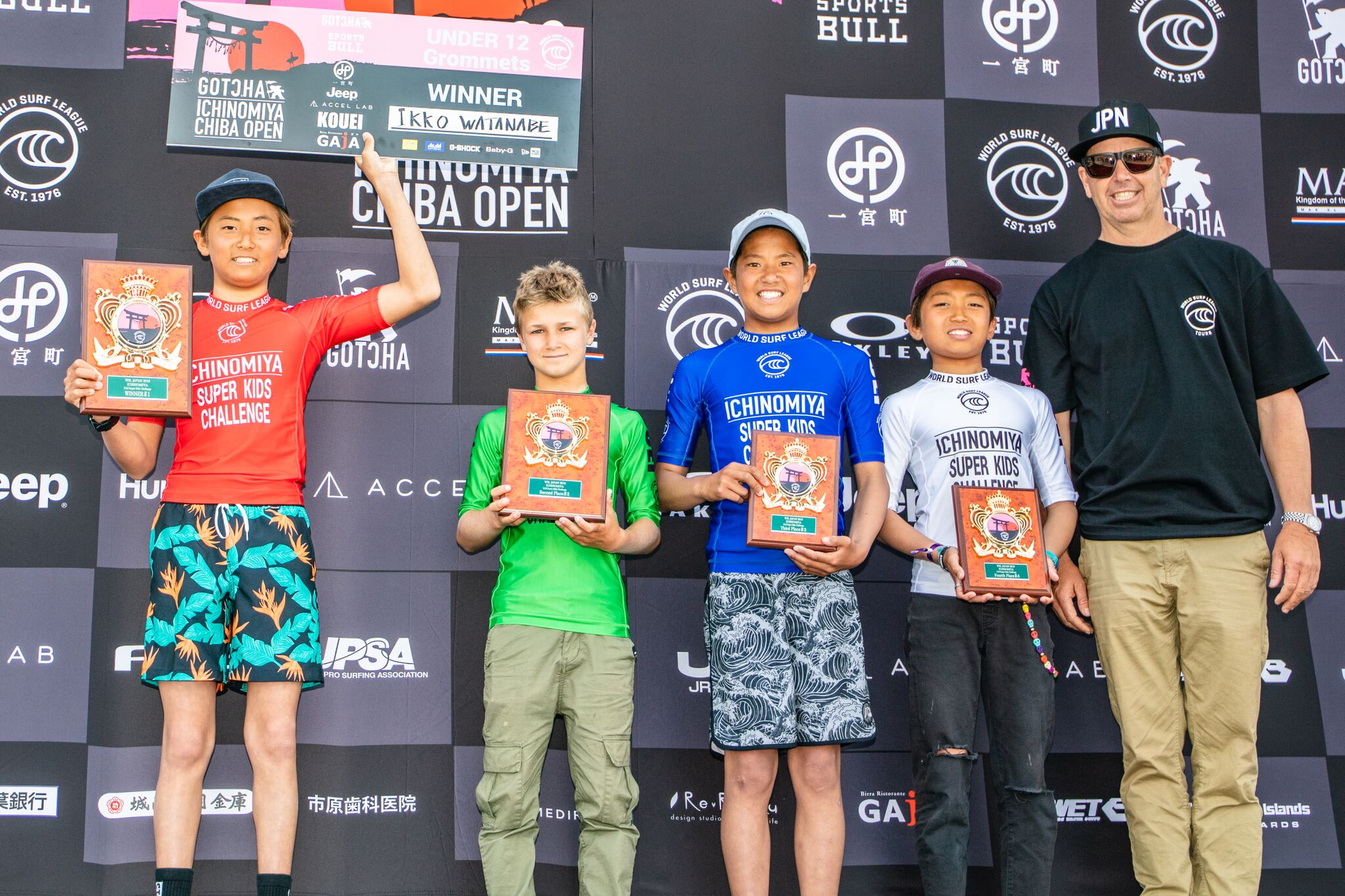 数年後の日本のサーフシーンを担う逸材たちが無限の可能性を秘めたライディングを連発するなか、12歳以下のGromクラスのファイナルは渡邊壱孔、山本来夢、酒井仙太郎、Mannix Squiersといった4名による対戦となり、ヒート終盤にMannix Squiersが追い上げをみせたものの、この世代では常勝組のひとりである渡邊壱孔がリードを保った形で見事優勝を遂げた!