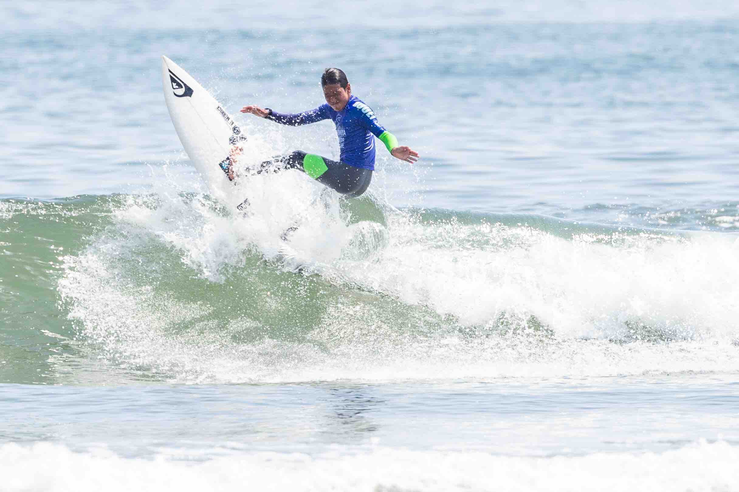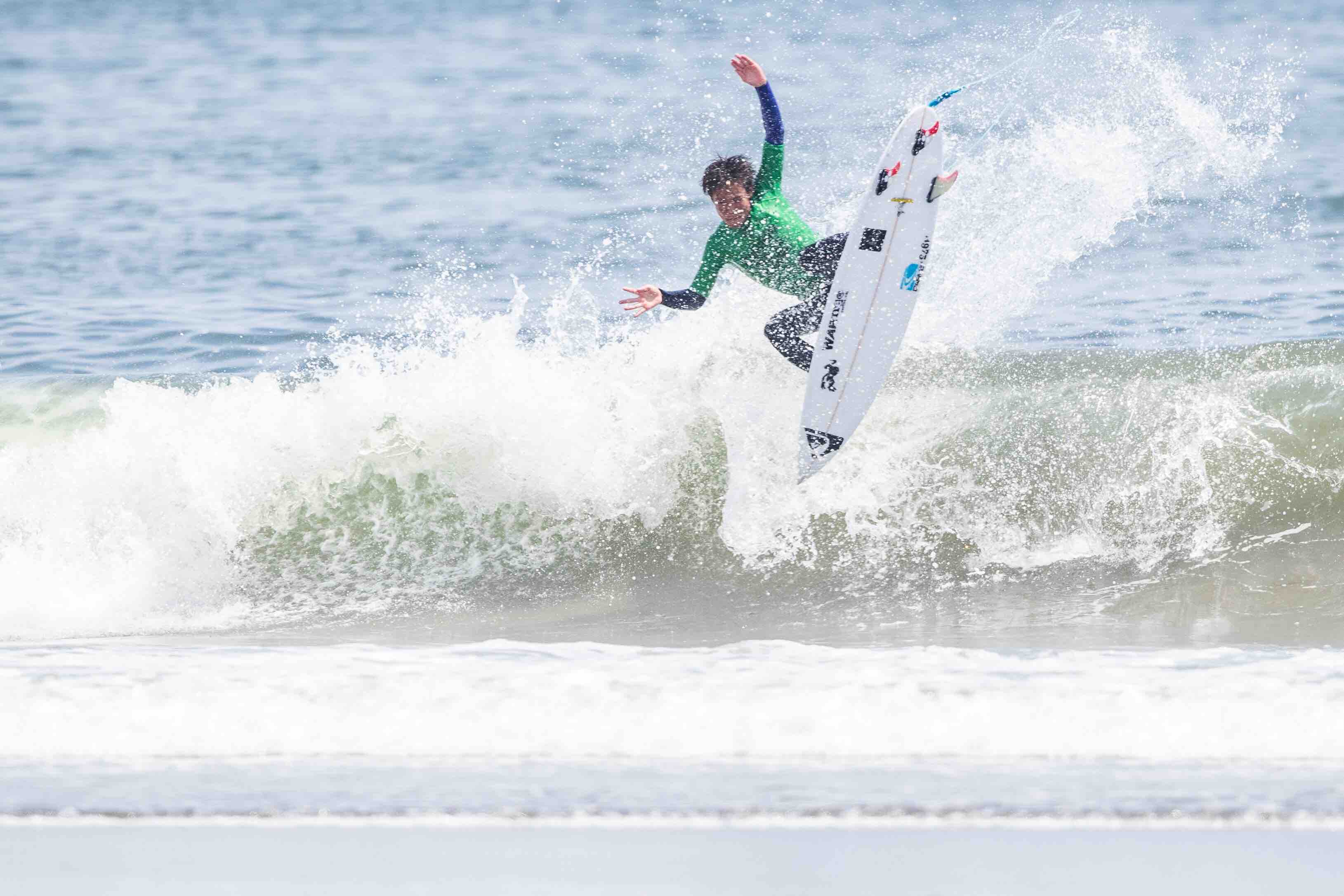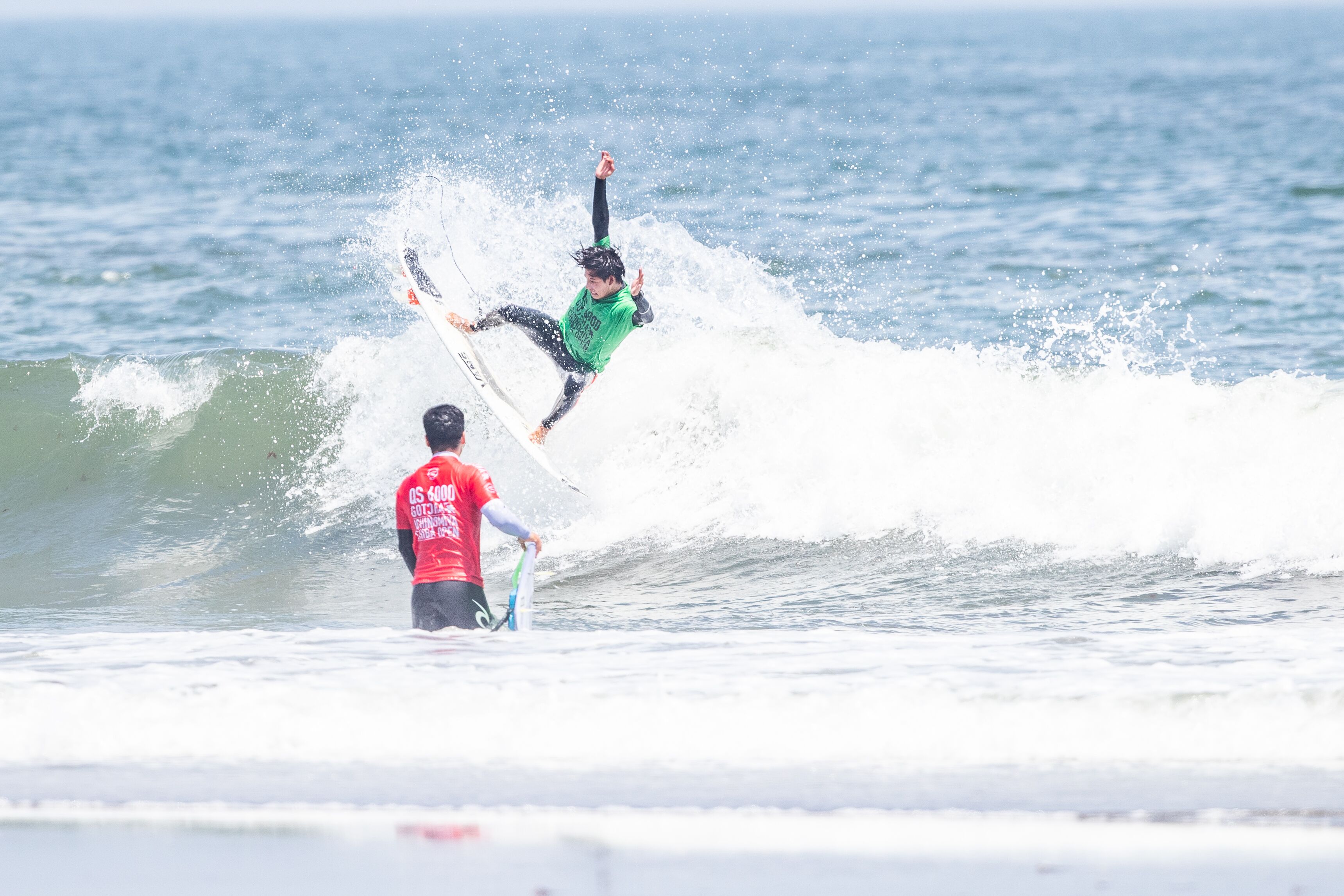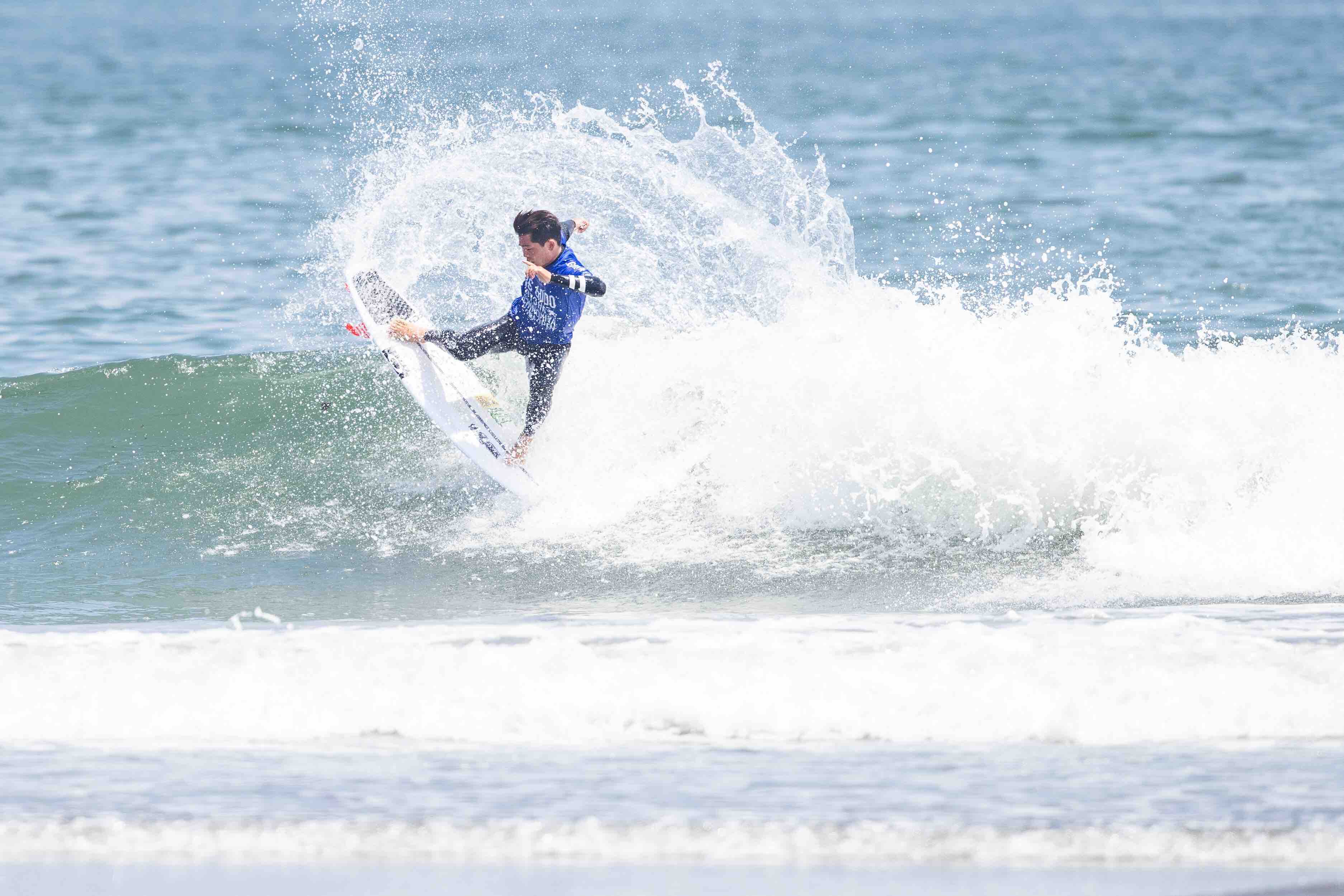 QS6000ではトライアルラウンドで優勝を飾って本戦への出場権を獲得する活躍をみせた伊東李案琉がヒート前半からバックサイドで7pt代のハイスコアをまとめた上、さらにレギュラーのセットを掴んでエクセレントスコアとなる8.27ptを叩き出してヒートの流れを掴む中、ここをホームとする岩見天獅もブレイクの早いライトで6.73ptと8.33ptをスコアして応戦。