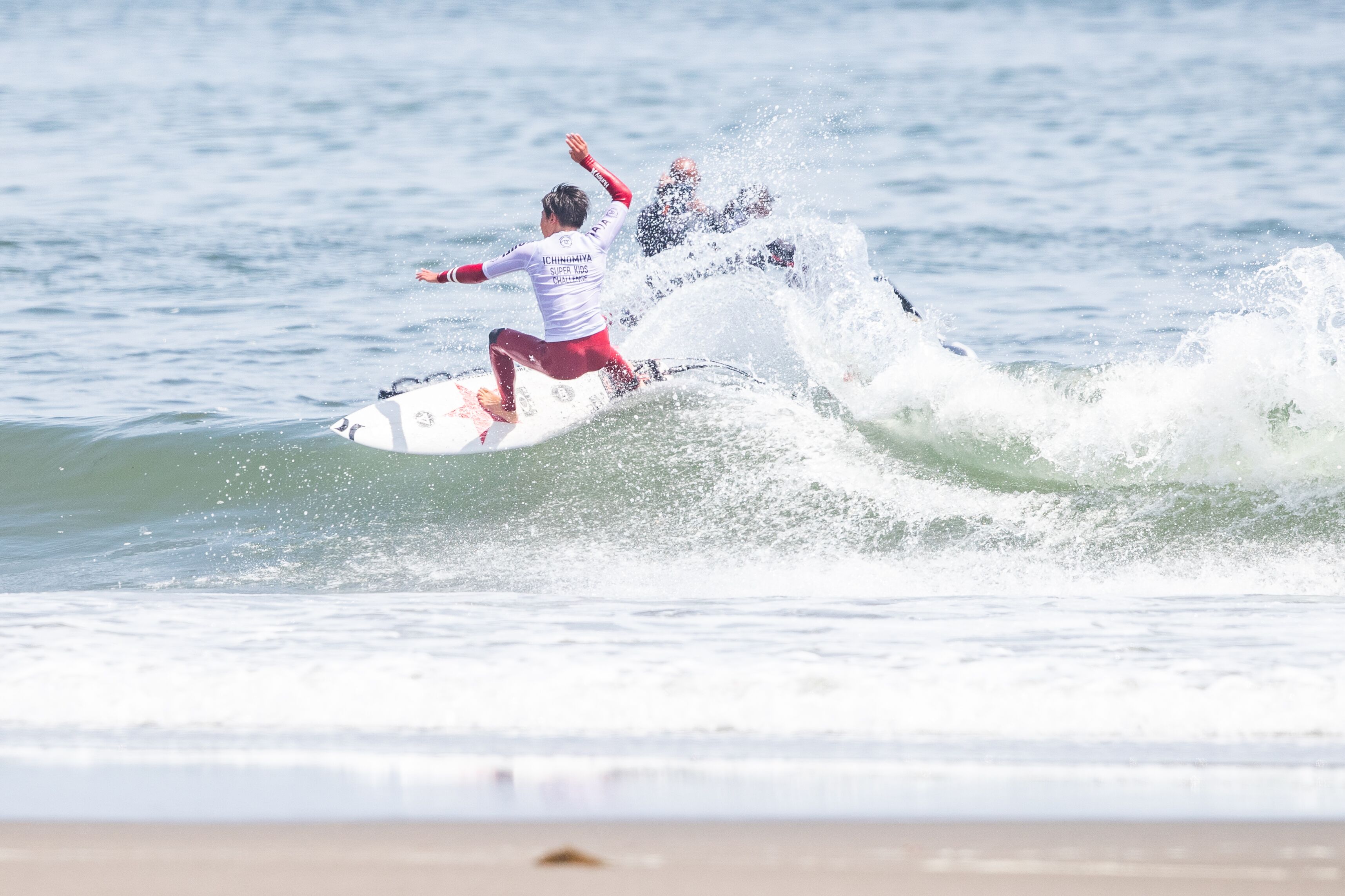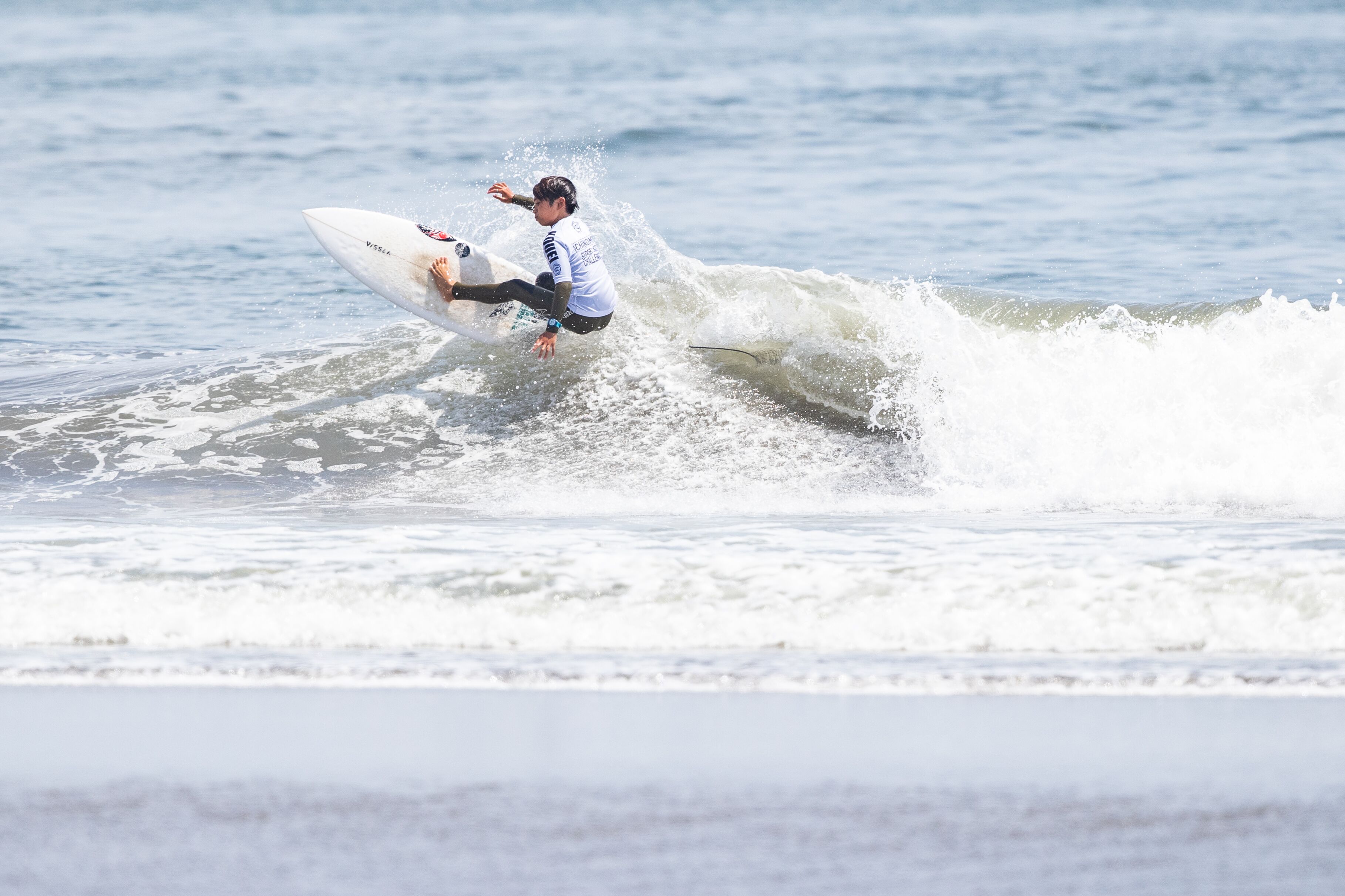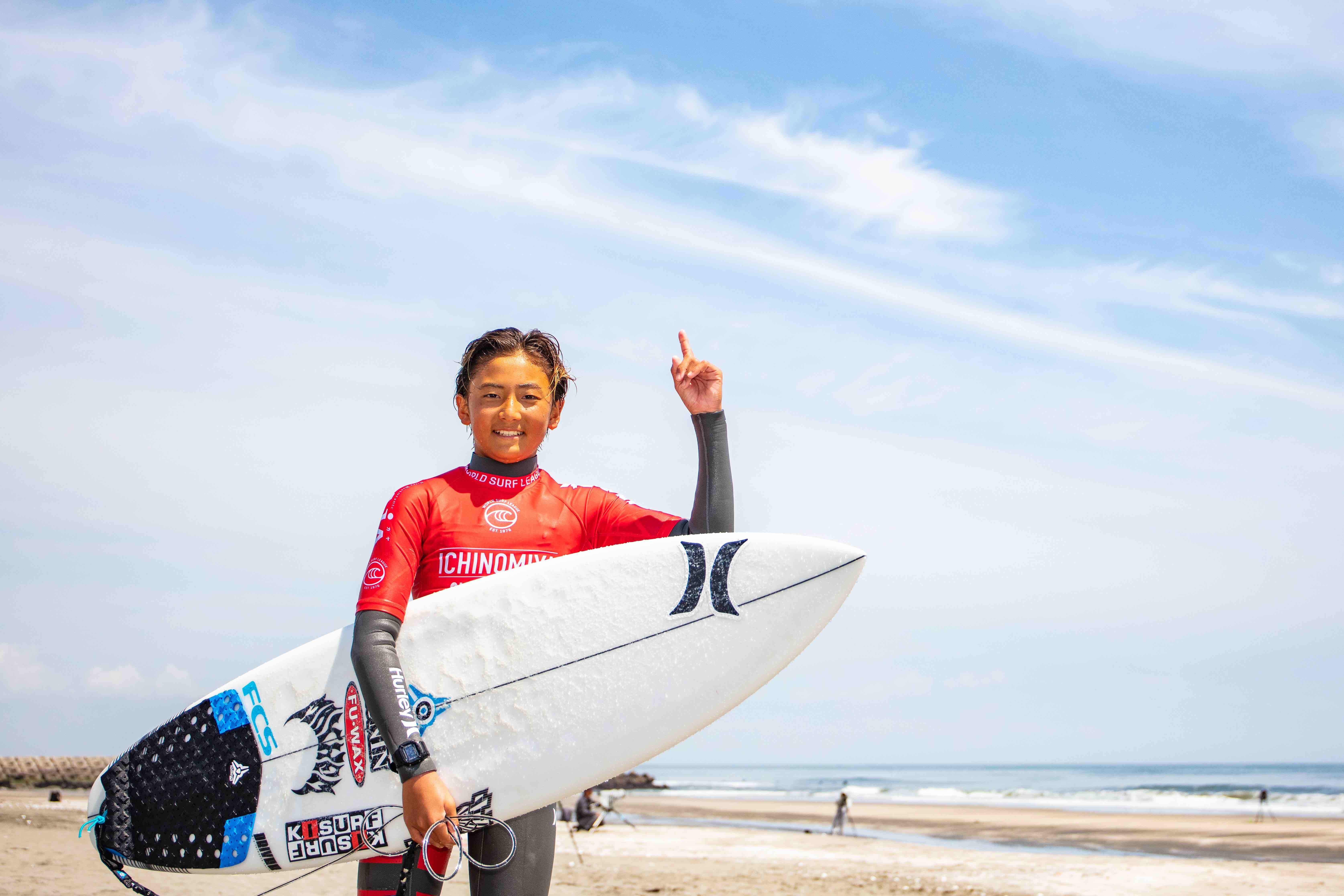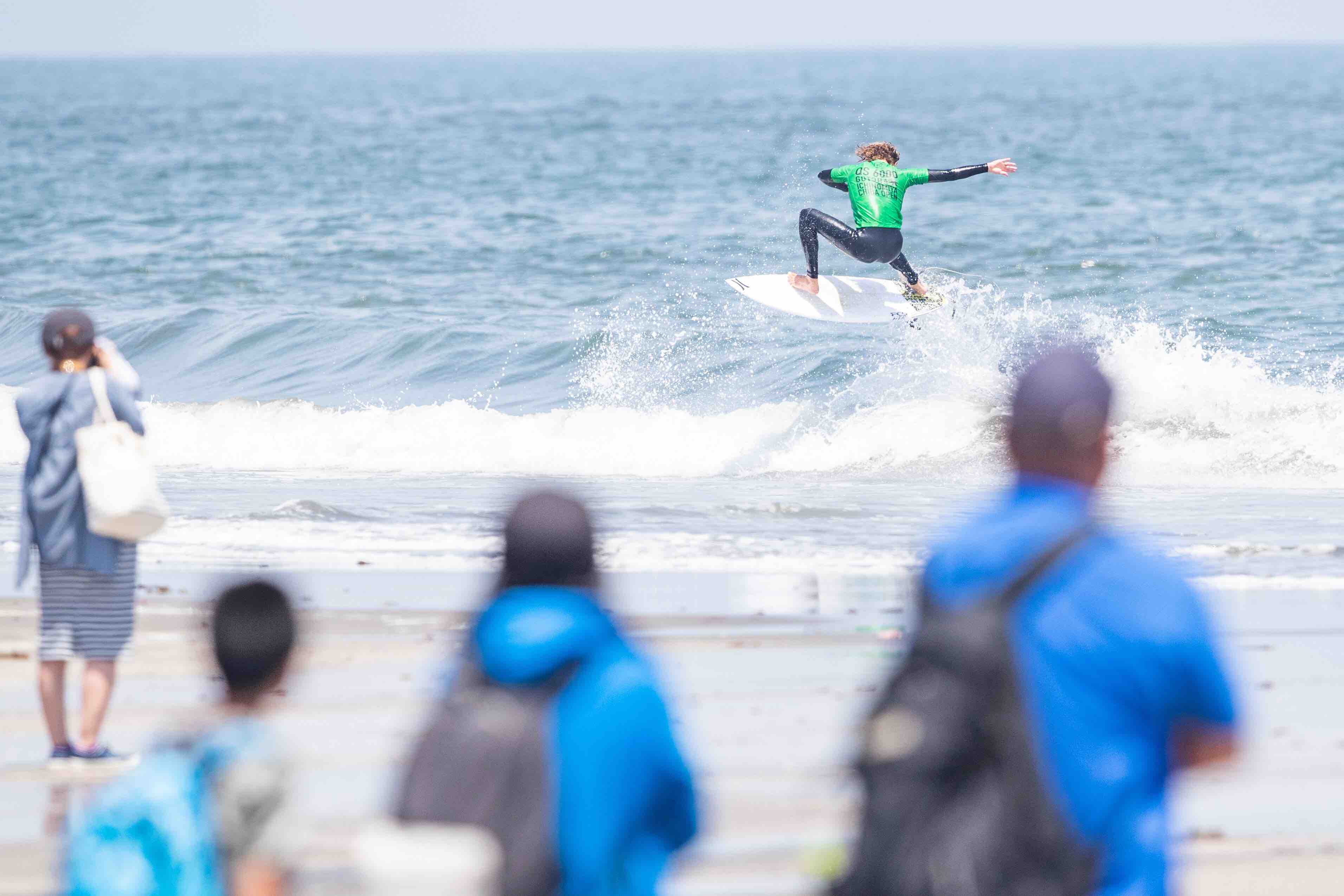 2020年東京オリンピック会場である千葉県長生郡一宮町の志田下を会場に開催されていた今シーズンWSL主催の世界大会では最大級となるQS6000″ICHINOMIYA CHIBA OPEN”は、5/5(日)に大会最終日を迎え、腰前後までサイズダウンしたスモールコンディションの中、この日は16歳以下のスーパーキッズたちを対象としたSuper Kids Challengeとスペシャルイベントであるエアショーが開催された。
