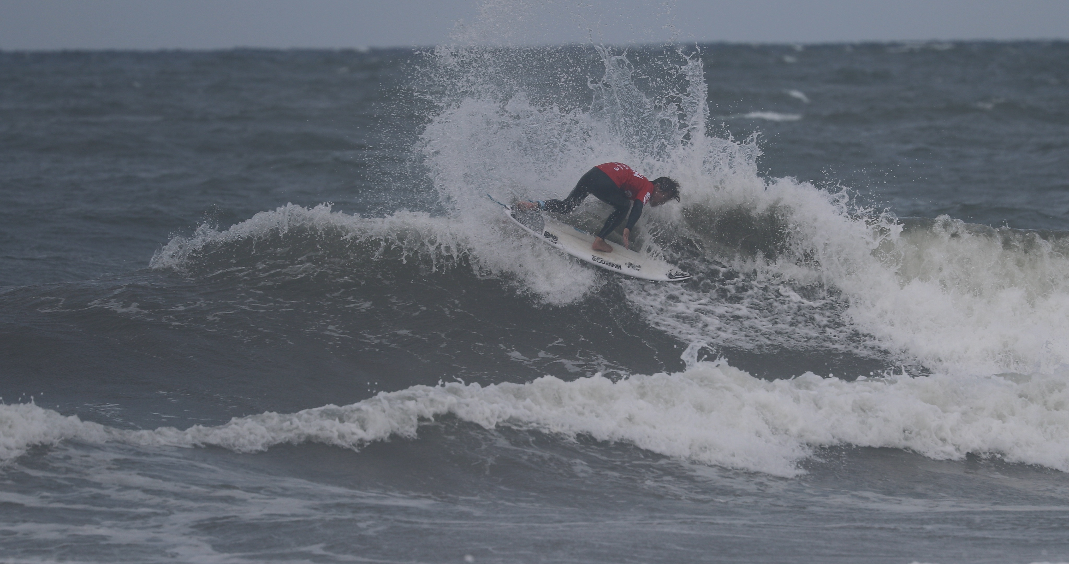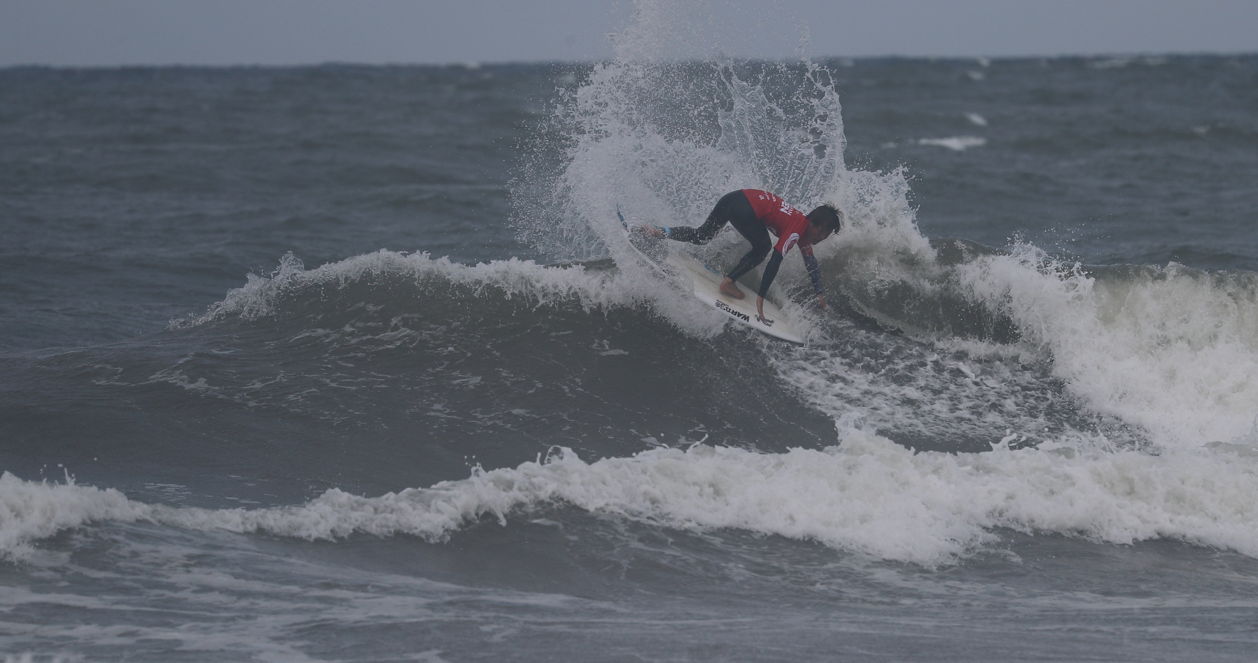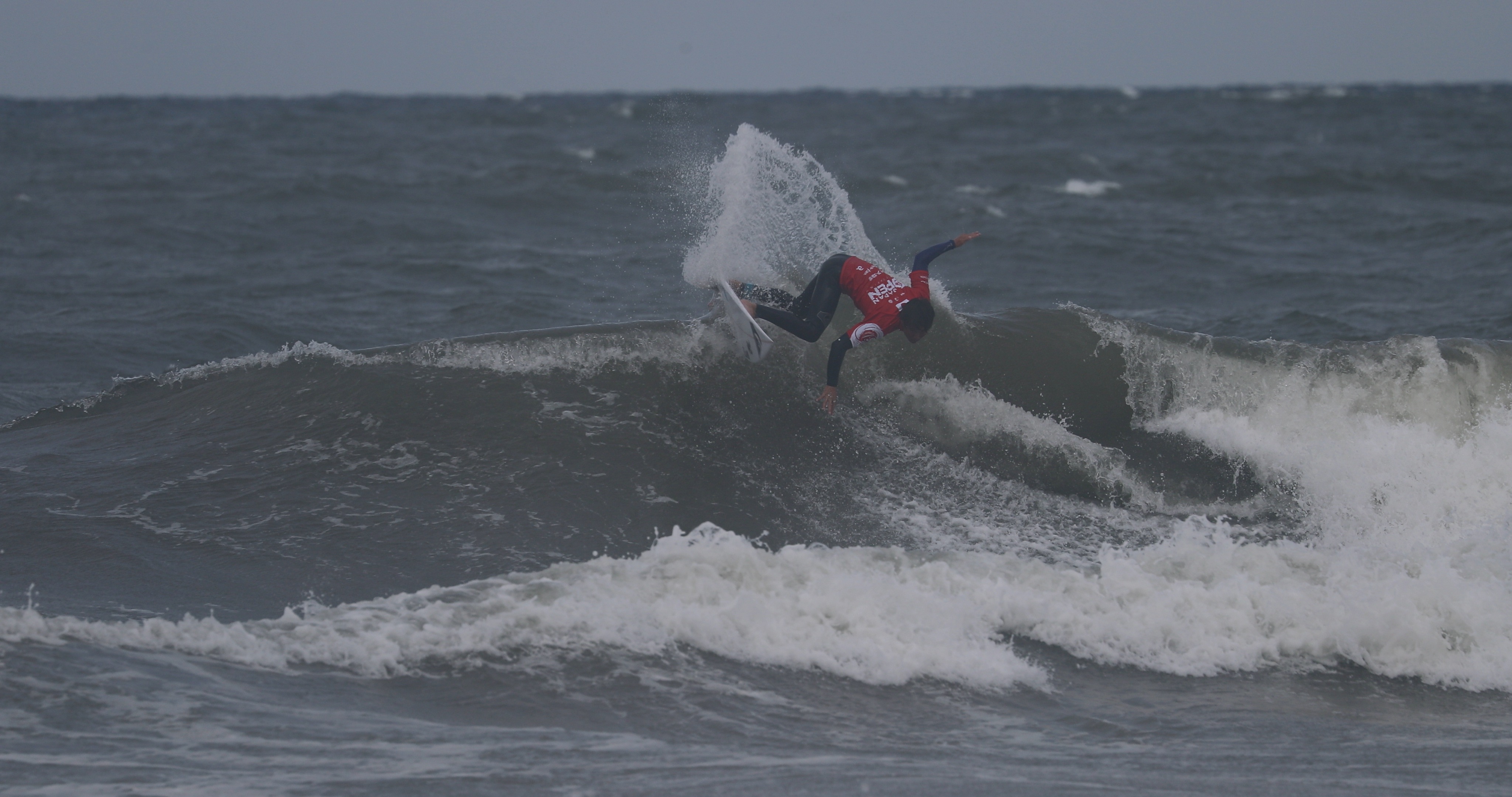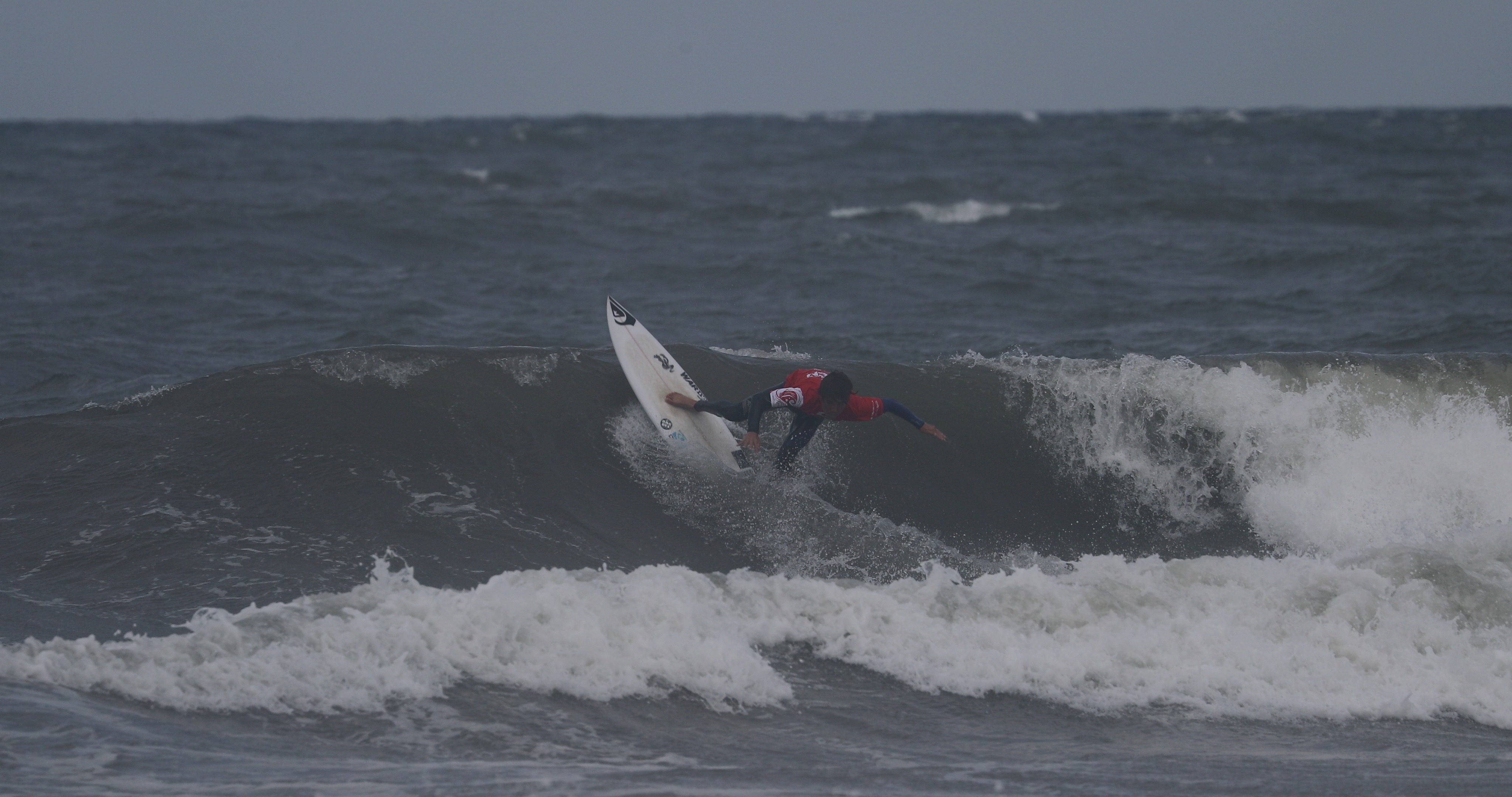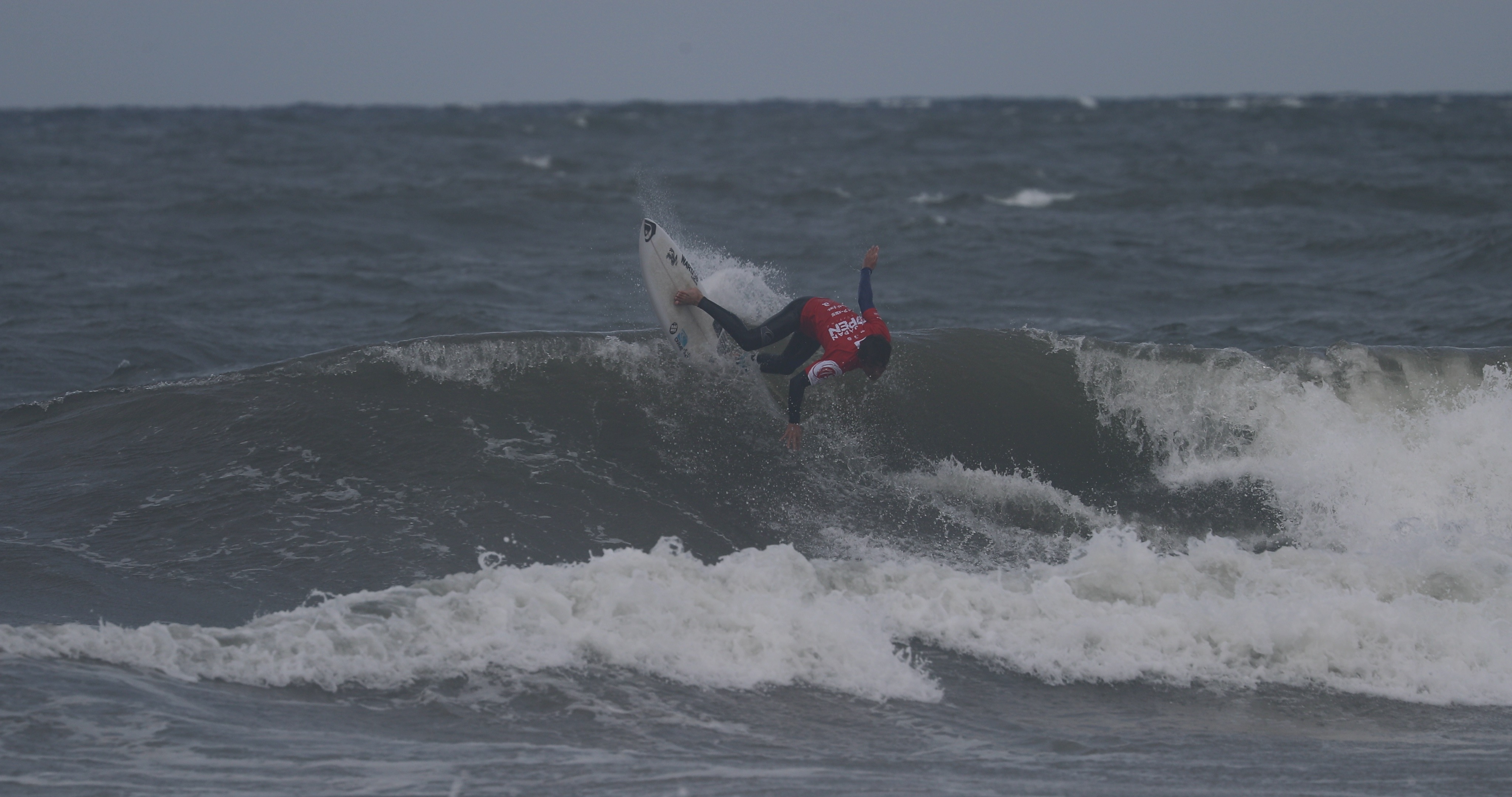 深いボトムターンから際どいリップセクションへ縦にアプローチし、当て込んでフィンズフリーしながらも、北寄りのサイドオンショアによって予想以上にシフトしてくるリップセクションの変化を見極めたかのごとく急遽ボードを大きく180°返して体の真下にホールドしつつ、そのままリップセクションをドリフト気味にパワースライドして仕上げてきたこの1発。