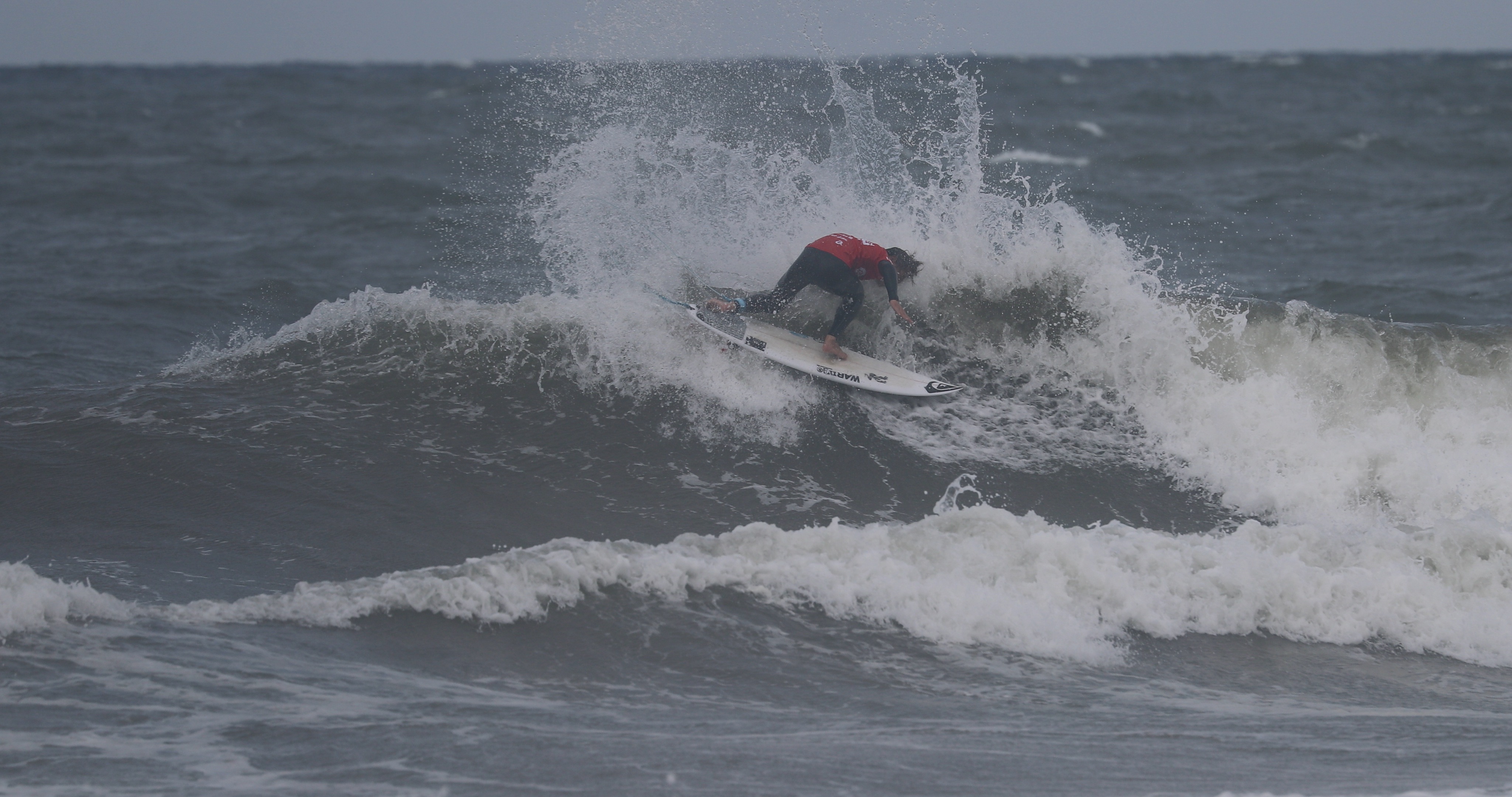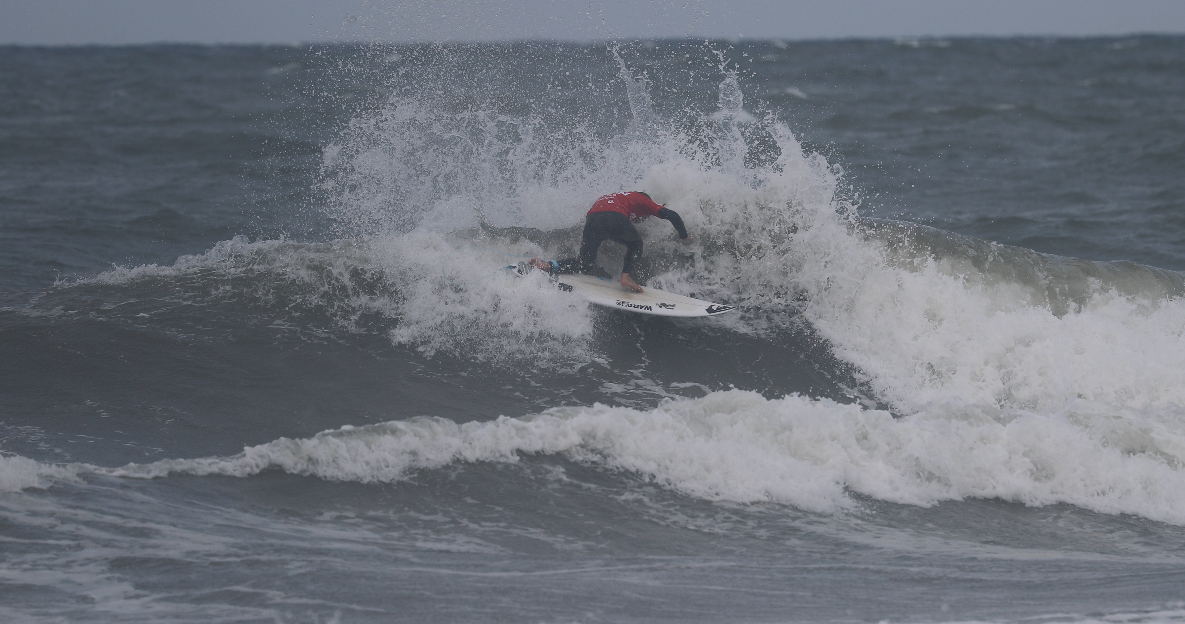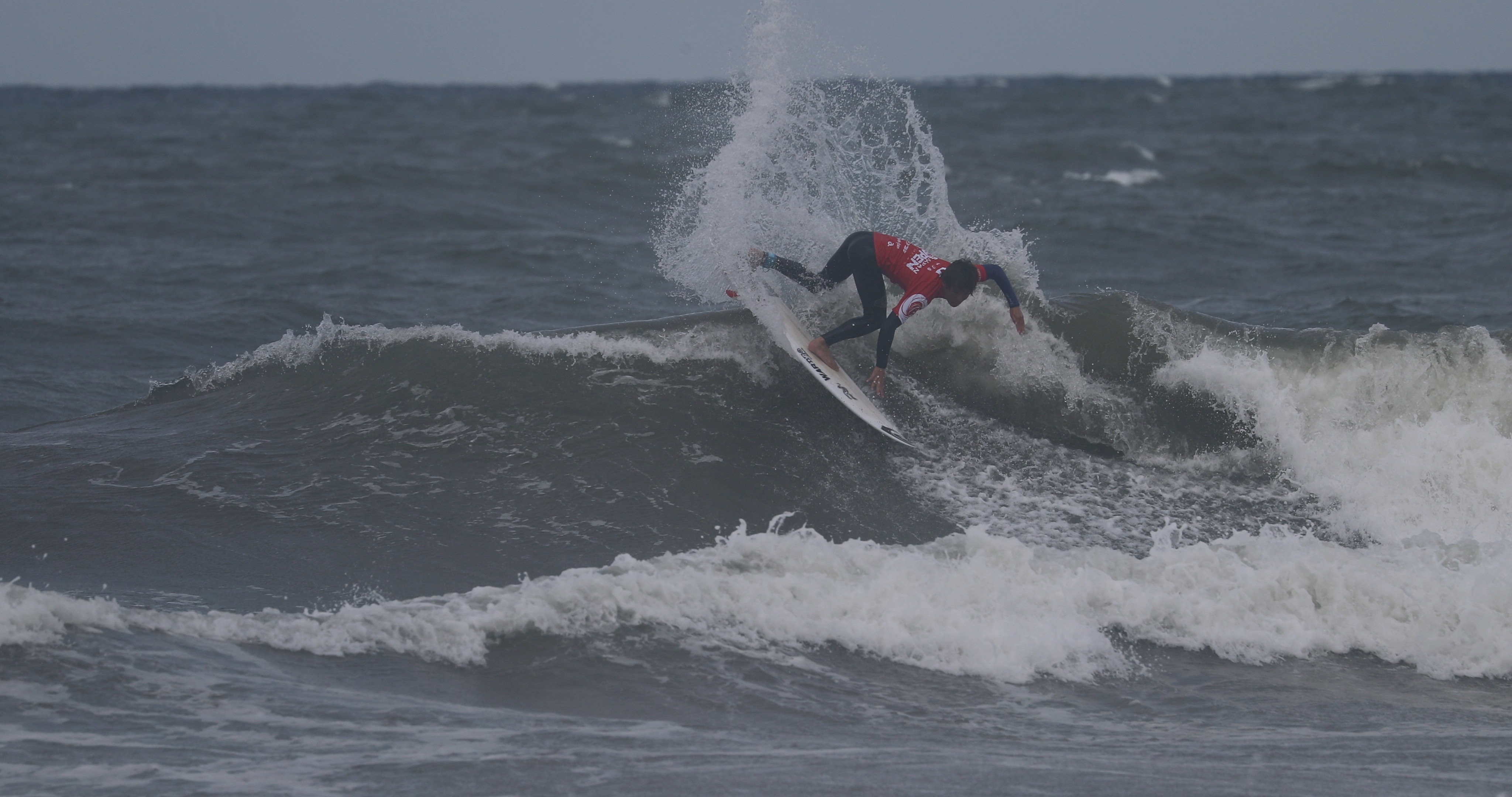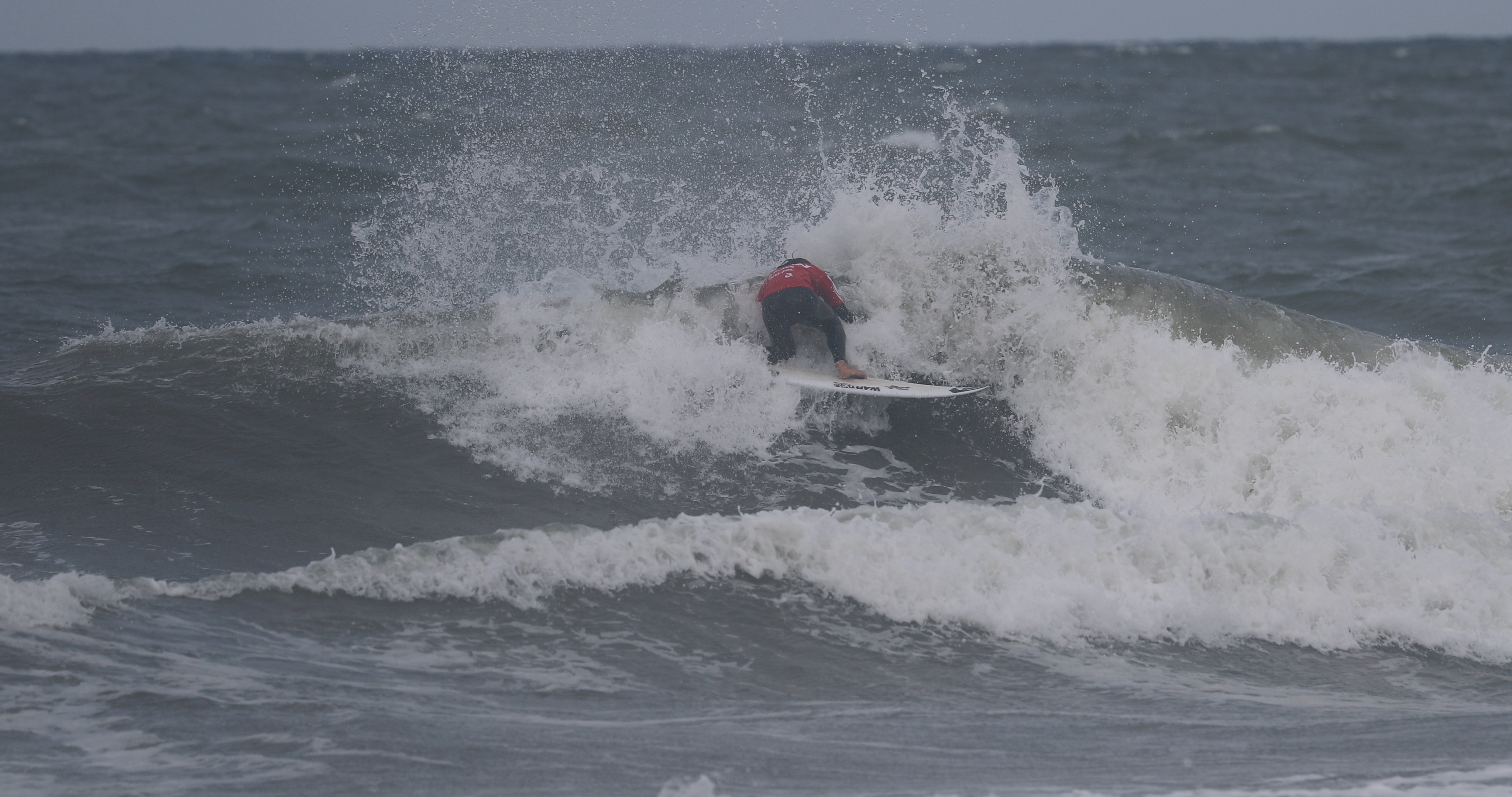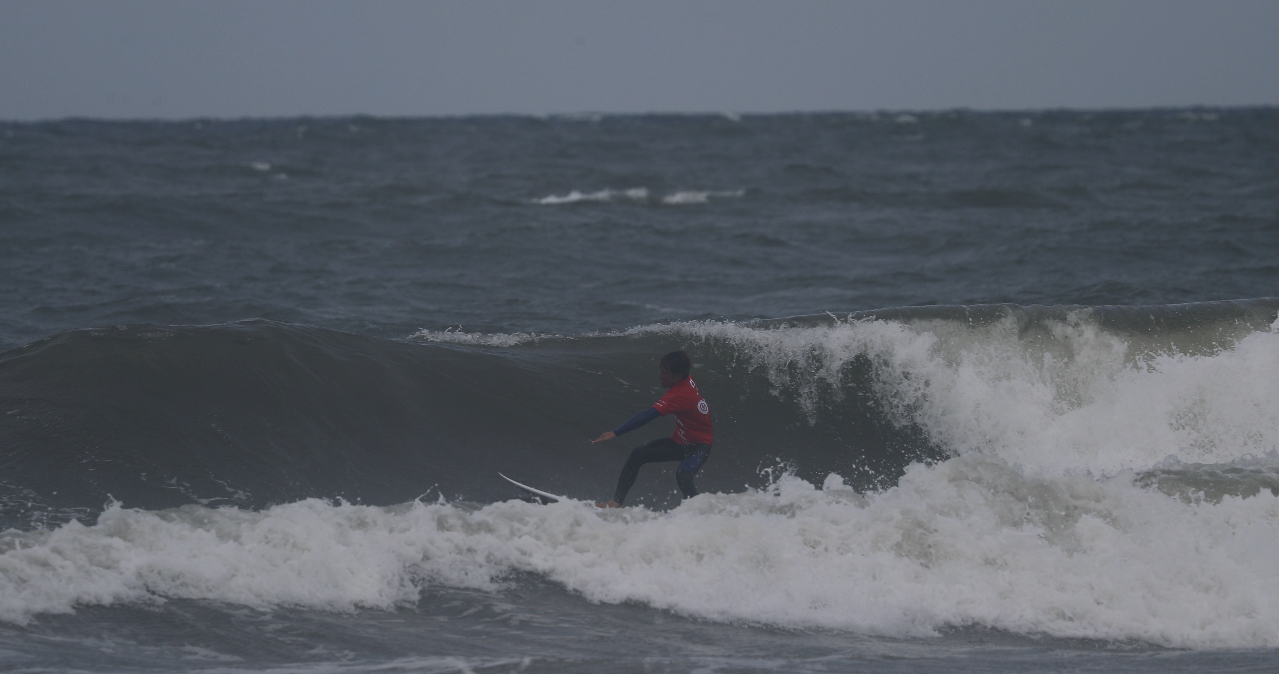 深いボトムターンから際どいリップセクションへ縦にアプローチし、当て込んでフィンズフリーしながらも、北寄りのサイドオンショアによって予想以上にシフトしてくるリップセクションの変化を見極めたかのごとく急遽ボードを大きく180°返して体の真下にホールドしつつ、そのままリップセクションをドリフト気味にパワースライドして仕上げてきたこの1発。