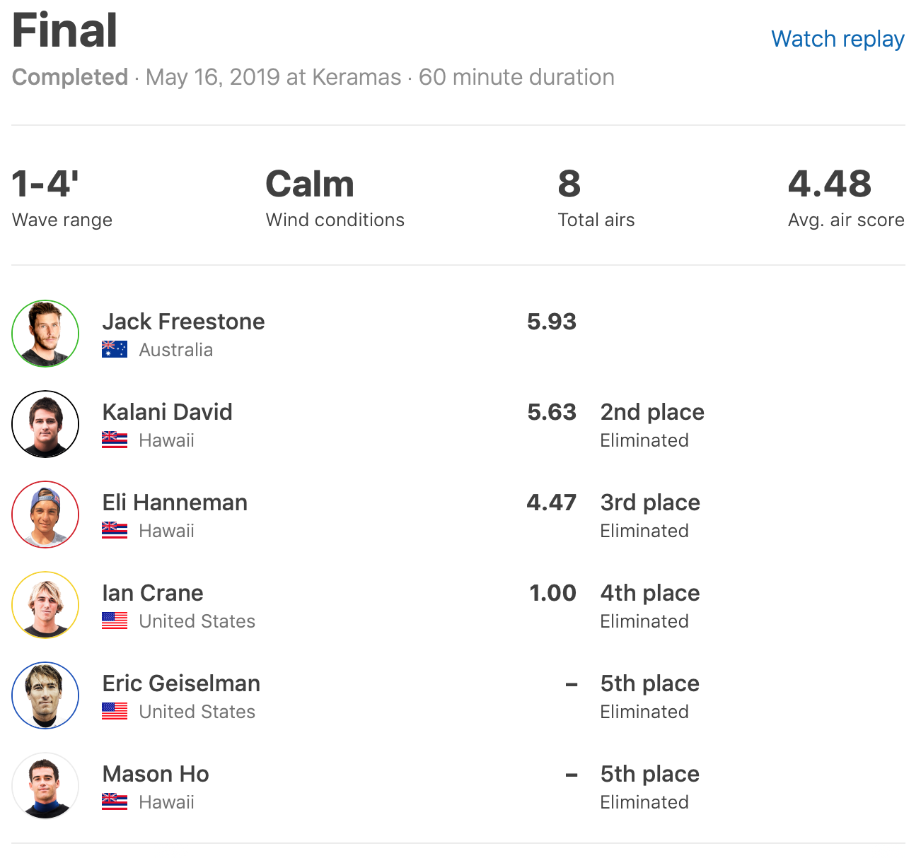オーバーヘッドのクリーンなコンディションの中、ファイナルはEli Hanneman、Ian Crane、Eric Geiselman、Jack Freestone、Kalani David、Mason Hoの6名によって行なわれ、ボトムの危険なセクションにランディングする完璧なエアリバースをメイクしたJack Freestoneが、高さのあるビッグ・アーリーウープをメイクして5.63ptを叩き出したKalani Davidを抑えて見事優勝を果たした!!