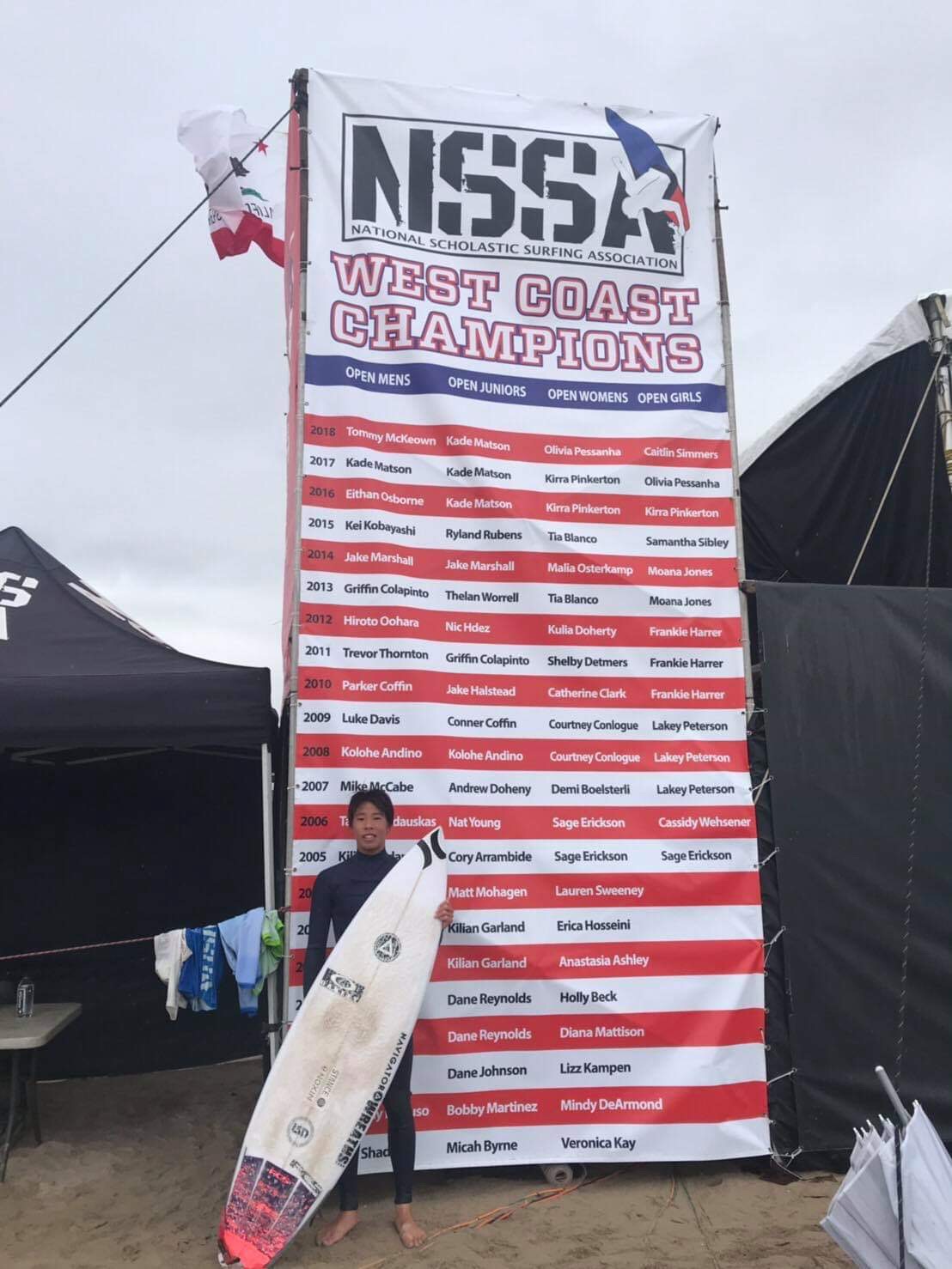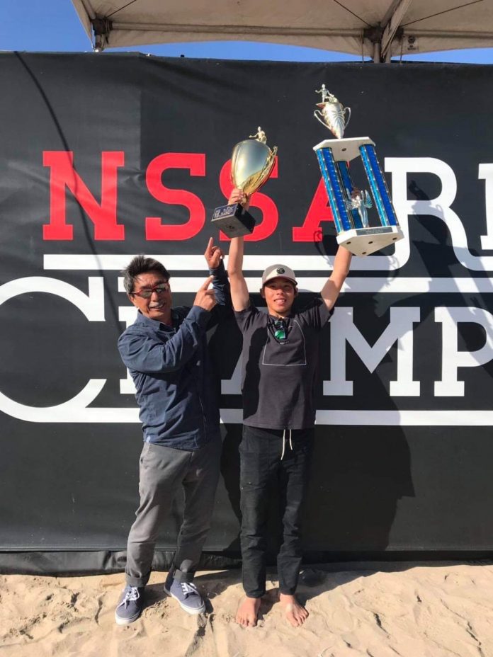 「終了間際の第逆転劇でした。海から上がってきてからの優勝のコールでした。以前、安井拓海がNSSA National ChampionshipsのEXPLOROR BOYSクラスでSeth Monizを破って優勝した時も、海から上がってきてジャージを脱いだ後に優勝のコールが発表された瞬間を思い出しました。1996年からの歴代優勝者の名前が載っているNSSAのバナーに天獅の名前が載るのは大原洋人も含めて23人目です。そのうち6人がCT入りしています。」