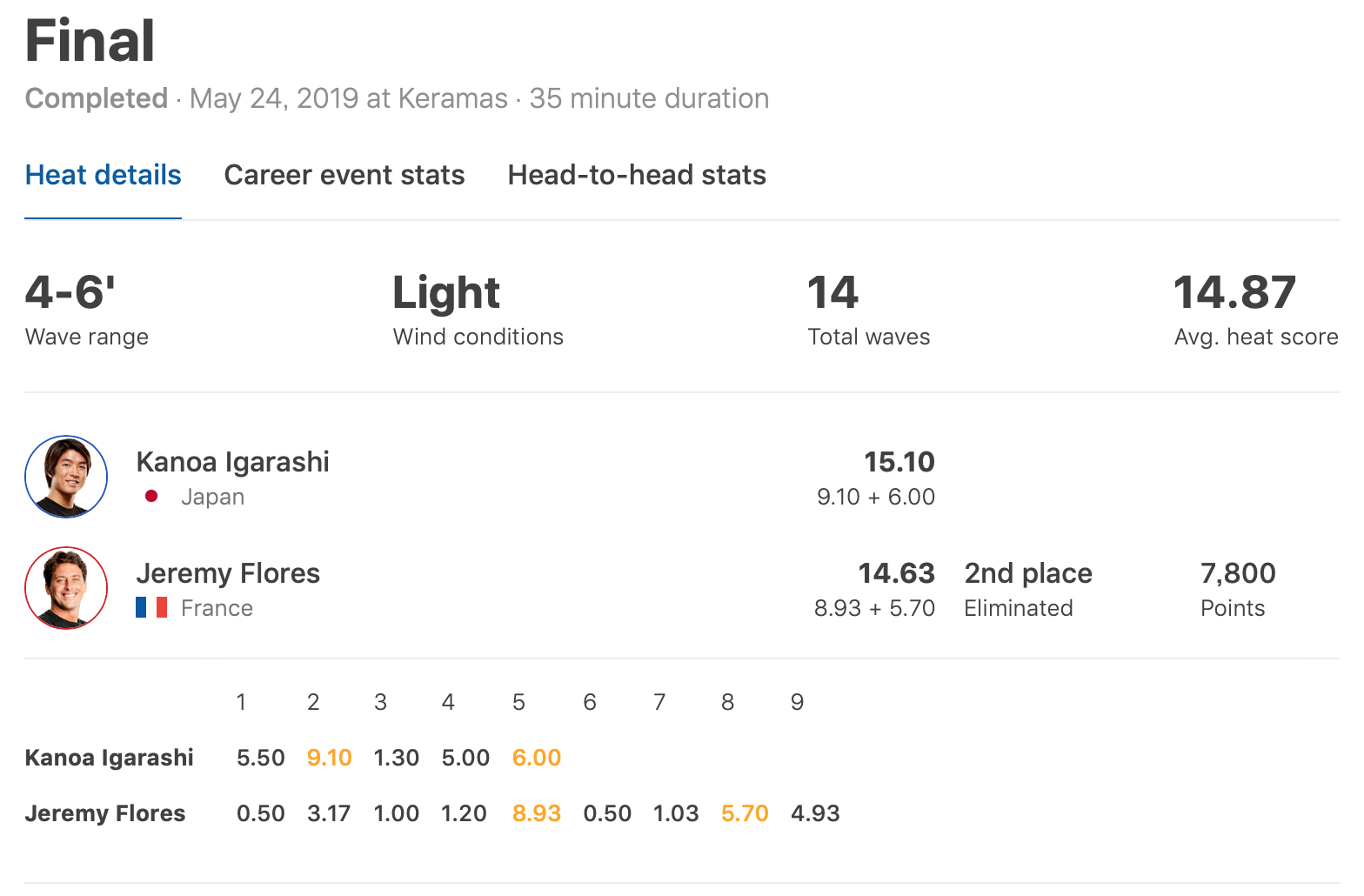 早くもコンビネーション・シチュエーションに追い込まれたJeremy Floresも、5本目に8.93ptのエクセレントスコアを叩き出して逆転に必要なスコア6.18ptまで詰め寄ったものの、五十嵐カノアがリードを図った状態で試合終了。