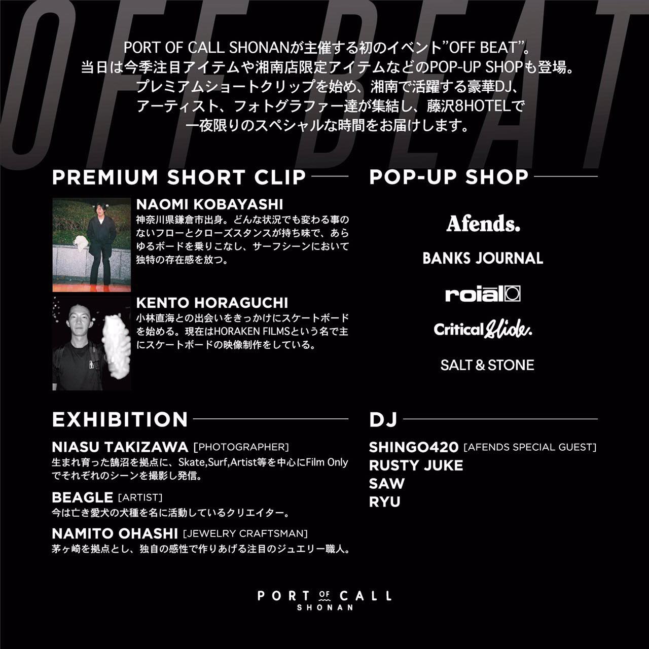 6/8(土)19:00より、藤沢8Hotelを会場にPORT OF CALL湘南主催イベント”OFF BEAT”が開催されることが決定!