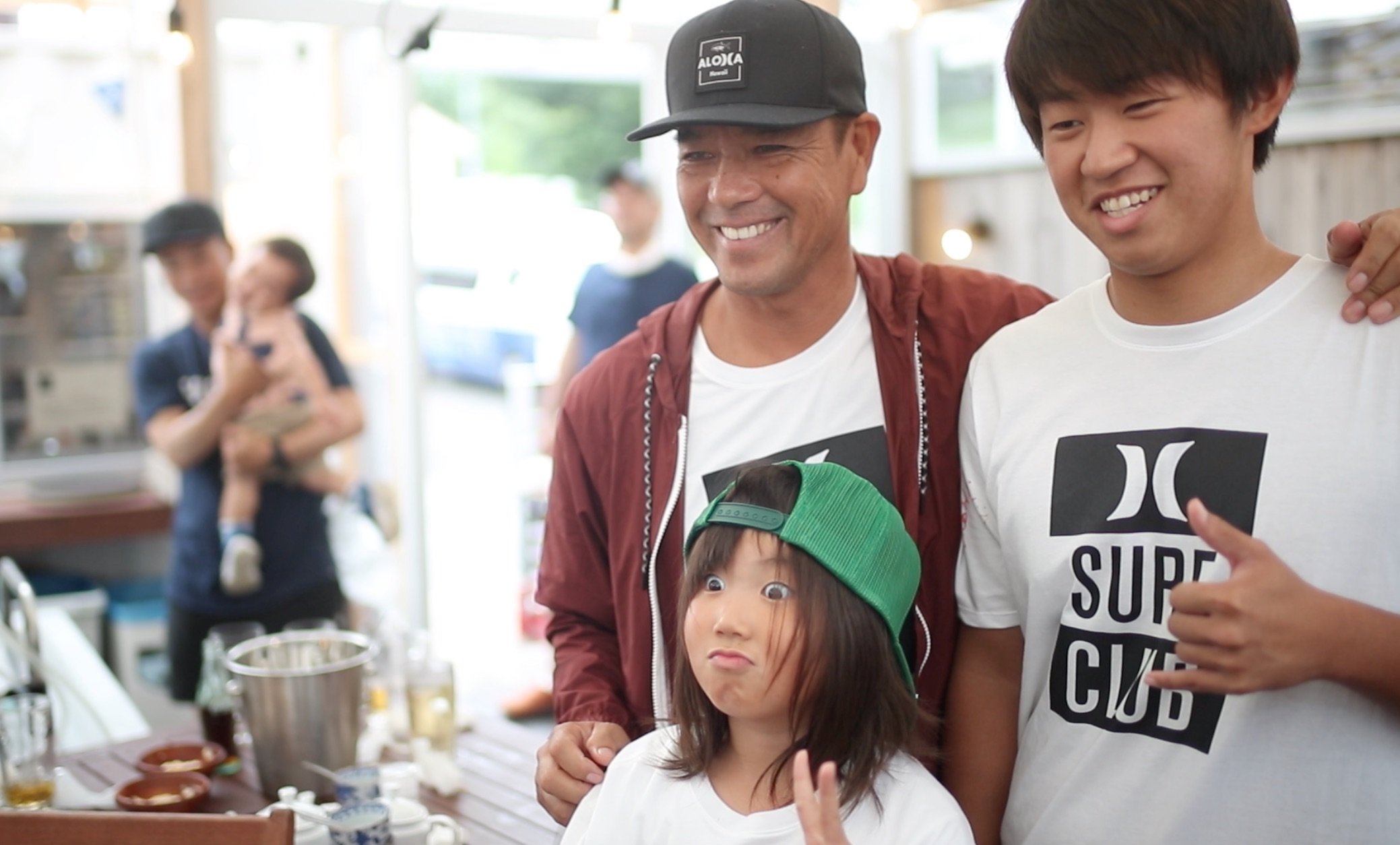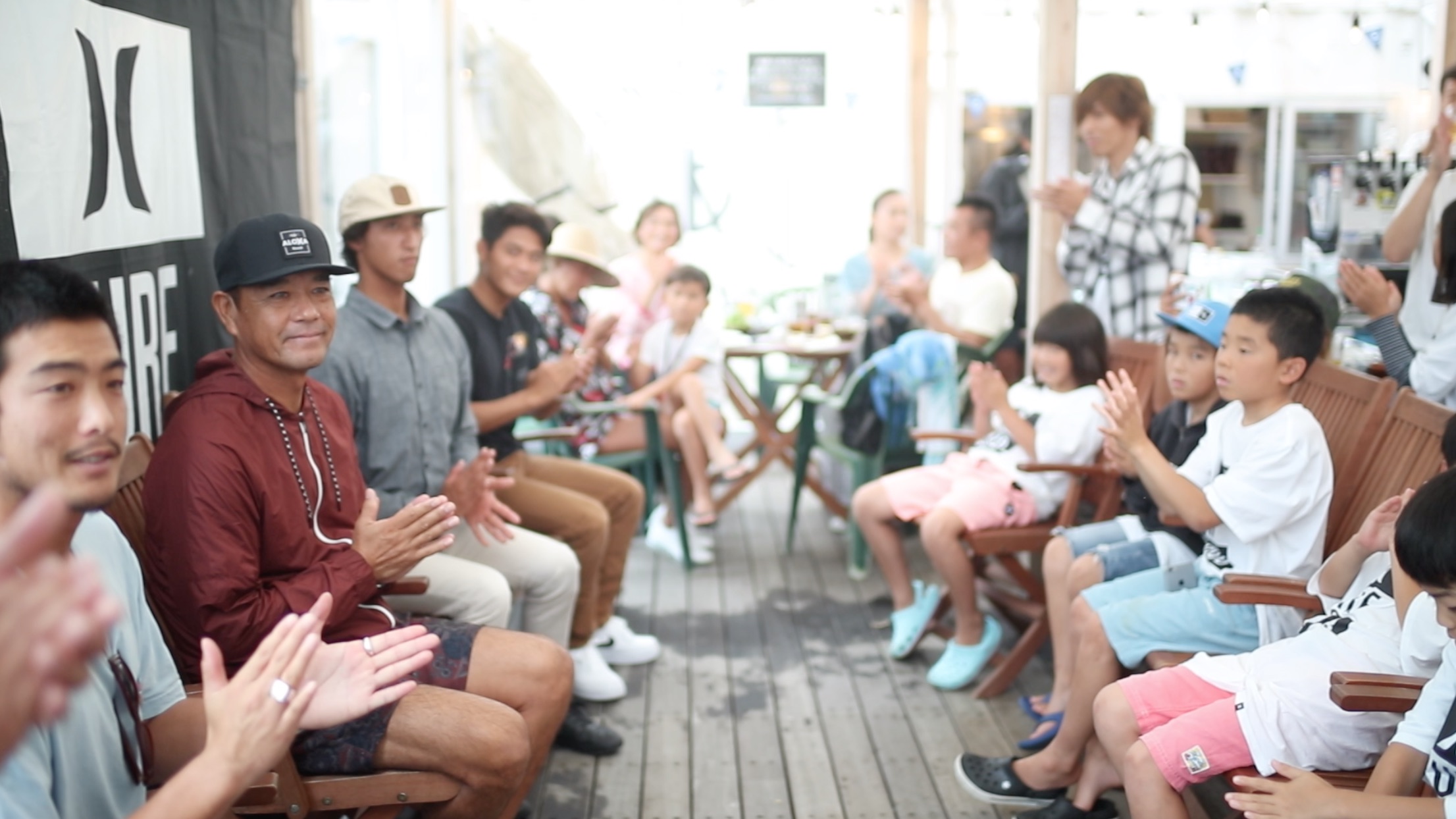 イベント当日はHURLEYプロライダーの大橋海人、河村海沙、田中大貴と共に、なんと日本が世界に誇るスーパーレジェンド・サーフスター糟屋修自プロも来場!