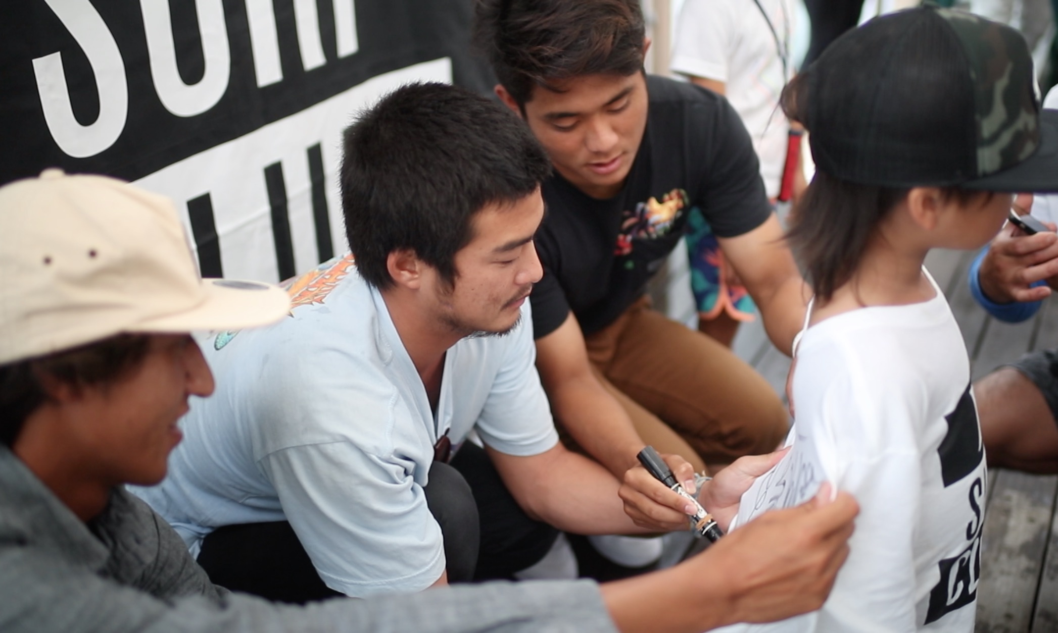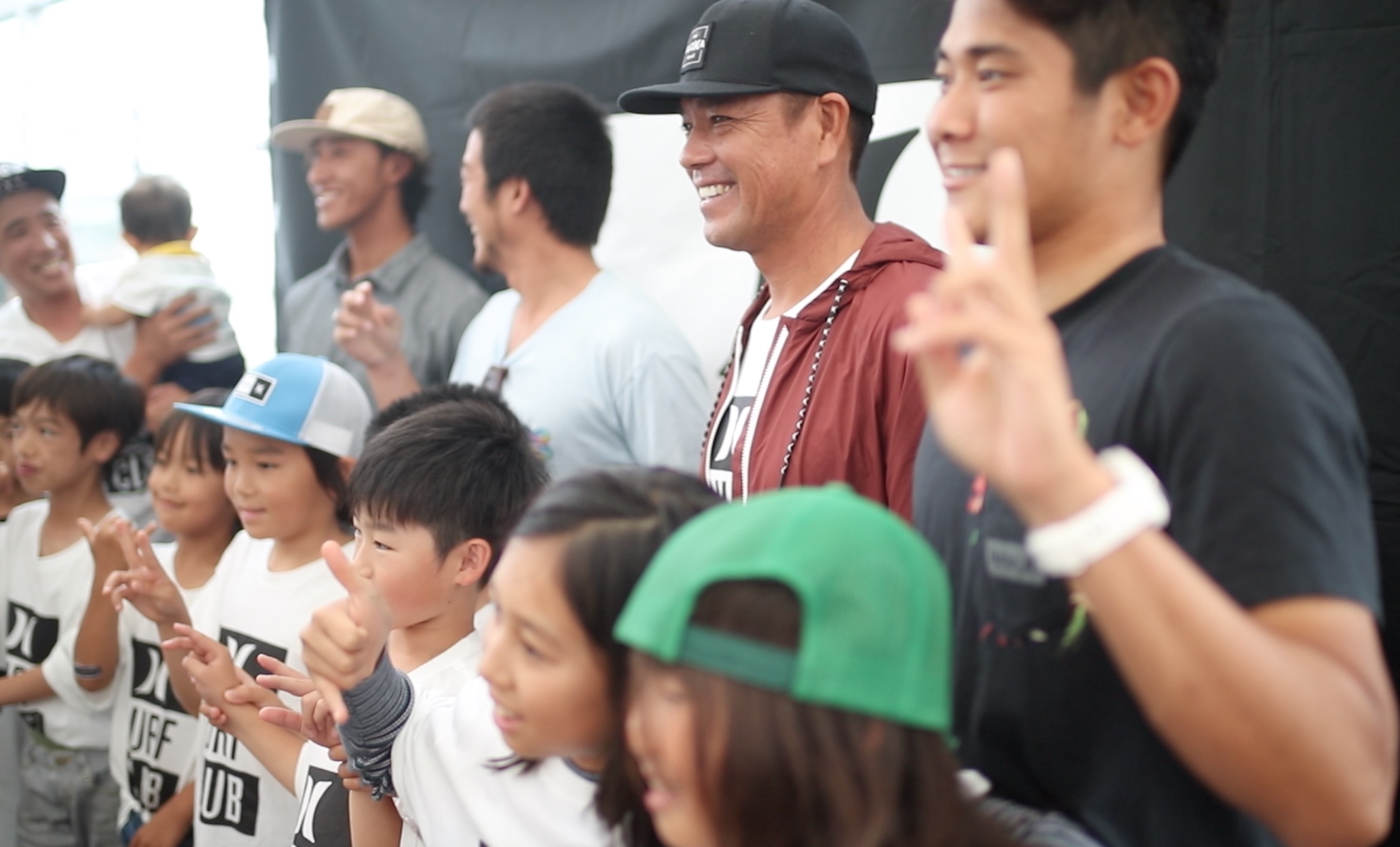 前日の天気予報では雨の予報となっており、開催すら危ぶまれる状況の中、地元の海で普段見ることができないトッププロサーファー達と過ごせるこの日を楽しみに待ち受けていたキッズサーファー達の期待に応えるかのごとく、曇り空ながら大雨にはならず、しかも小ぶりながら予想以上にサーフィン可能な波にも恵まれた中でイベントはスタート。