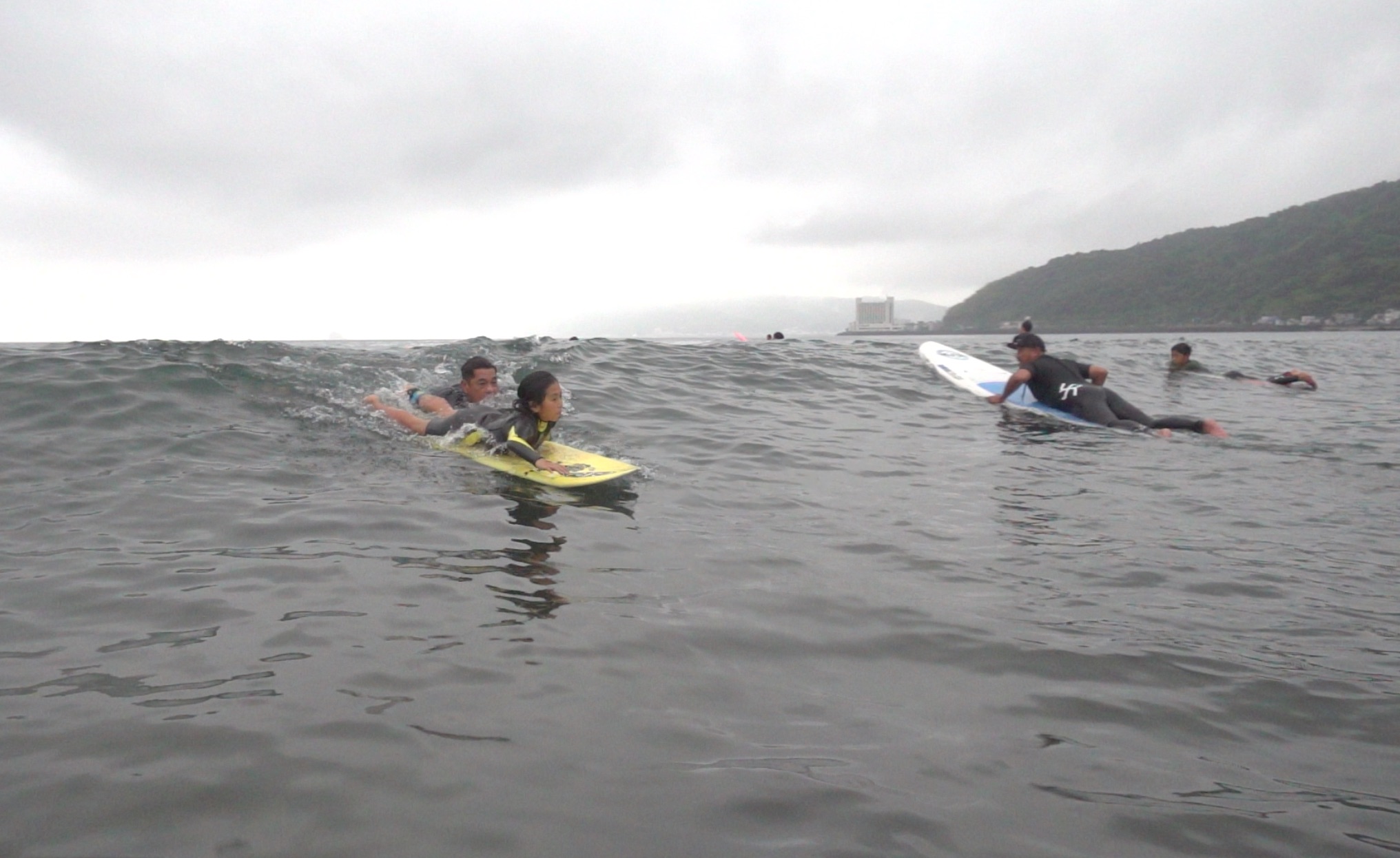 フリーセッションが終わると、今度はHURLEYプロライダー達が先生となり、ビギナーキッズ向けのプッシュサーフィンスクールがスタート。