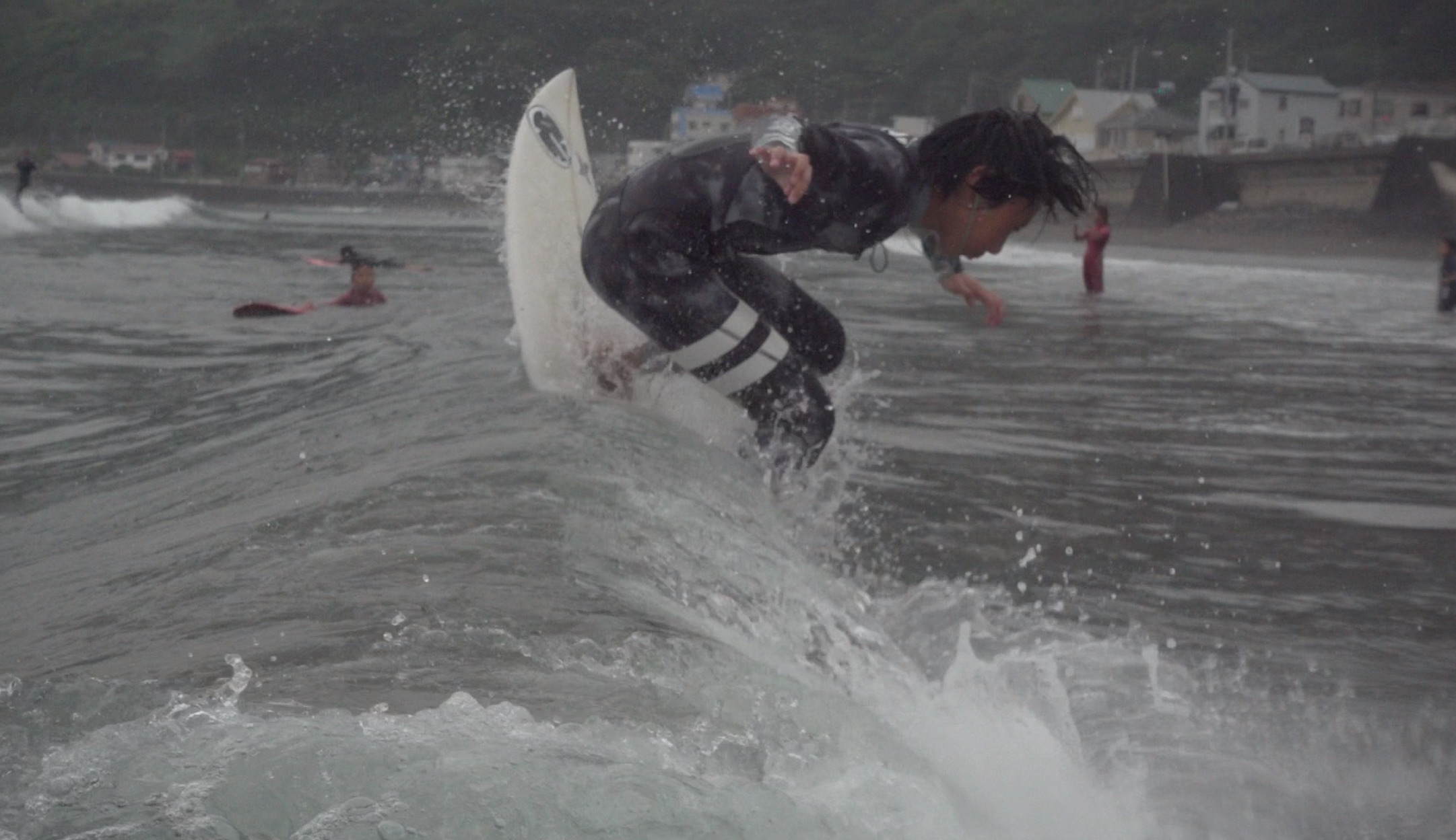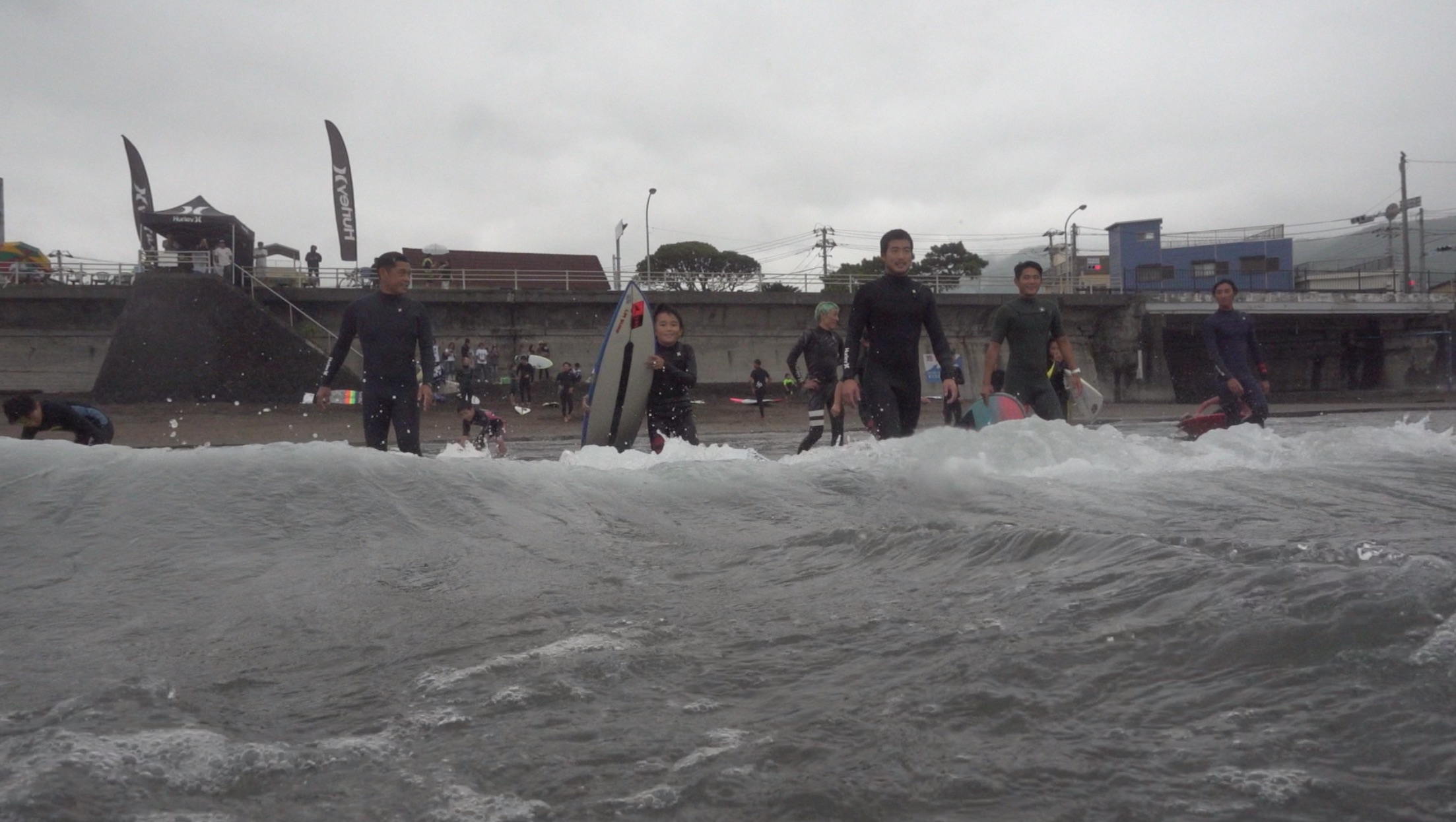 宇佐美のビーチ中央のビーチブレイクで行われたフリーセッションでは、セットで腰あるかないかくらいの極小波となったが、時折入るセットは形がよく、同じ海の中から間近で観るプロサーファー達のライディングにクギ付けとなるキッズサーファー達。