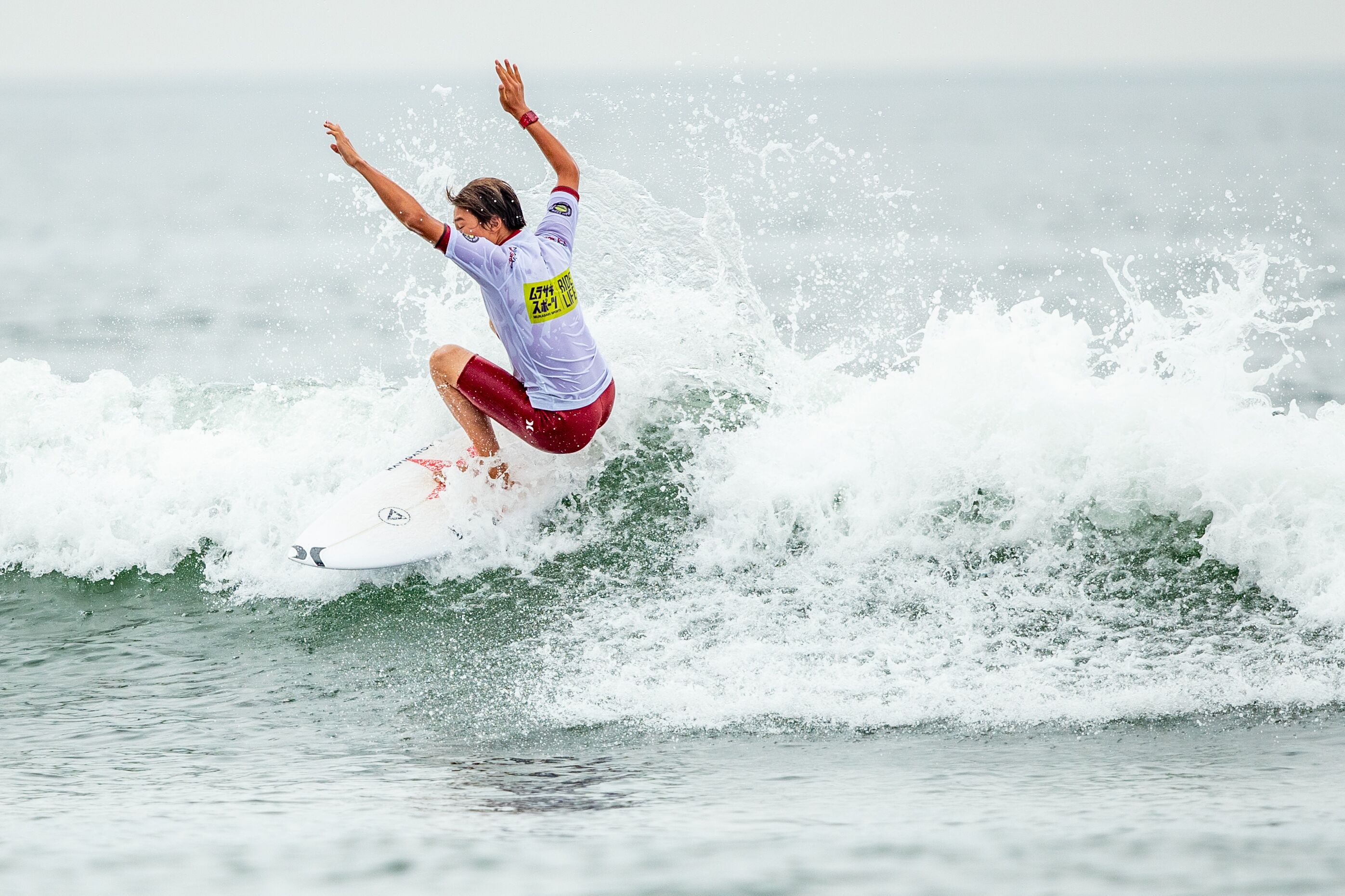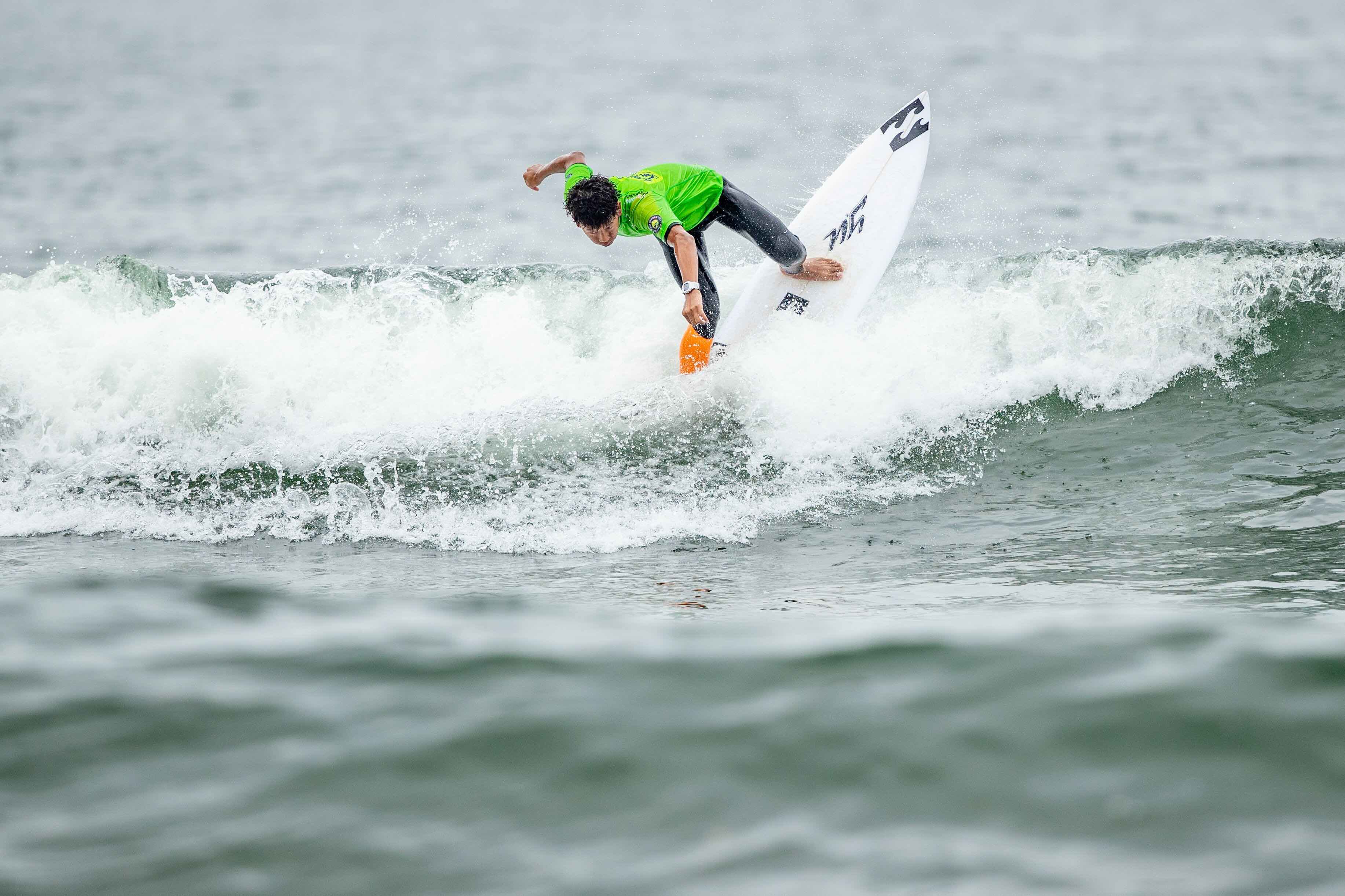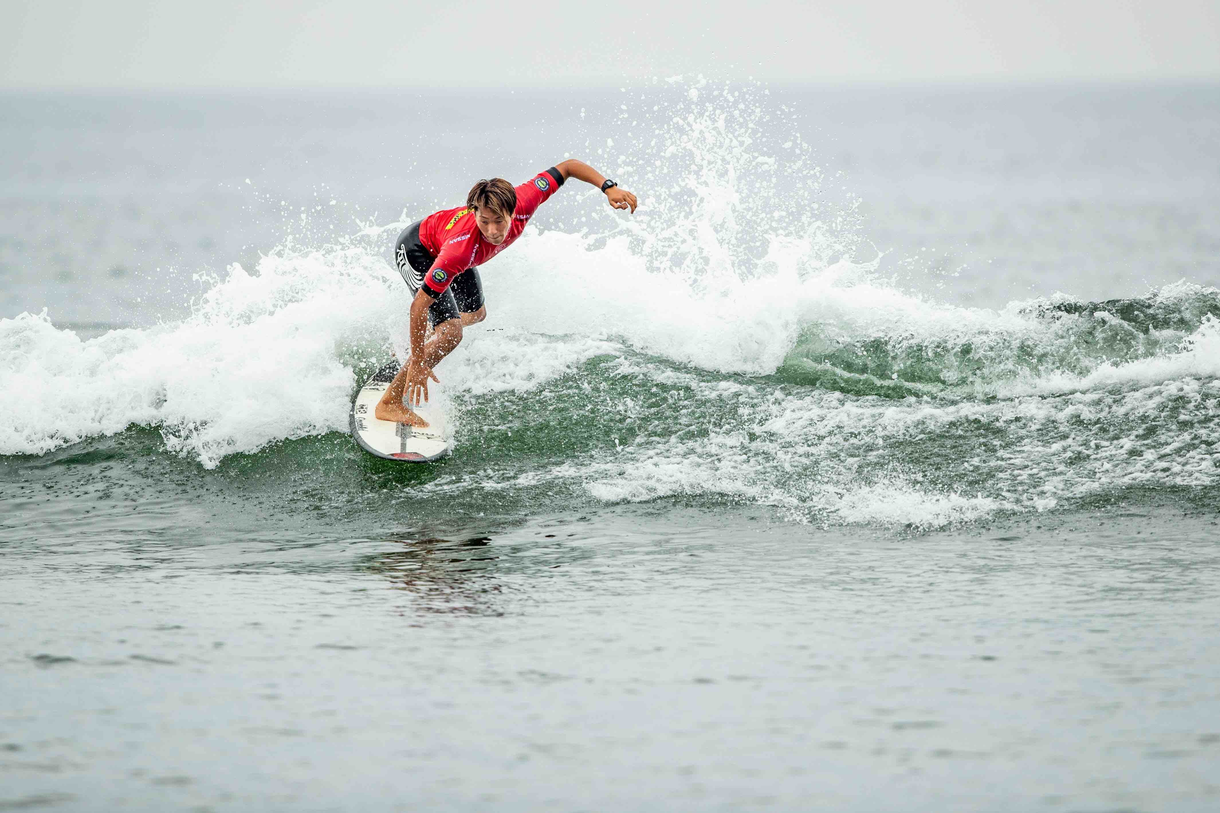 全米チャンピオンの肩書きを持ち、すでにプロサーファーとしても活躍する岩見天獅。間違いなく数年後の日本のサーフシーンのトップ・オブ・トップに立つに違いない存在。このプアなコンディションでもしっかりと2本まとめて2位でラウンドアップを果たした。Tenshi Iwami.