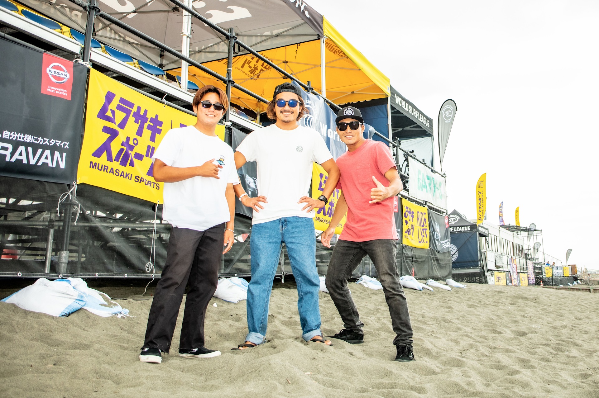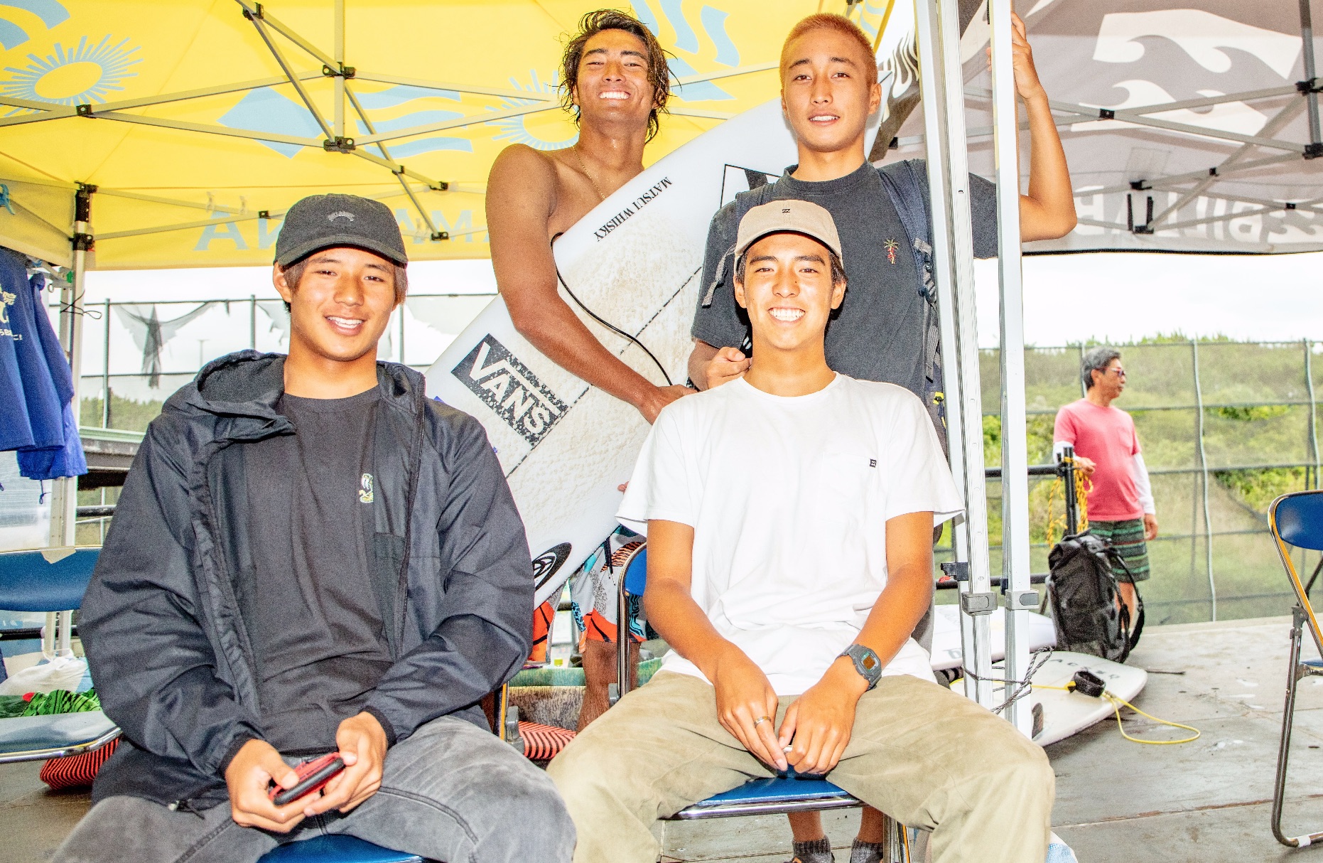 今回もまたコンテストMCをつとめるべく一時帰国を果たした田嶋鉄兵。プロとして培ってきた知識をわかりやすく解説するという、簡単なようで意外と難しいことでも難無くこなしてしまうオンリーワンなサーフスターのひとり。貴重な村田嵐、田中英義との3ショット。Arashi Murata, Hideyoshi Tanaka & Teppei Tajima.