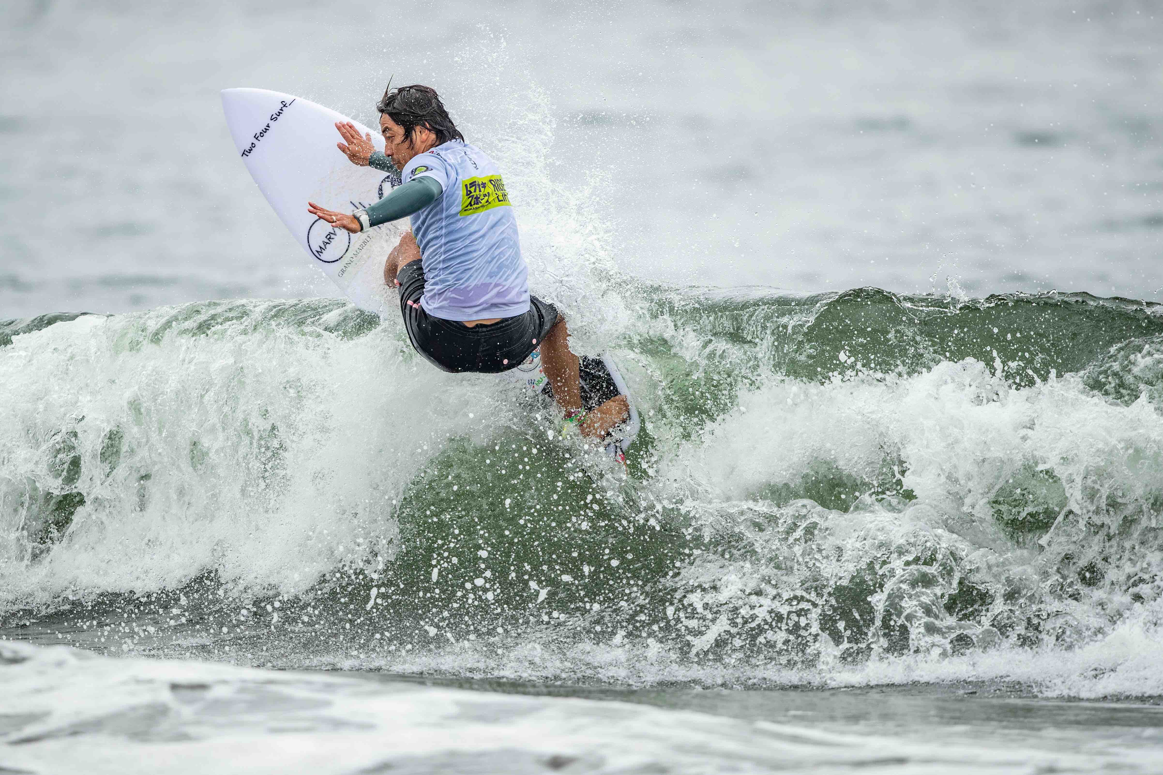 小波用マジックボードであるHammo surfboardsの最新EPS素材TECH FLEX製FIRE BALLモデルで、湘南の極小波でもぐんぐん加速を得てアクションを繰り出し、見事ダントツのトップ通過を果たした小川幸男。Yukio Ogawa.