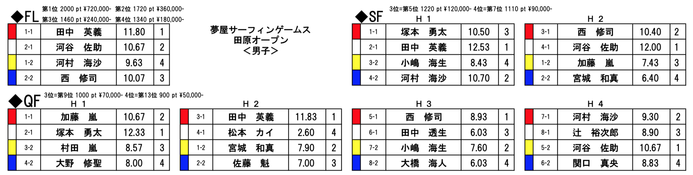 台風からの波をサイズダウンとなったコンディションの中、MENSはベテランで歴代グランドチャンプのひとりである田中英義がその強さを見せつける形で、 WOMENSは弱冠15歳の川瀬心那が見事初優勝を遂げた!!