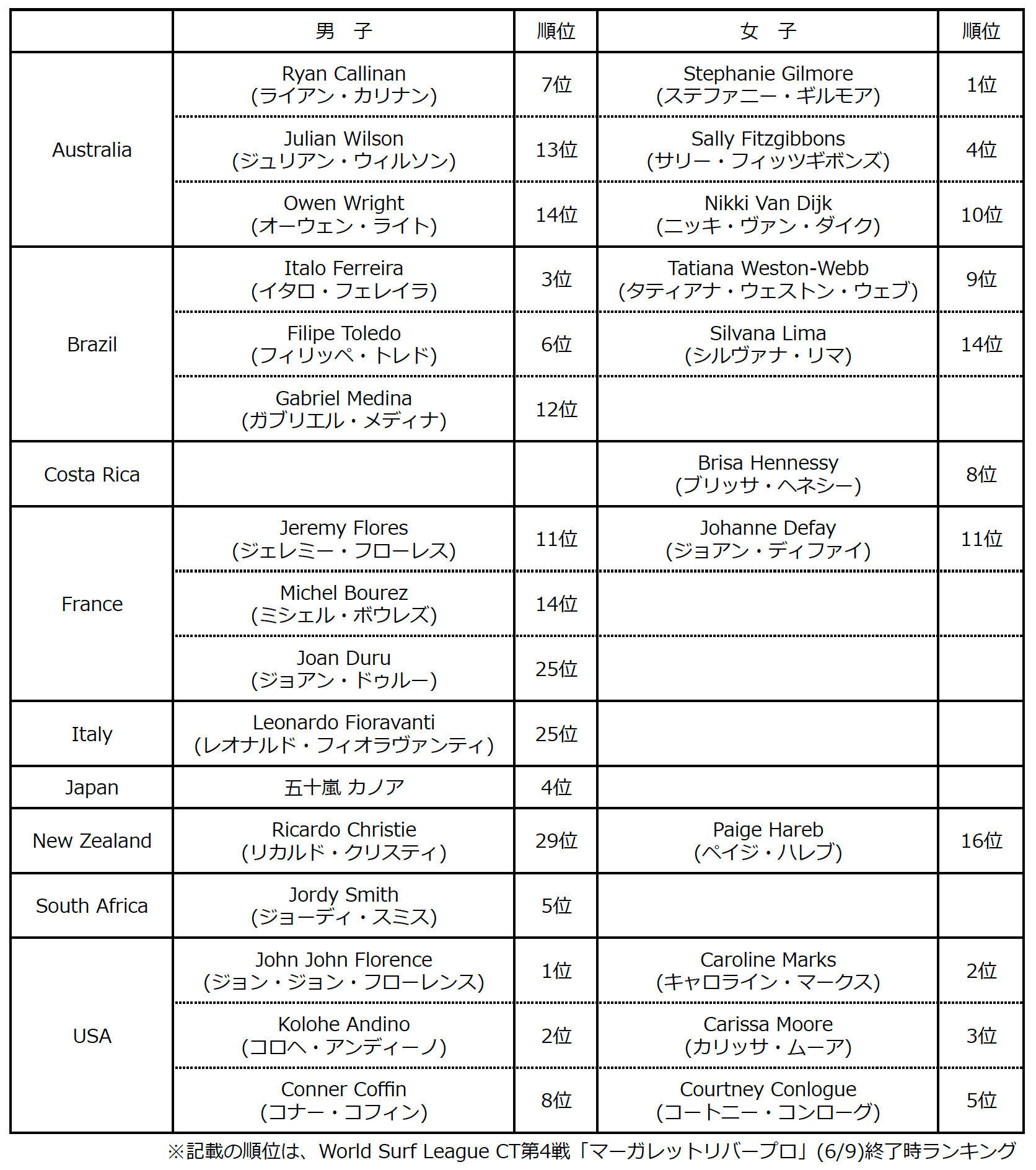 各国代表選手として今回の宮崎でのISA World Surfing Gamesに出場予定となっているCTサーファー及び元CTサーファーは下記の通り。