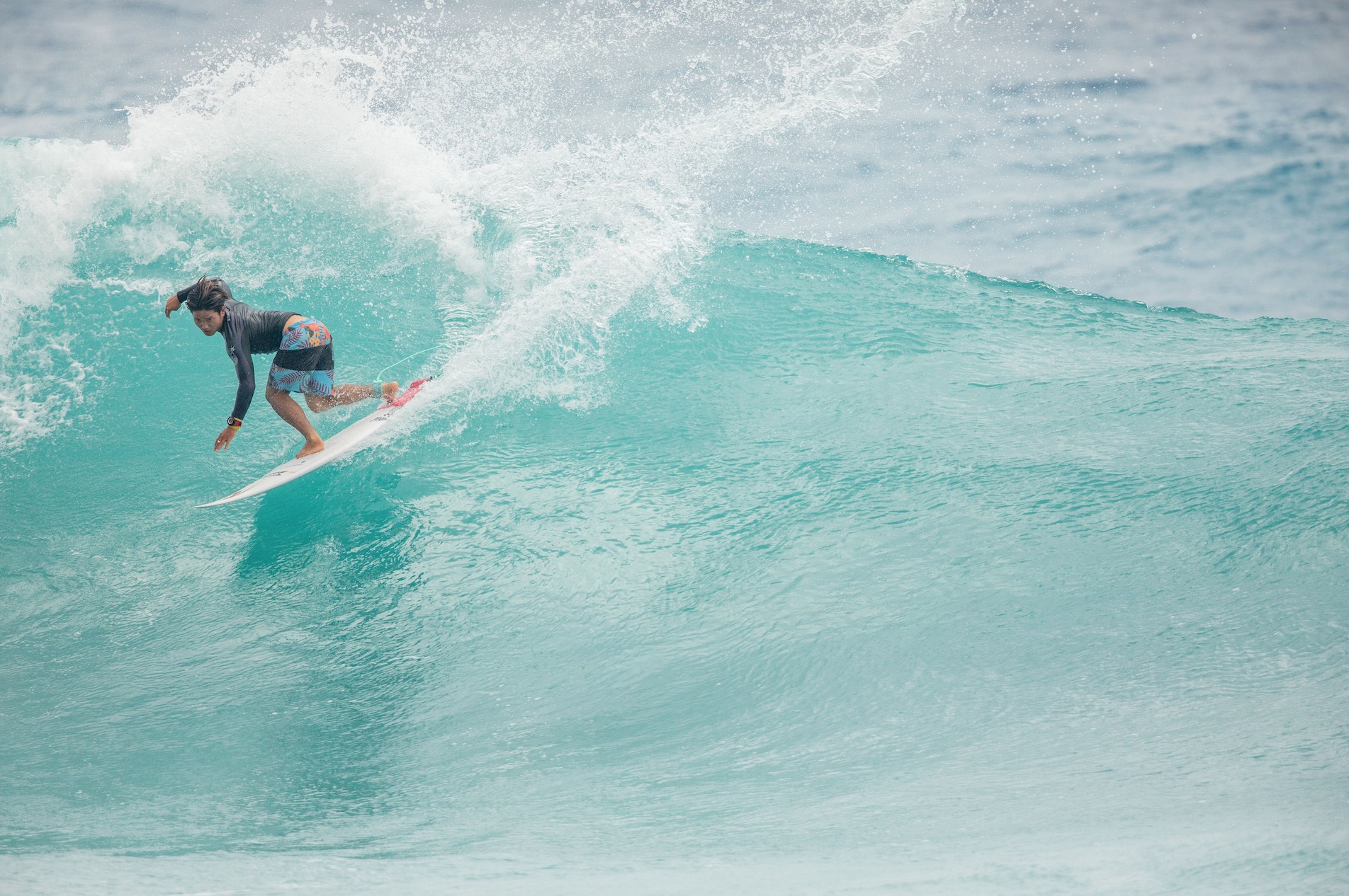 QS1500″ムラサキ湘南オープン”で見事自身初となるQS優勝を果たし、その急成長ぶりが著しい鈴木仁。一級品の波がブレイクする日本指折りの河口として知られる西湘の某所をホームとするだけに新島のパワフルな波でもソリッドなリッピングを朝飯前かのごとく繰り出す。Jin Suzuki.
