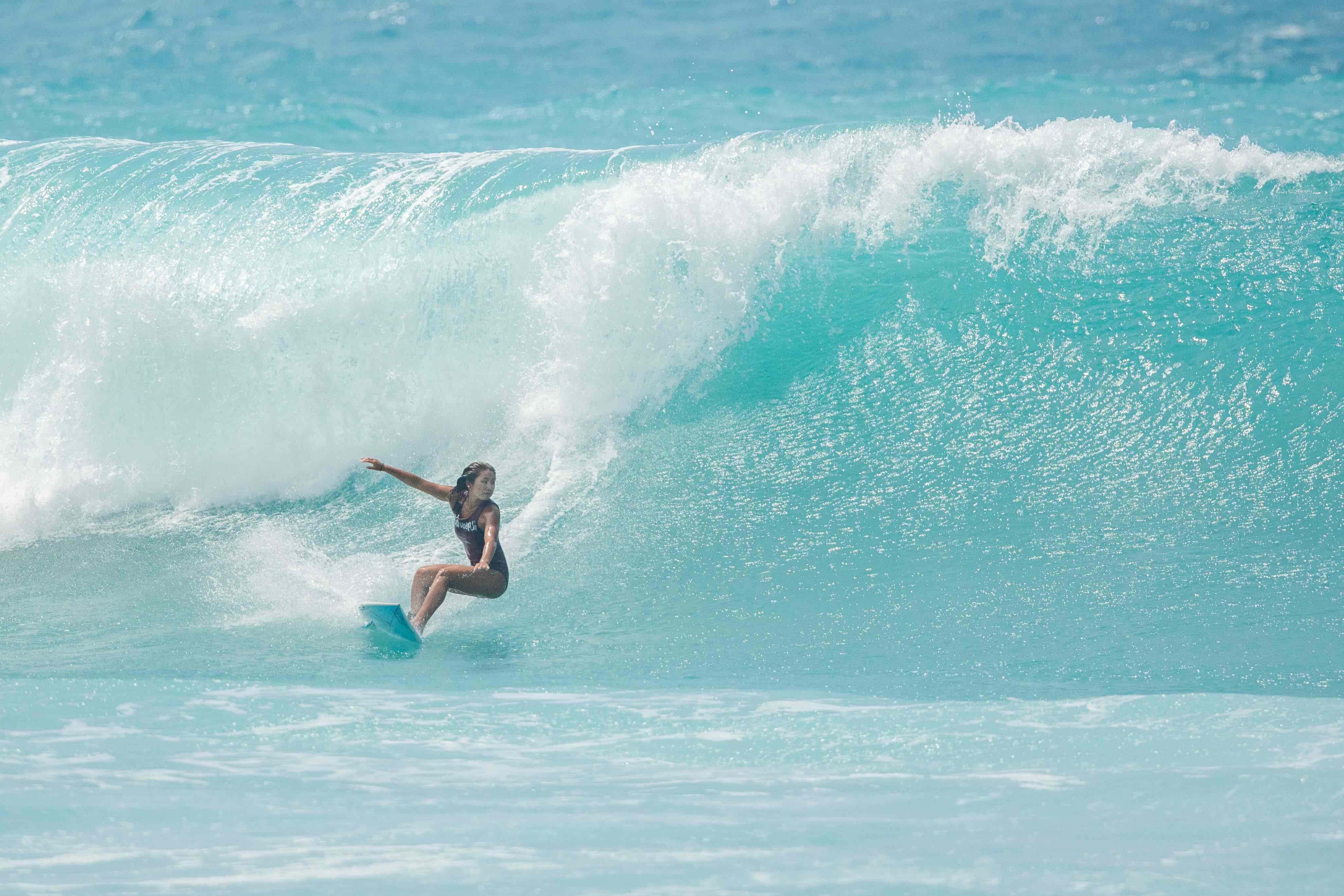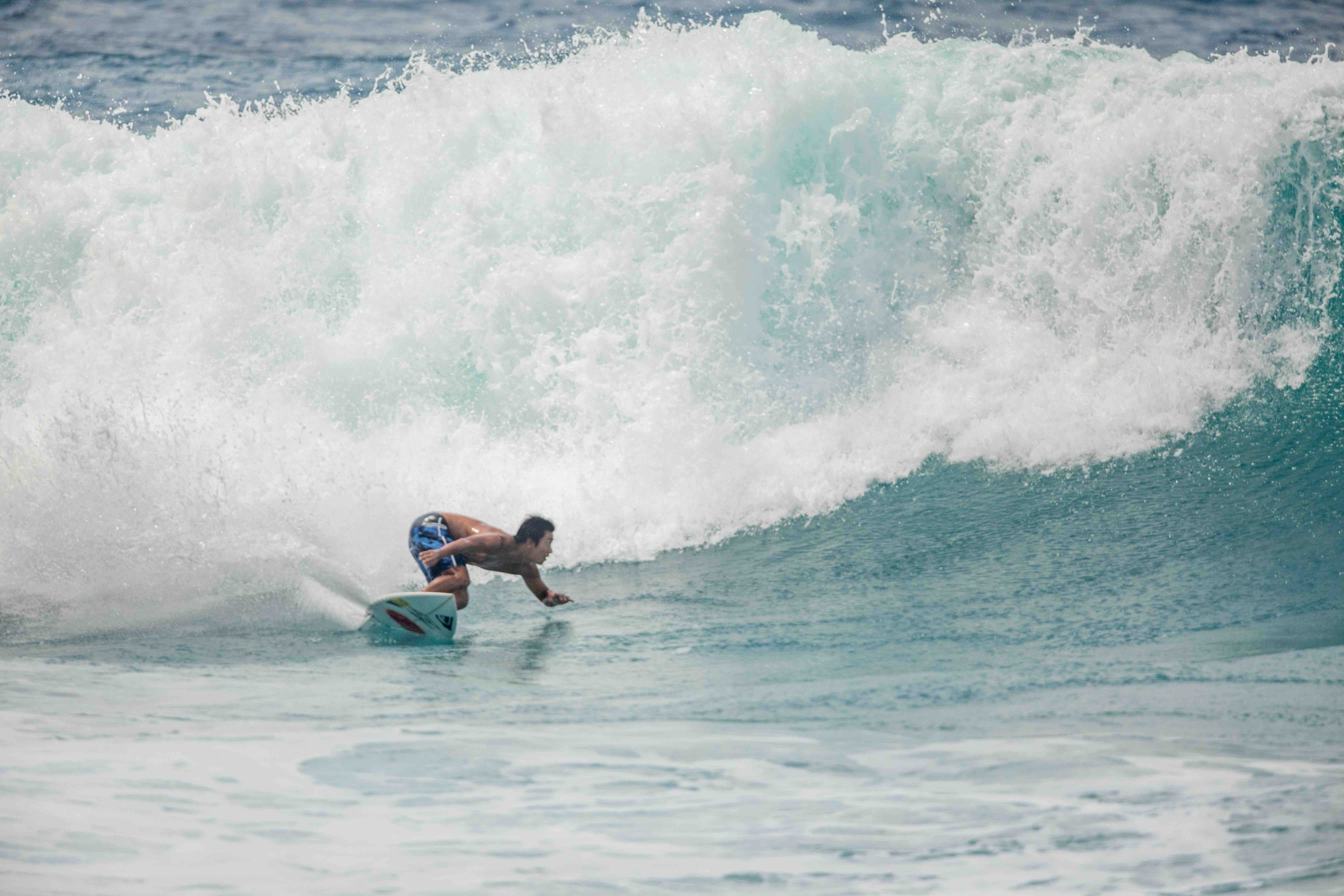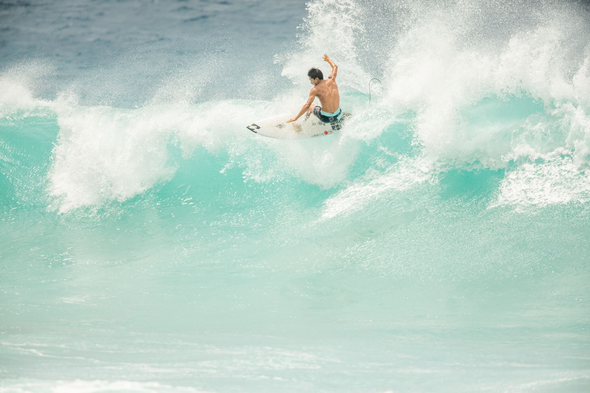 世界的なサーフィンの聖地ハワイの中でも指折りのブレイクであるサンセットを舞台とするサンセット・プロジュニアチャンプの金沢呂偉にとって、このママ下の波はファンウェイブでしかないに違いない。Roy Kanazawa.
